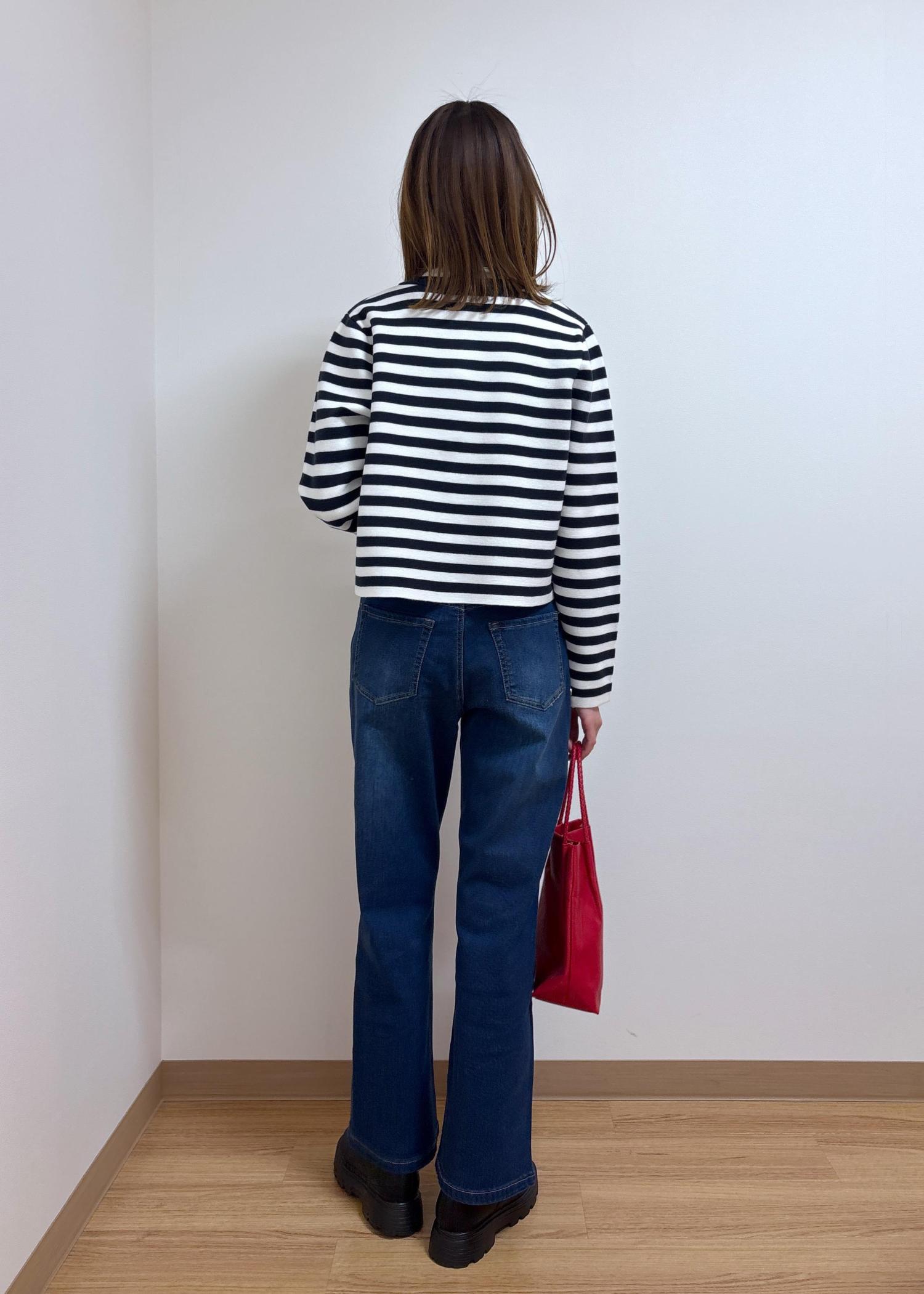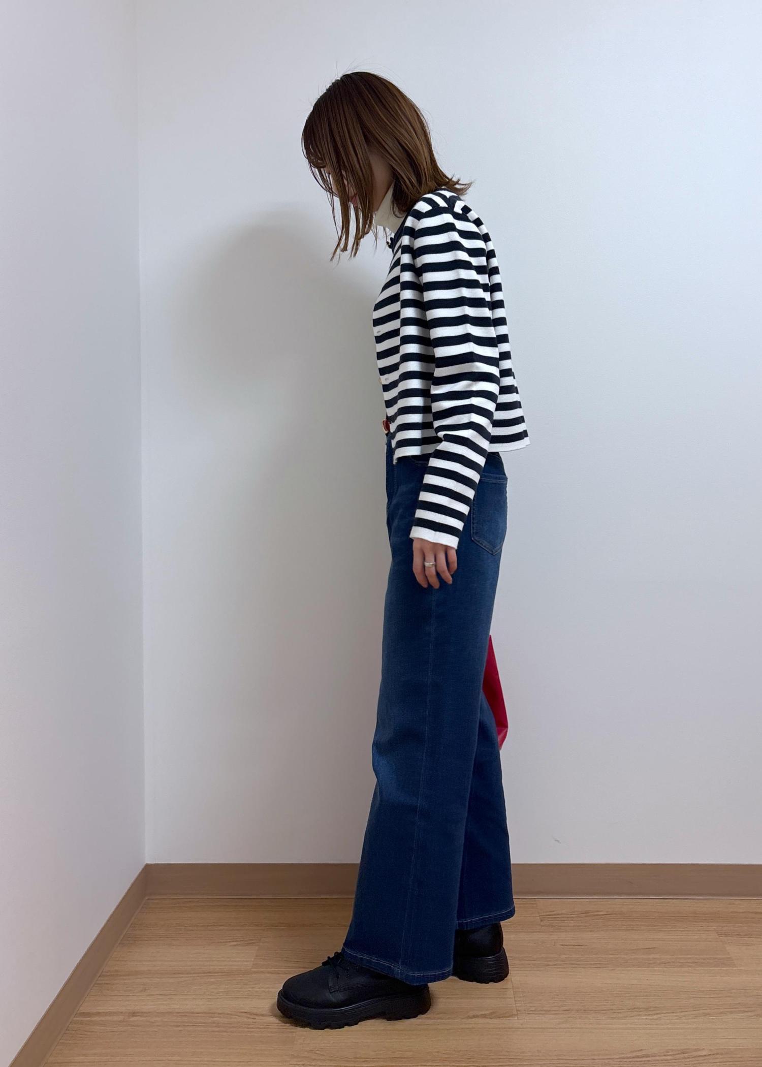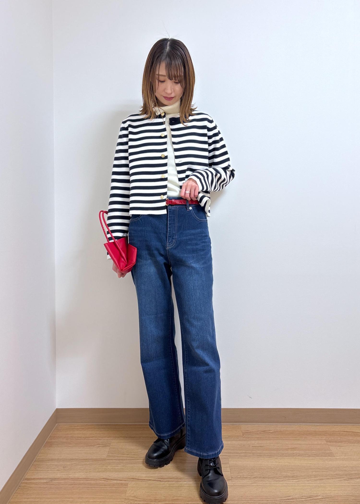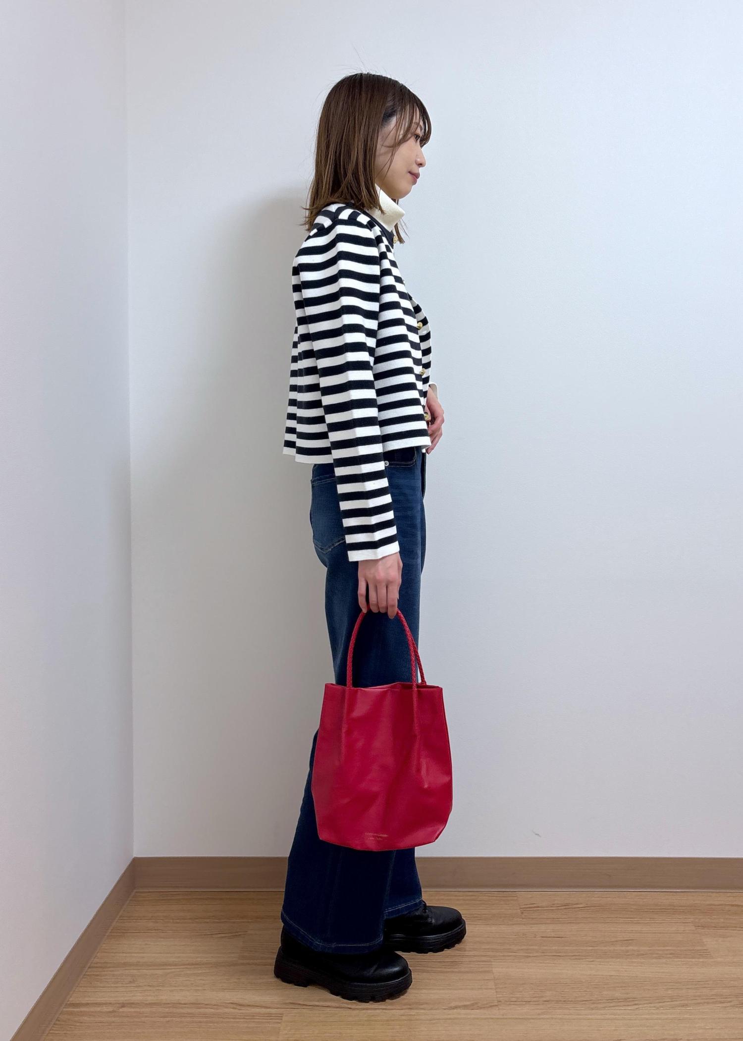 デニムとボーダーニットのシンプルカジュアルなスタイリングなので、赤い小物をアクセントにしてみました!