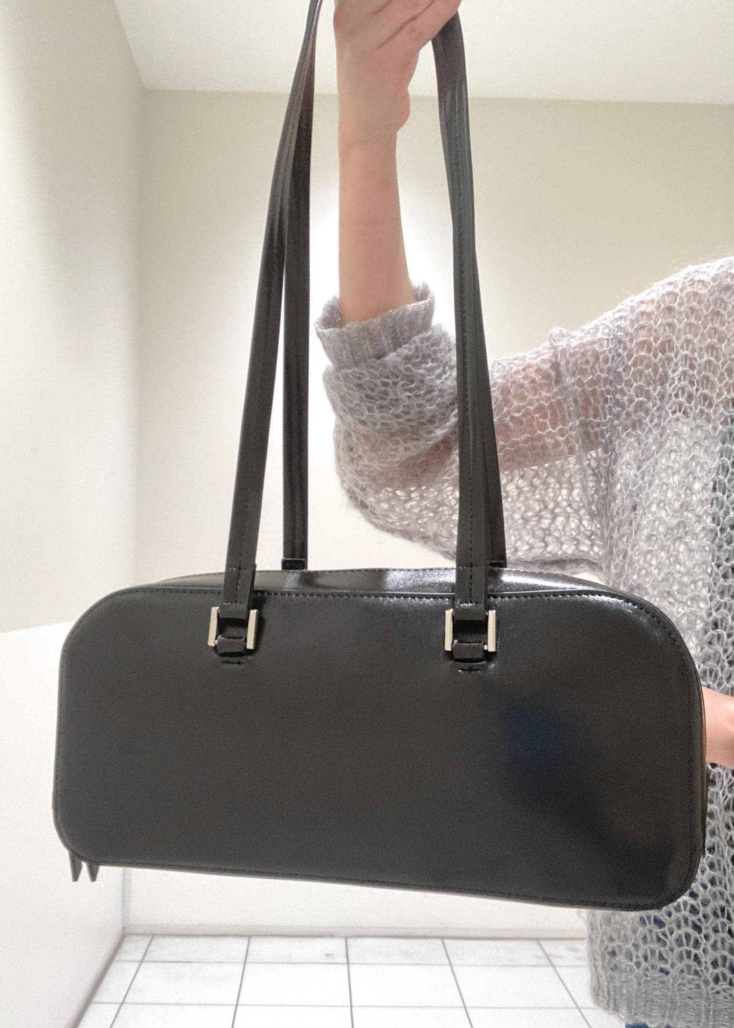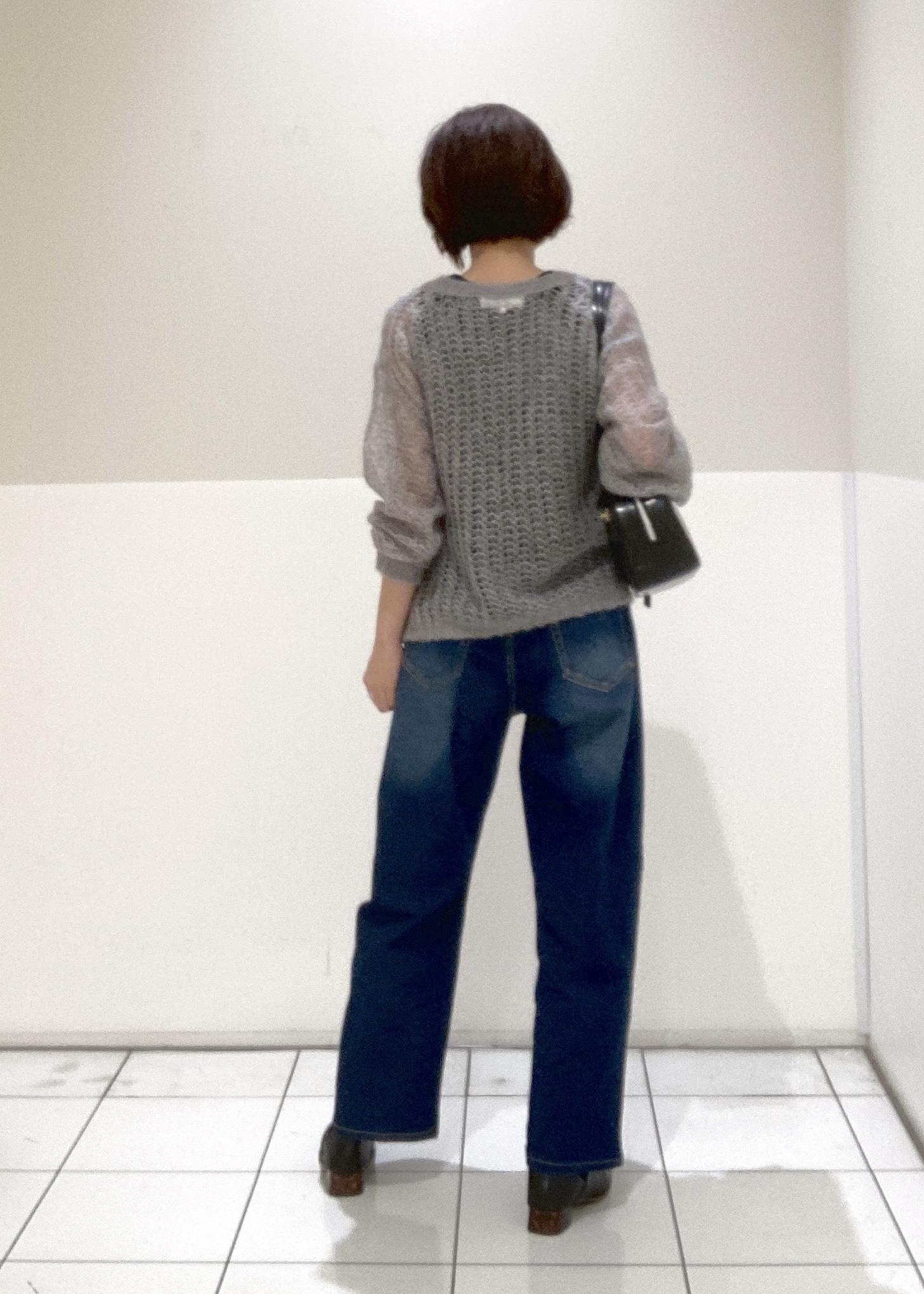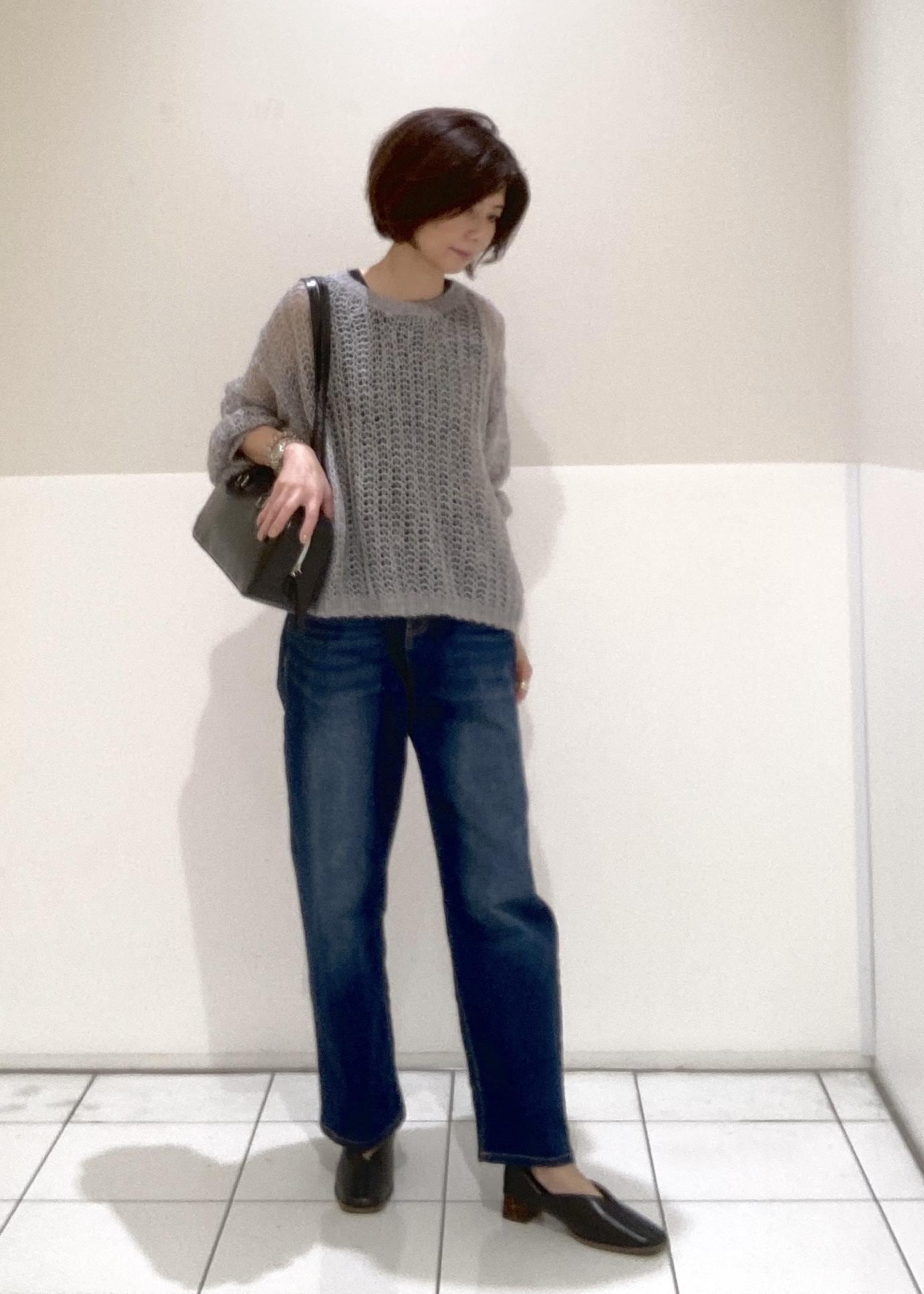 ニットを大人っぽくインディゴのデニムでコーデしました。こちらのニットは着心地も良く軽く、インナー次第で長く着られる重宝するアイテムです。バッグはトレンドの横長のフォルムのものをセレクト。シューズもバッグと色を揃えてまとめてみました。