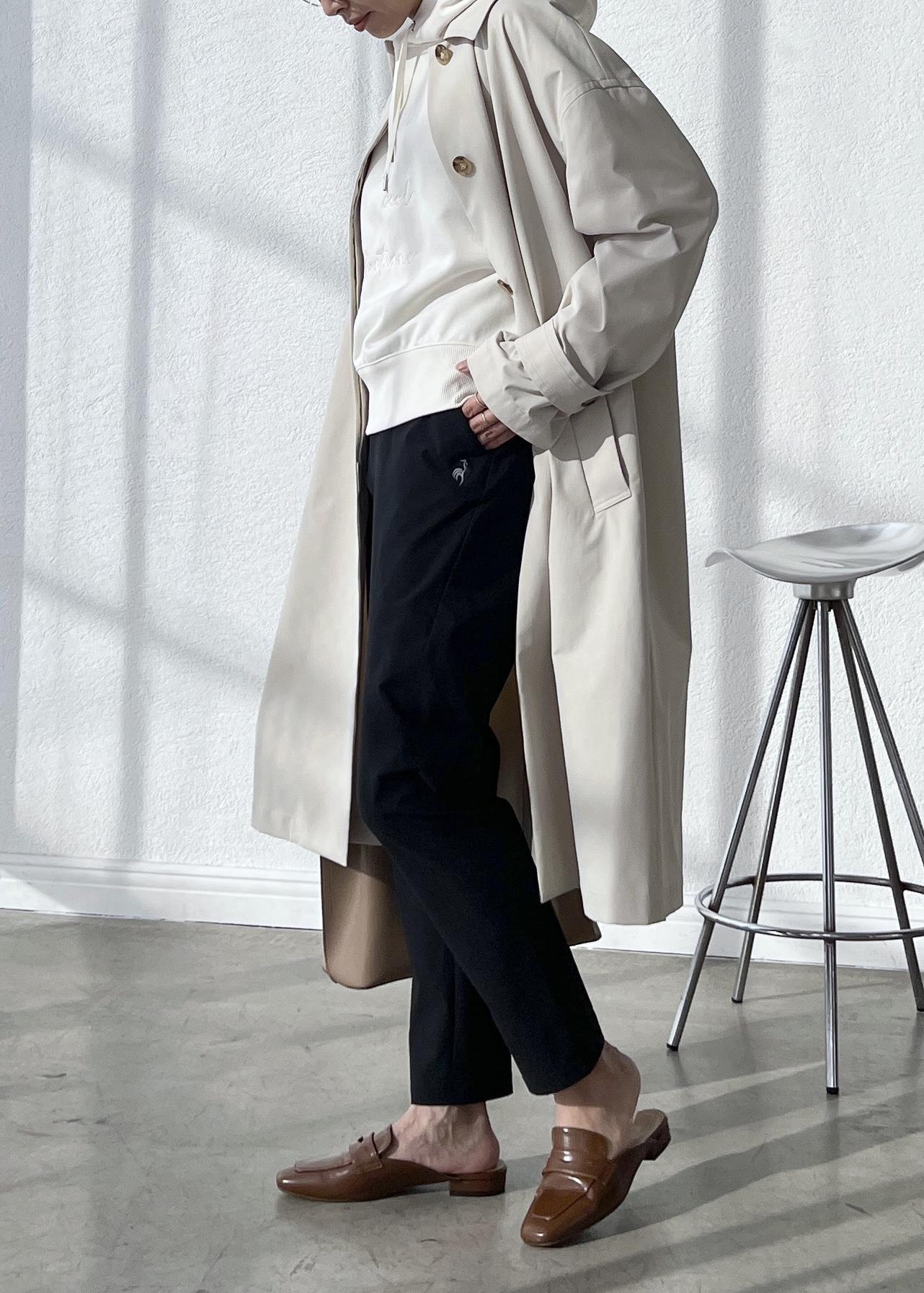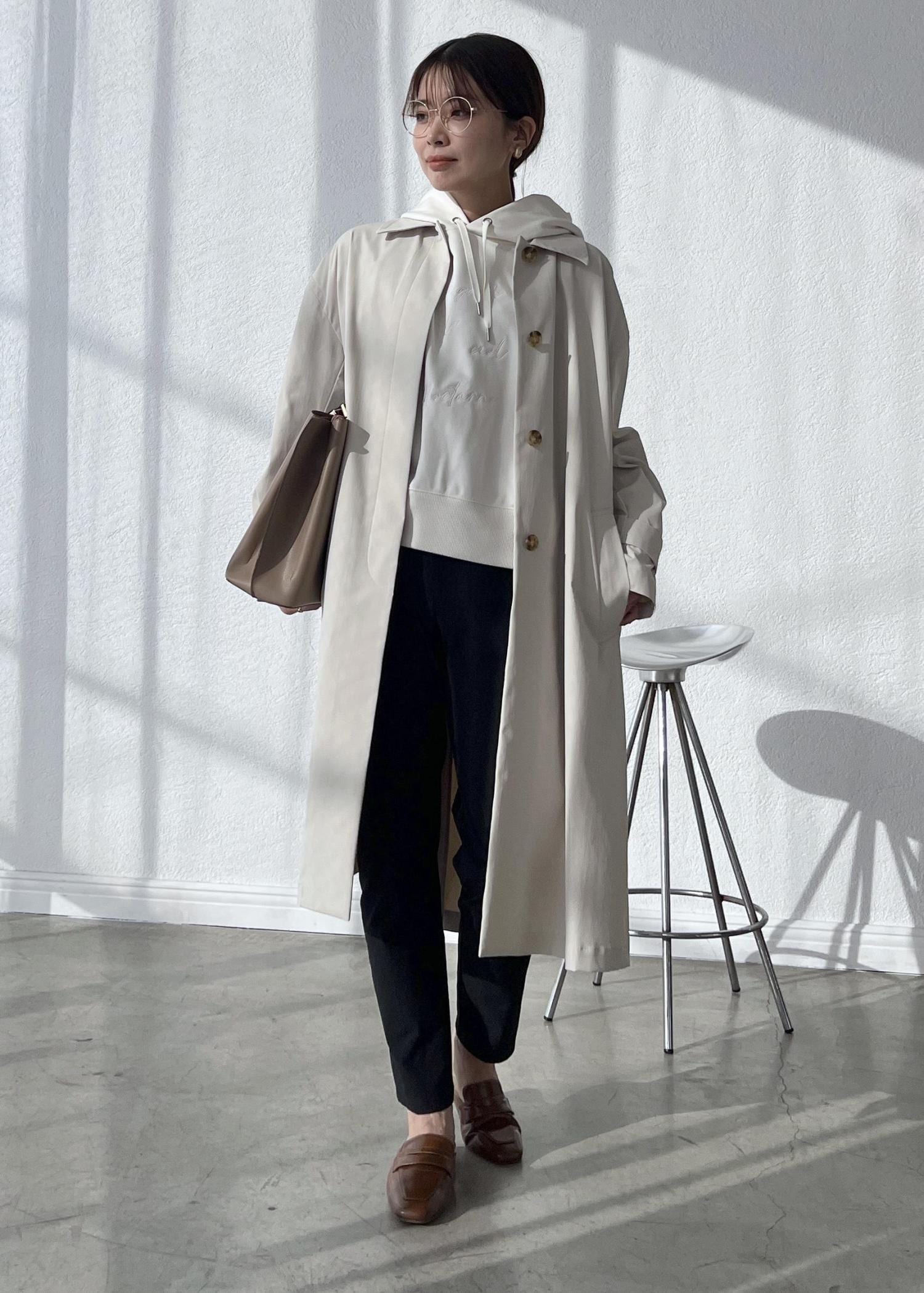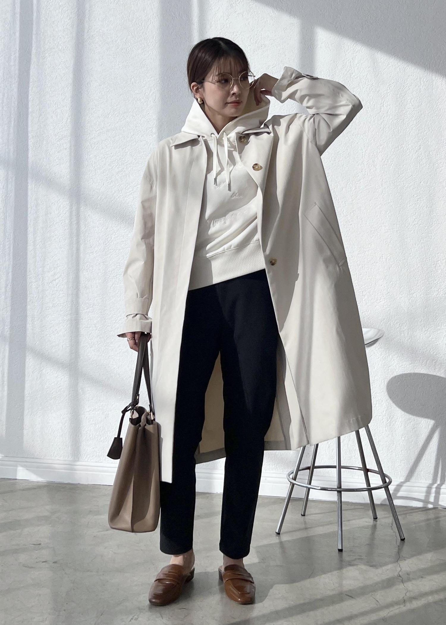 シンプルなステンカラーコートは、カジュアルアイテムに合わせて大人コーデに。