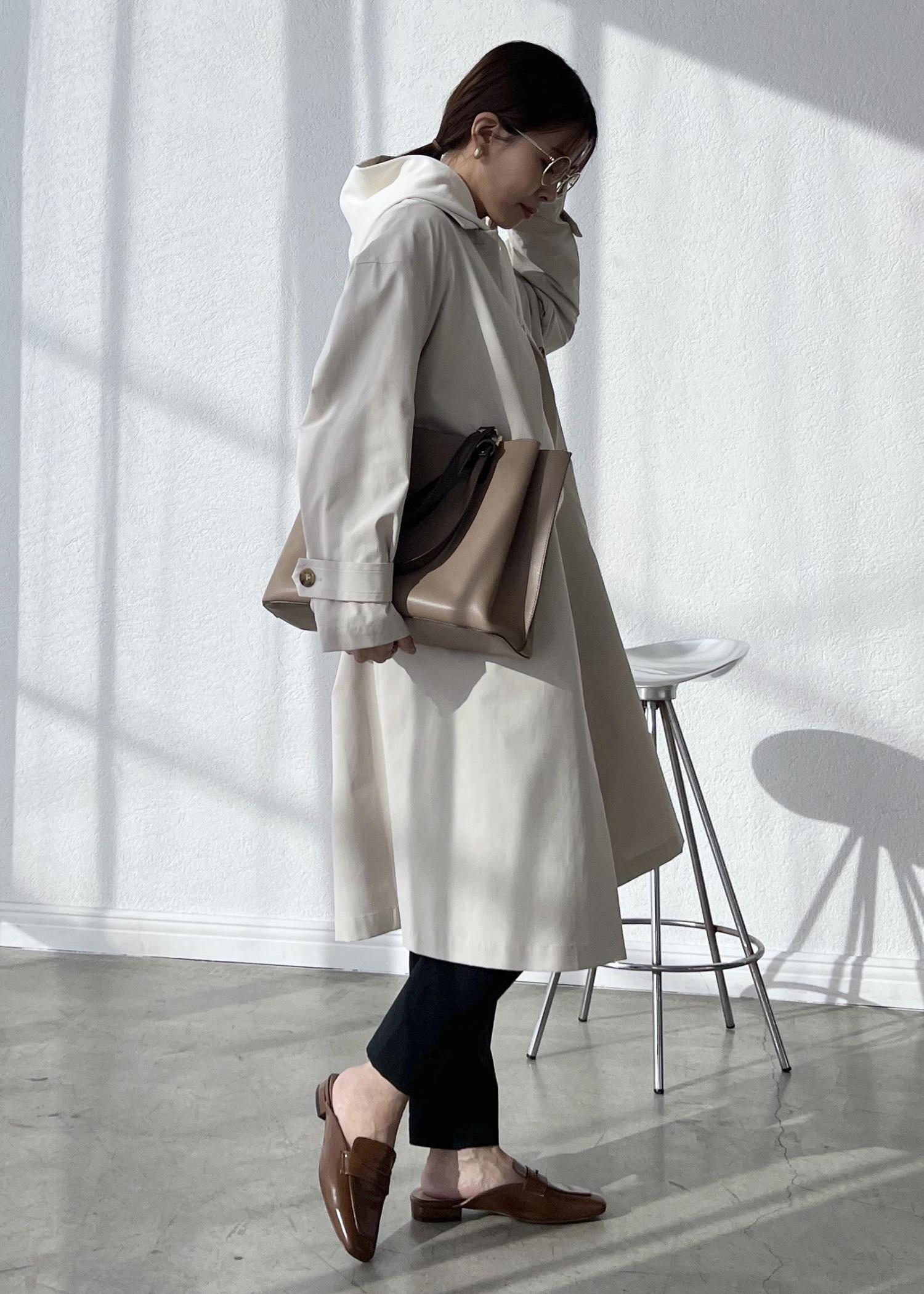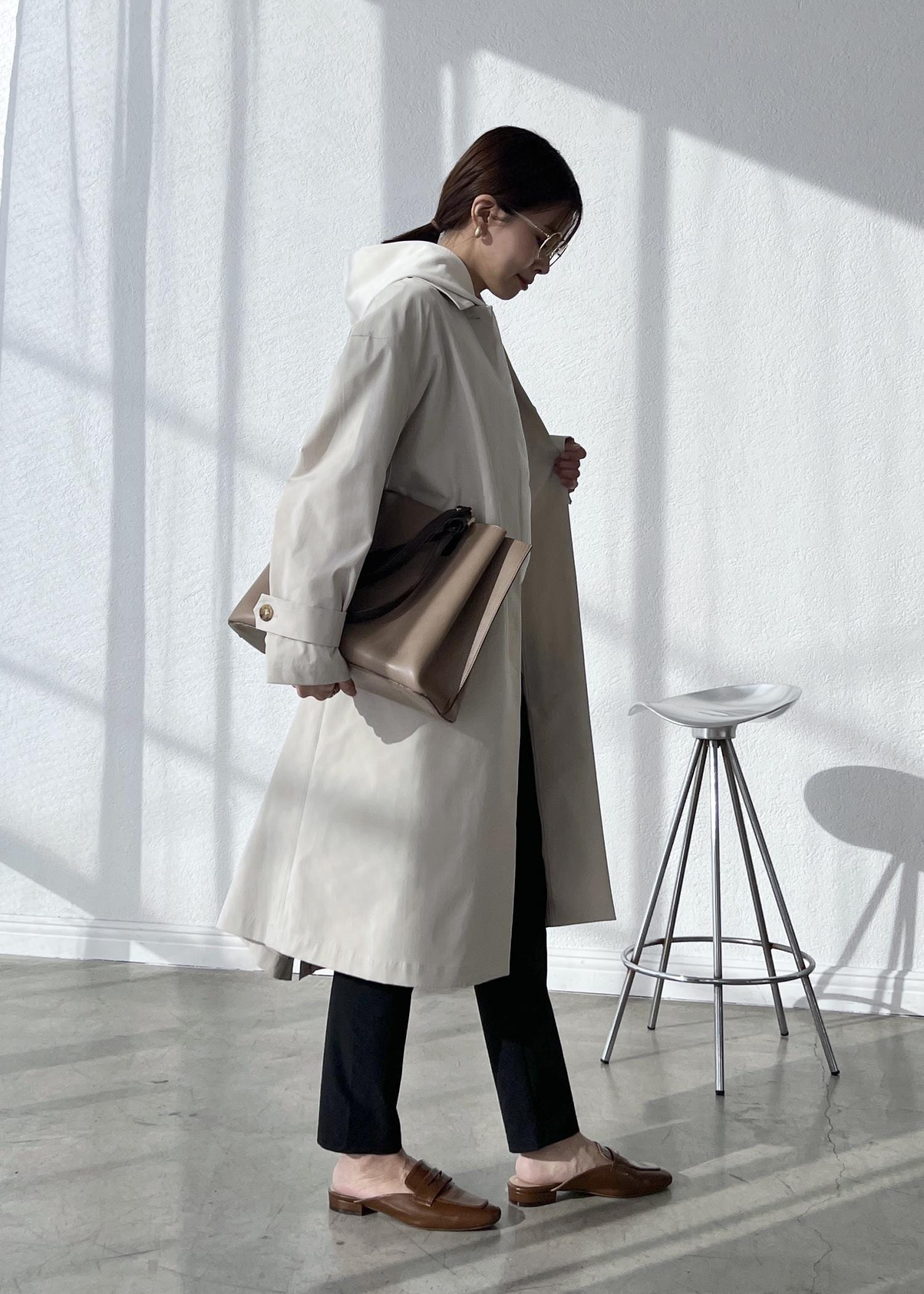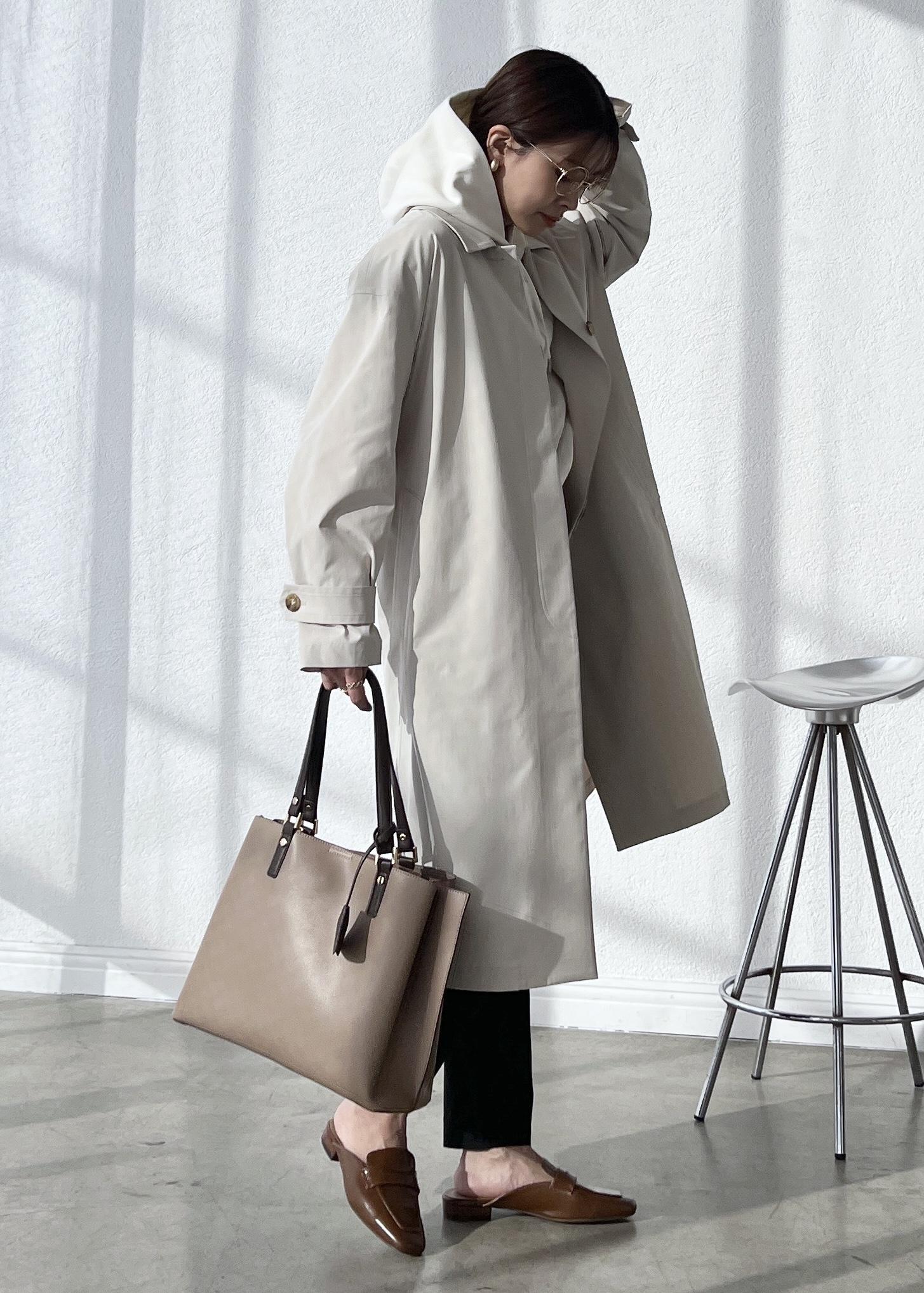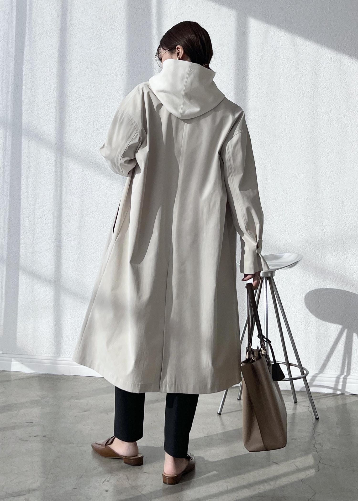 シンプルなステンカラーコートは、カジュアルアイテムに合わせて大人コーデに。