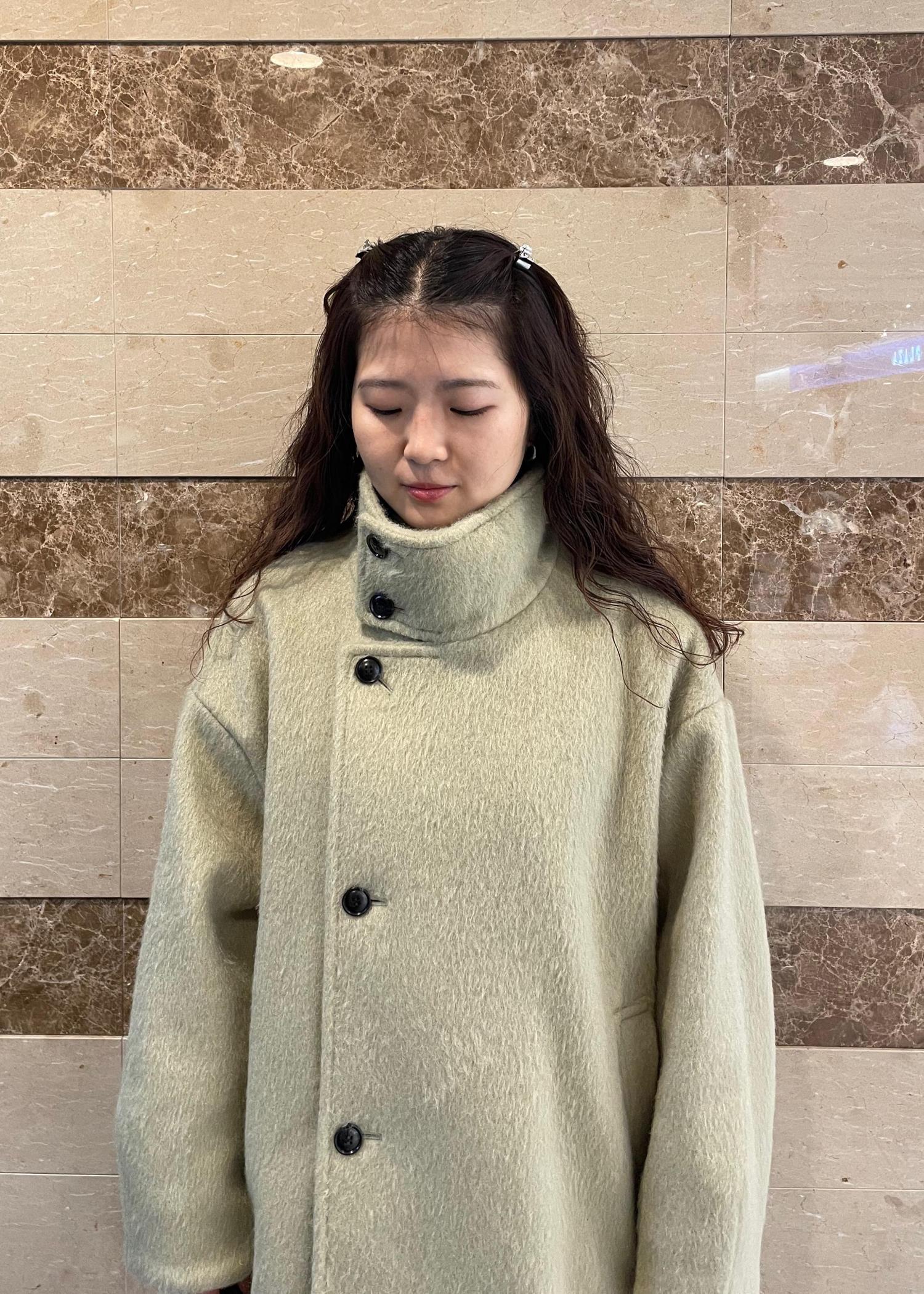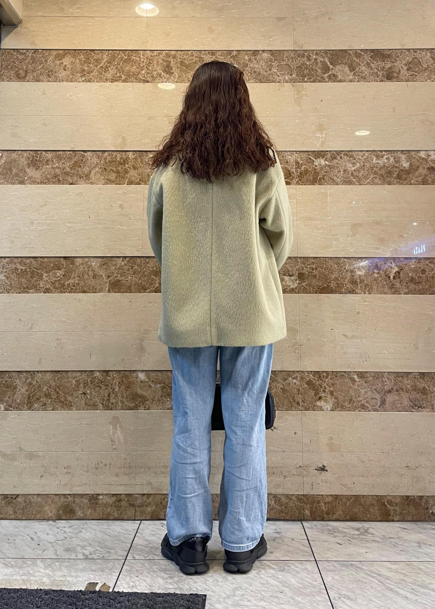 柔らかな色味がグリーンが可愛いオーバーサイズのコート。袖にボリュームがあるトップスでも楽々羽織れるサイズ感です!