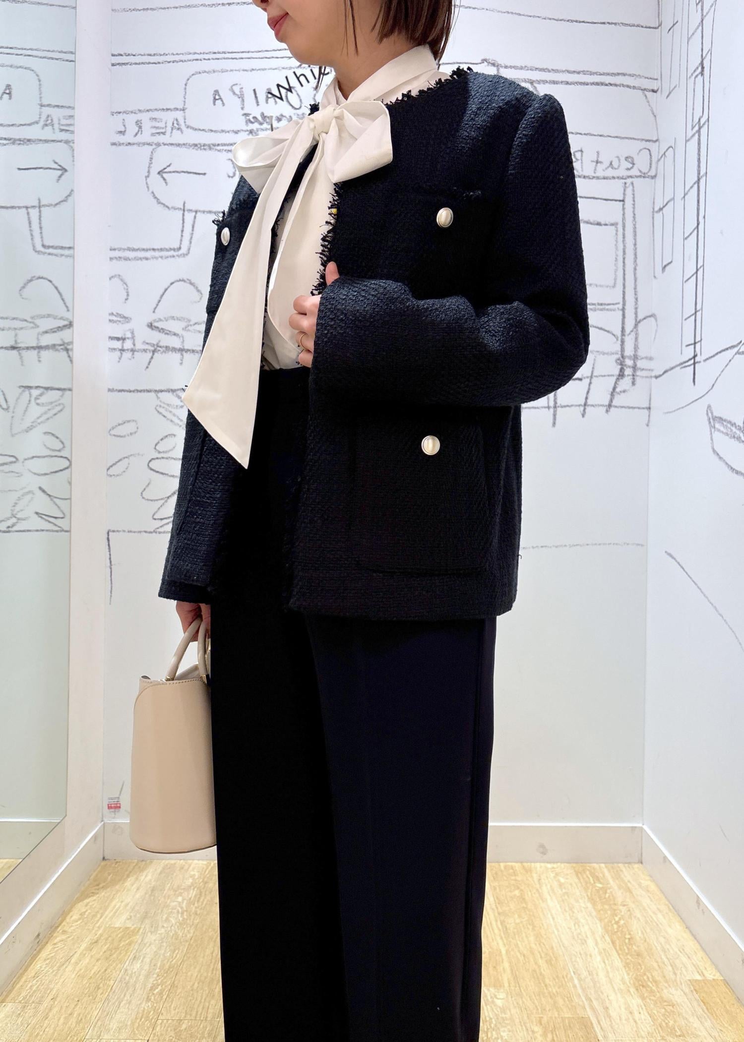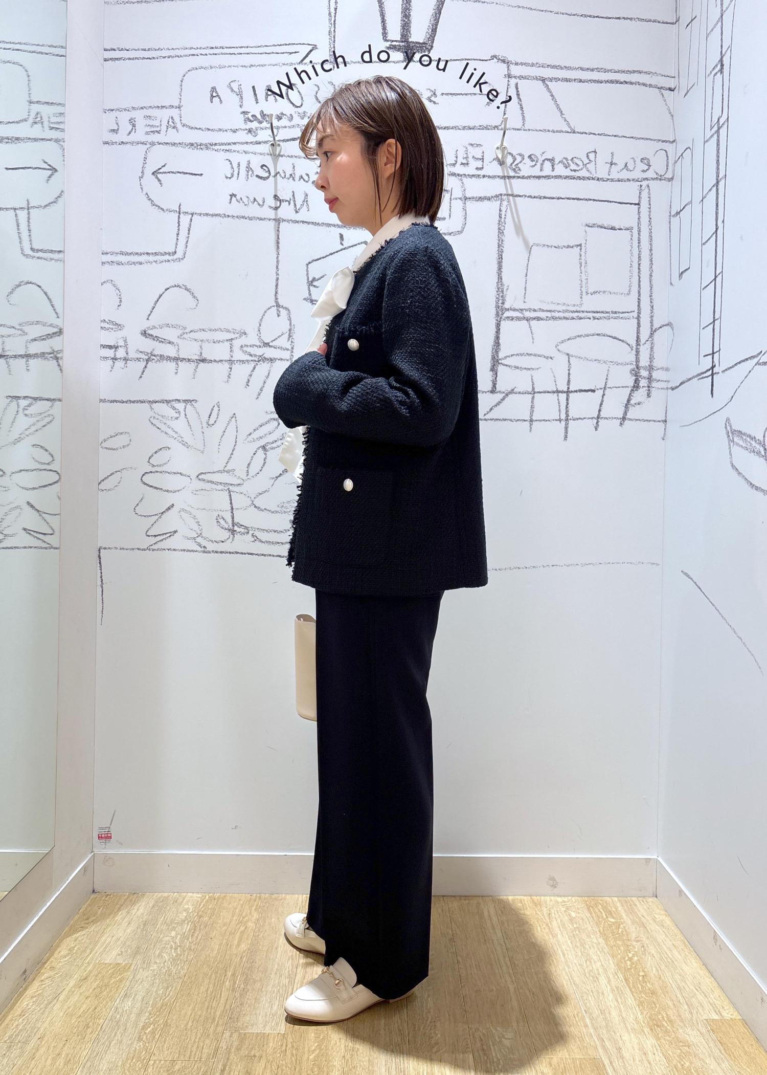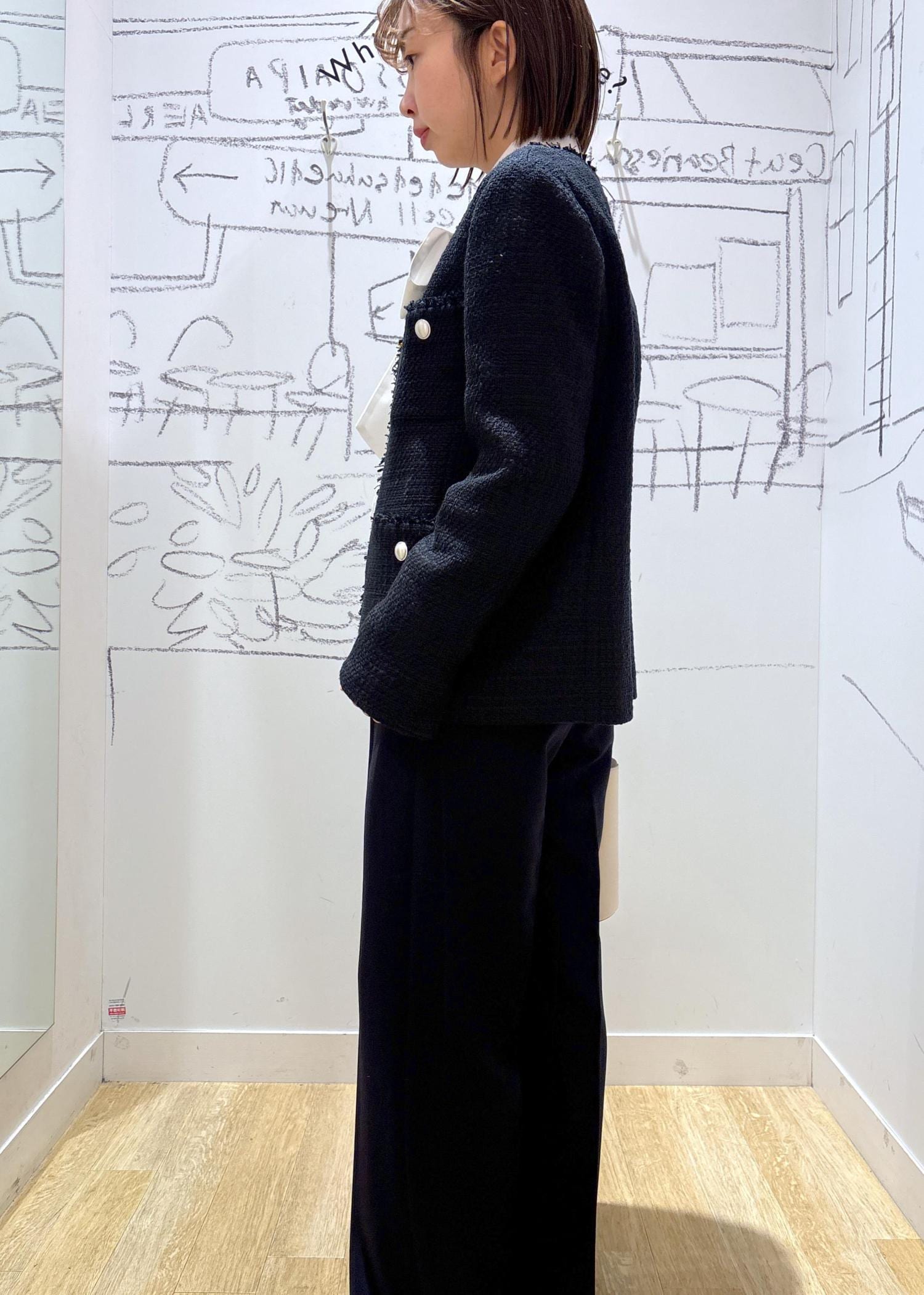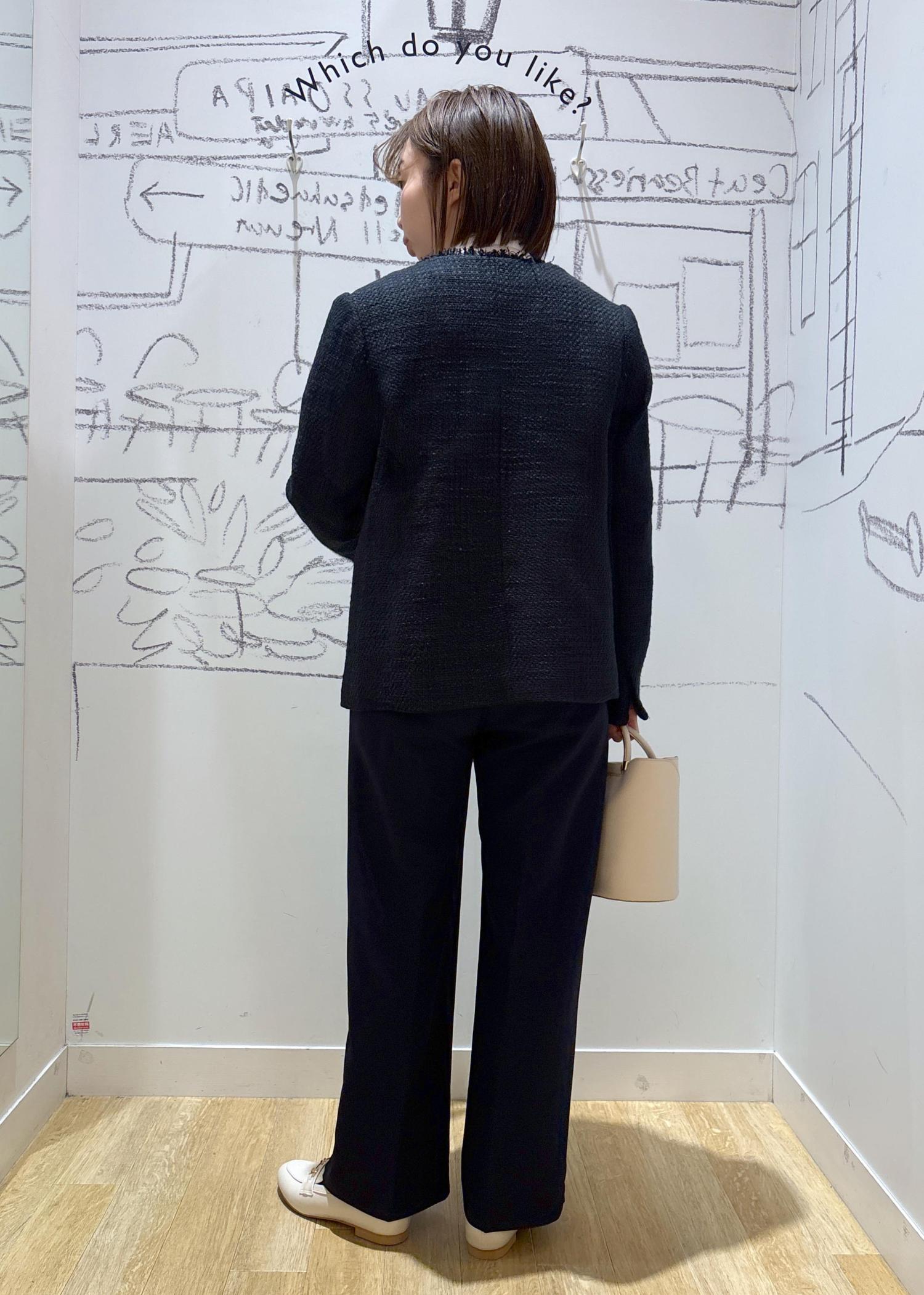 落ち着いたツイード素材でオンオフ兼用で着用できます。 -