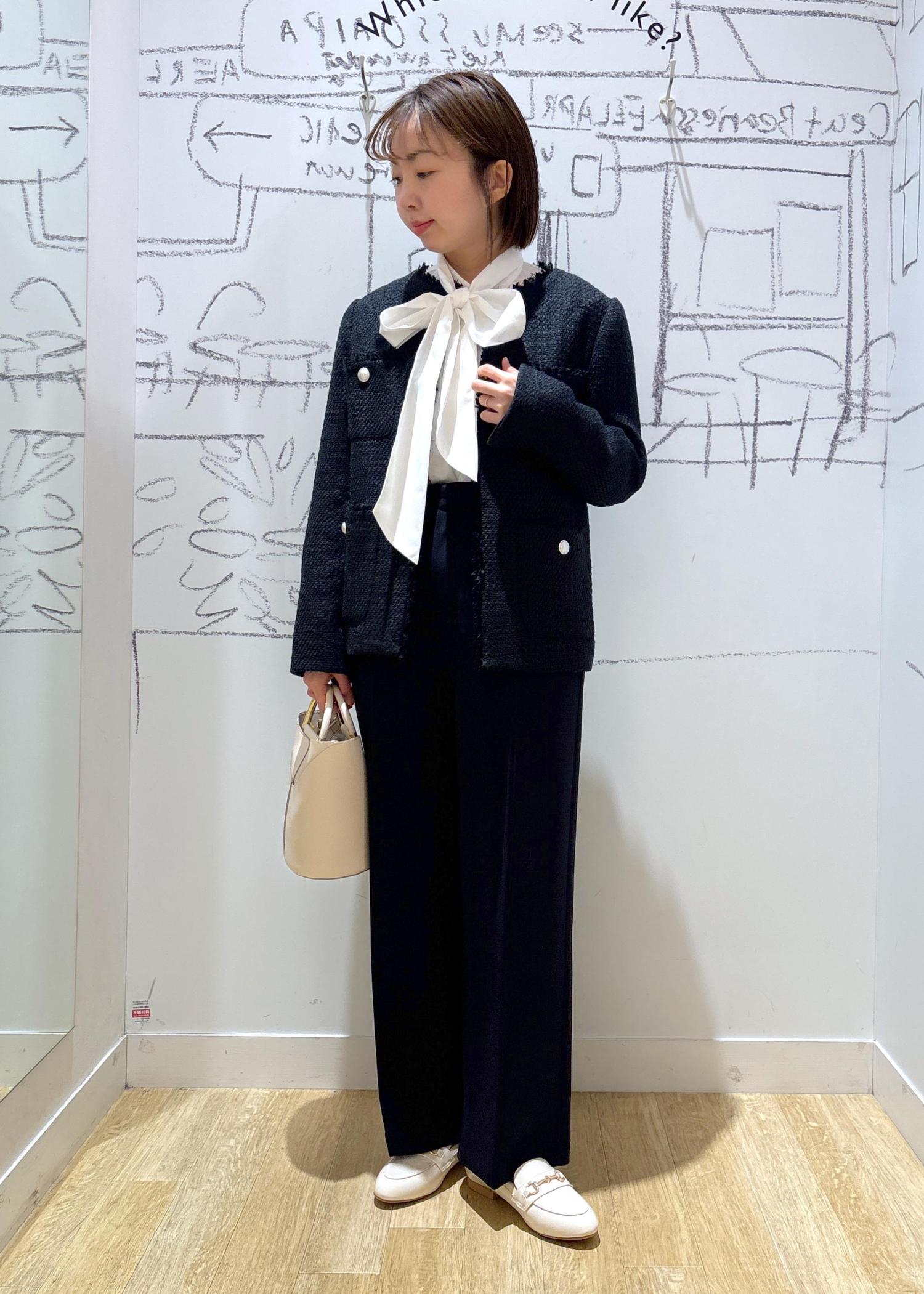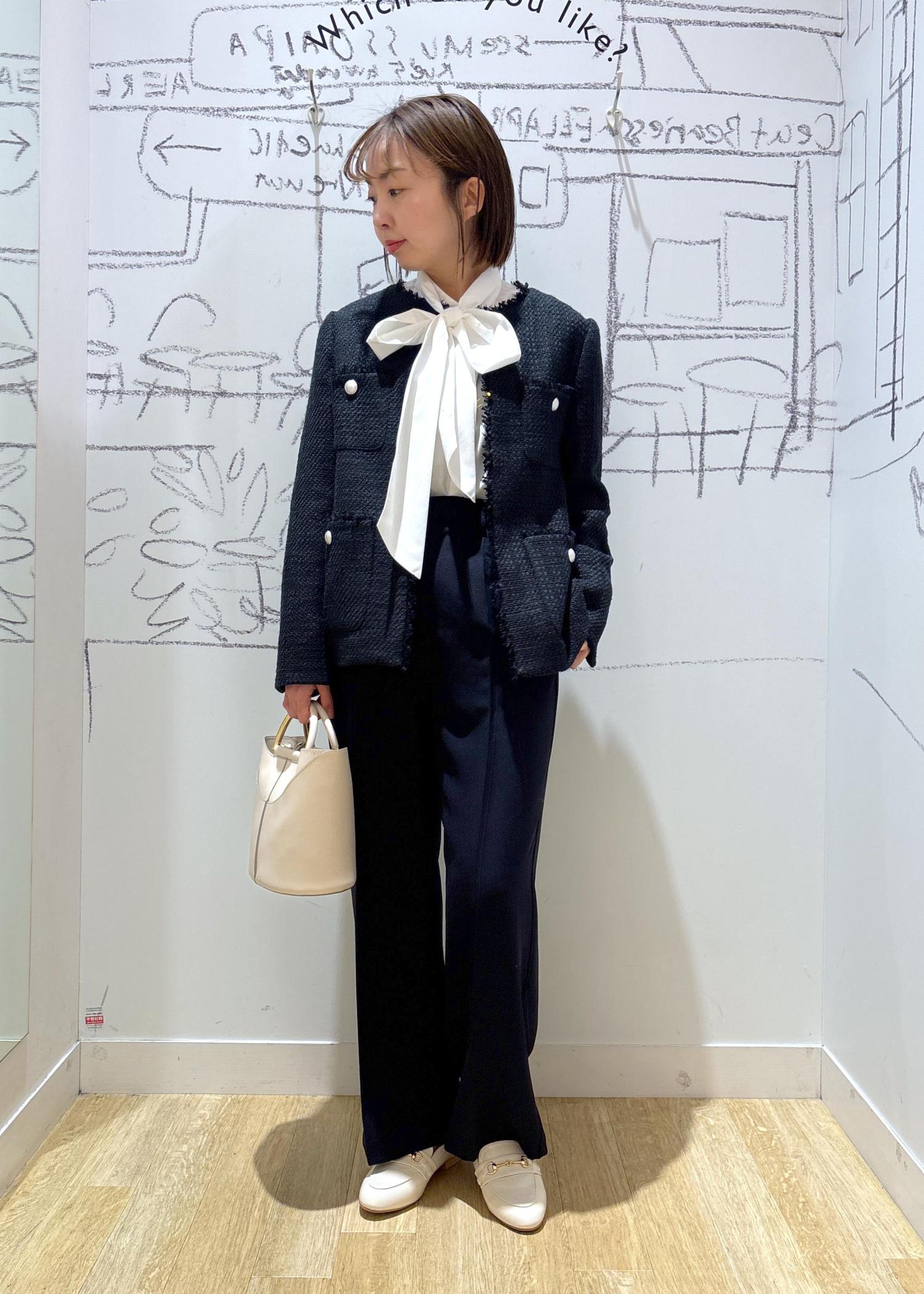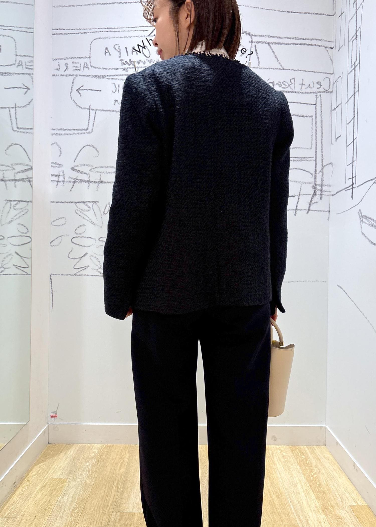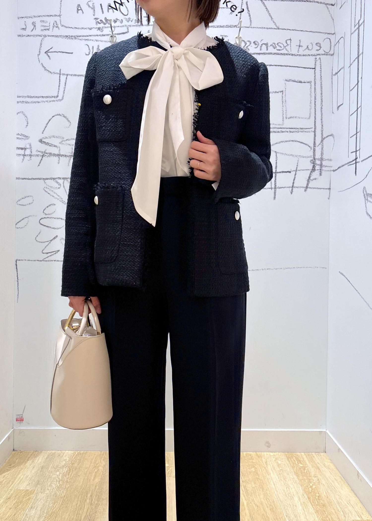 落ち着いたツイード素材でオンオフ兼用で着用できます。 -