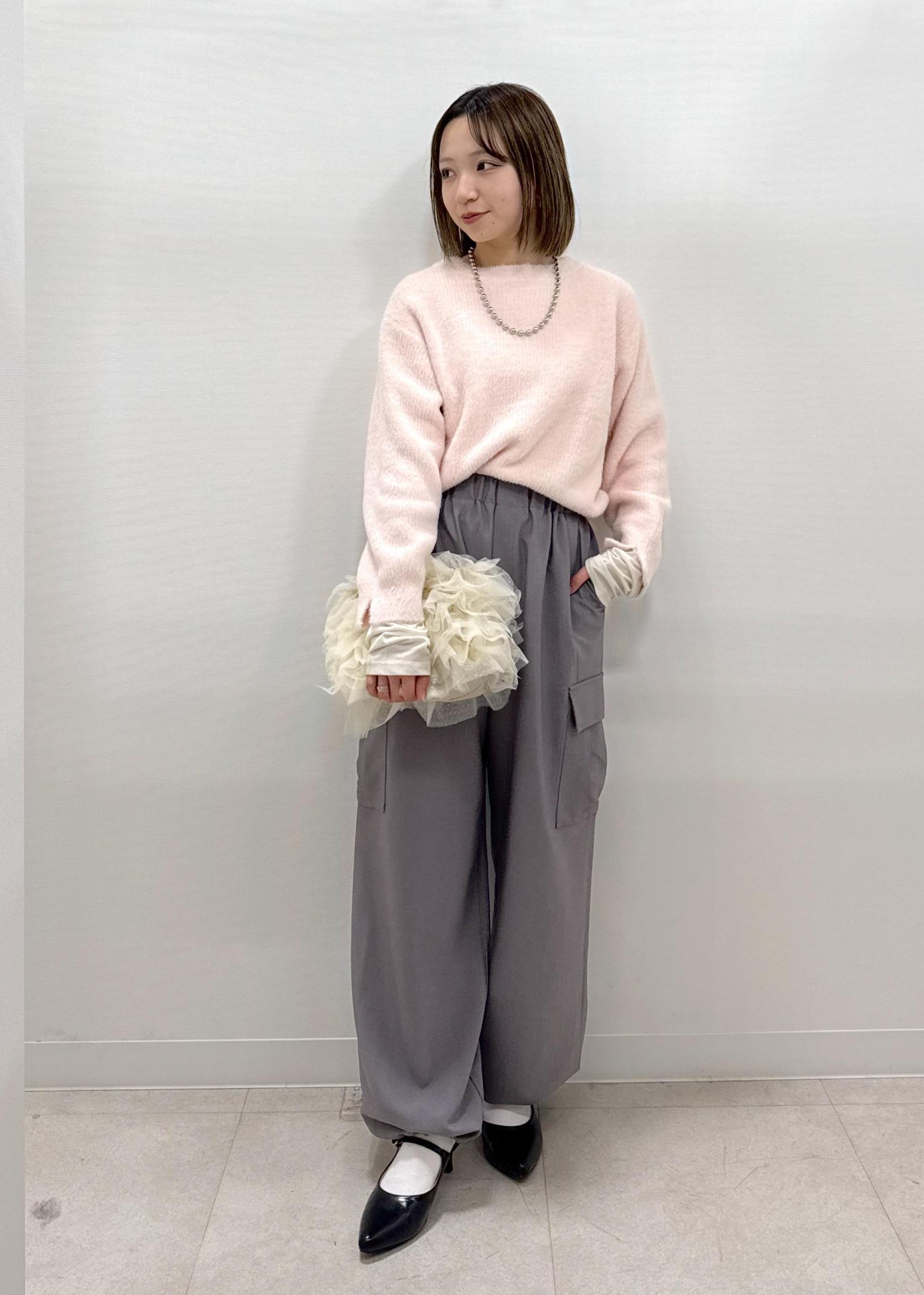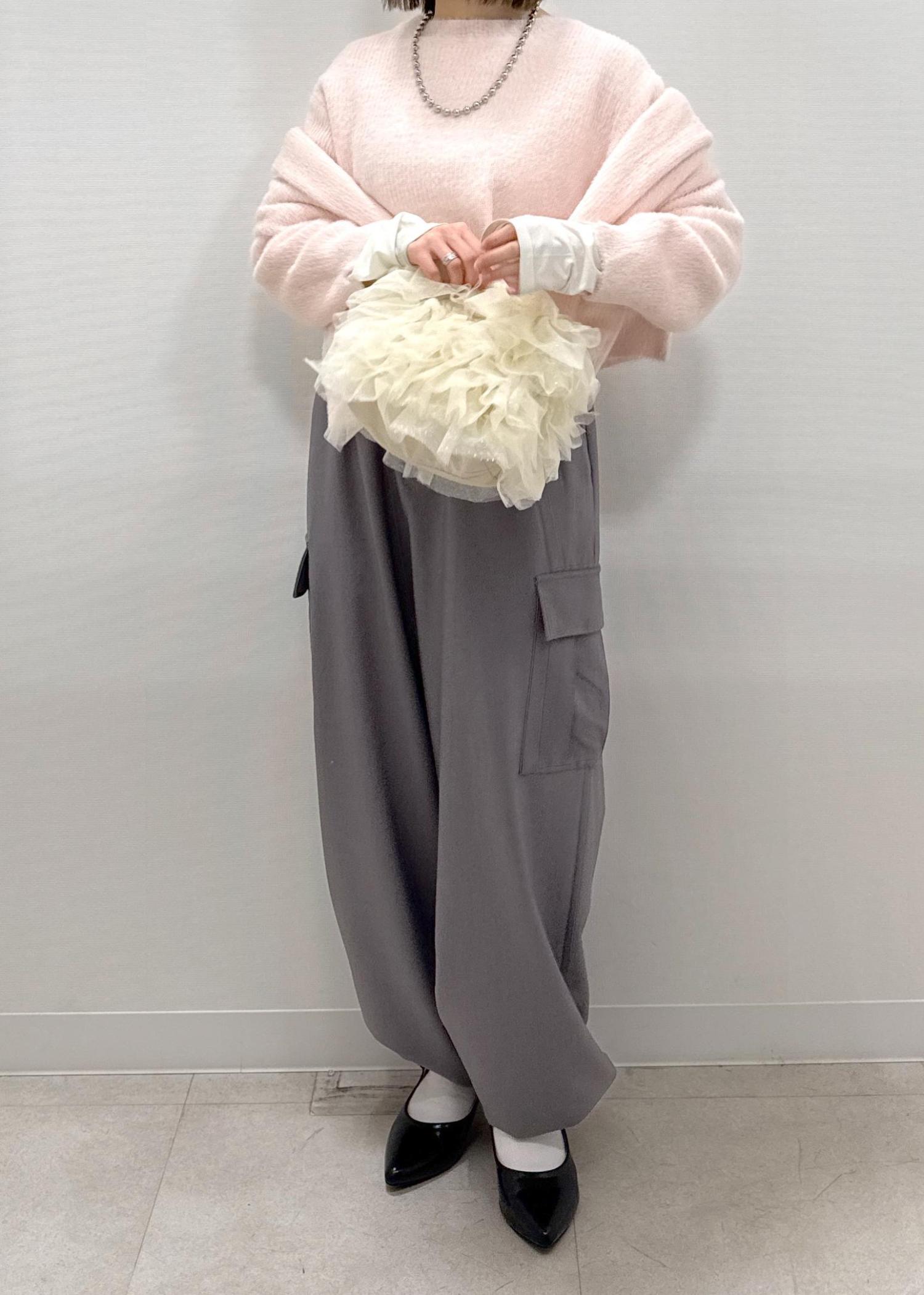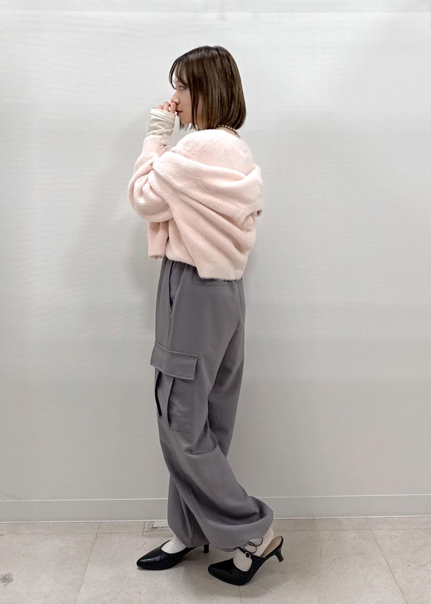 カーゴパンツにピンクのふわふわニットを合わせたフェミニンカジュアルコーデ☺︎