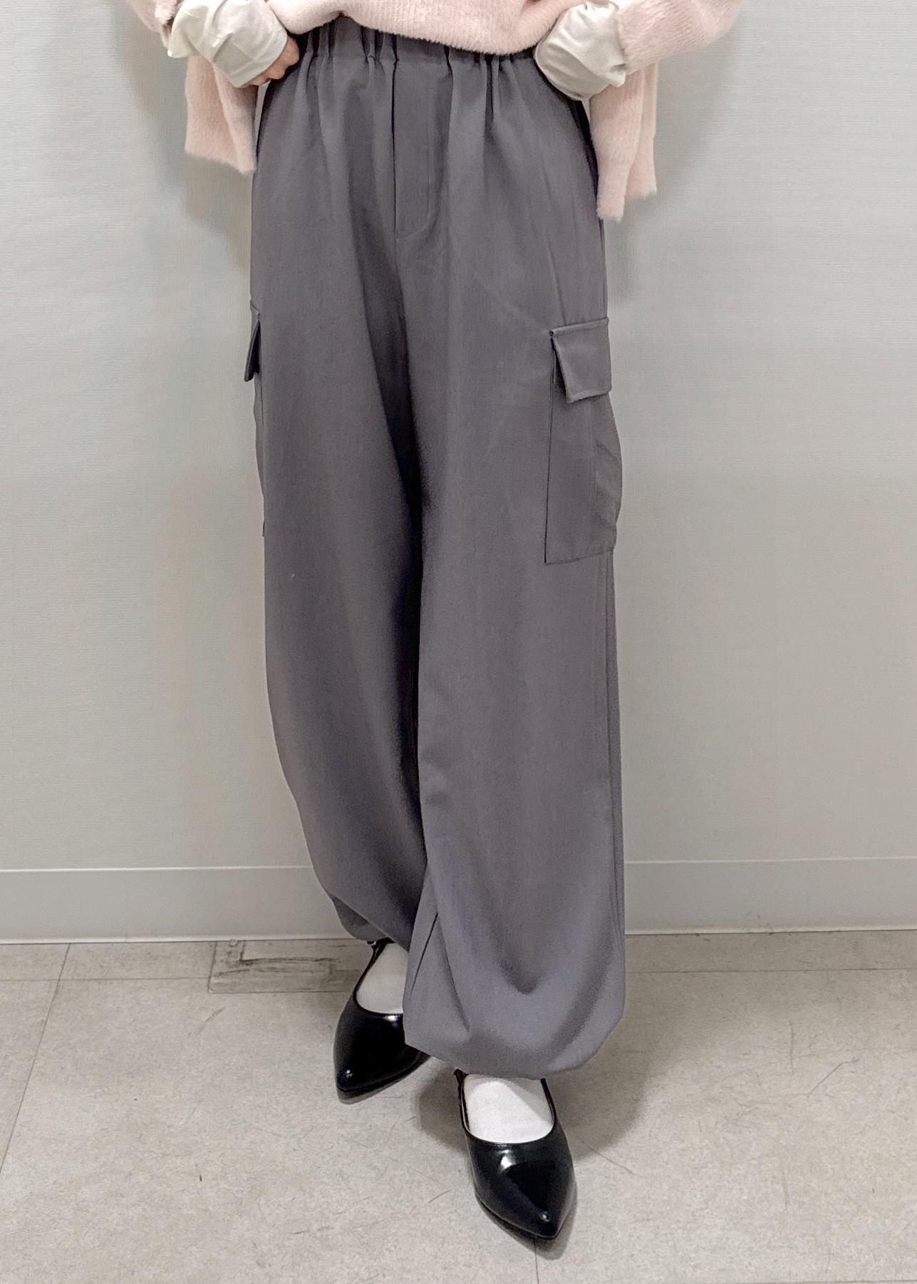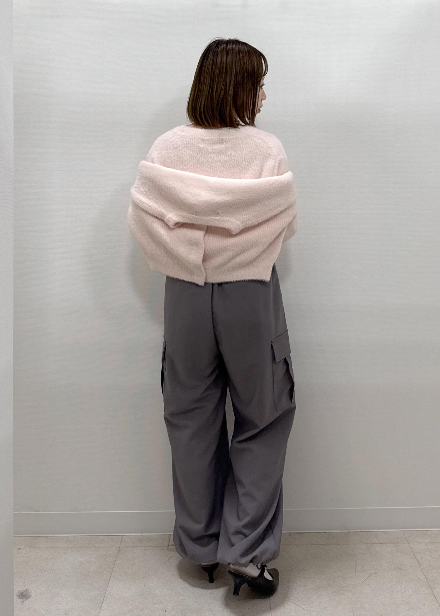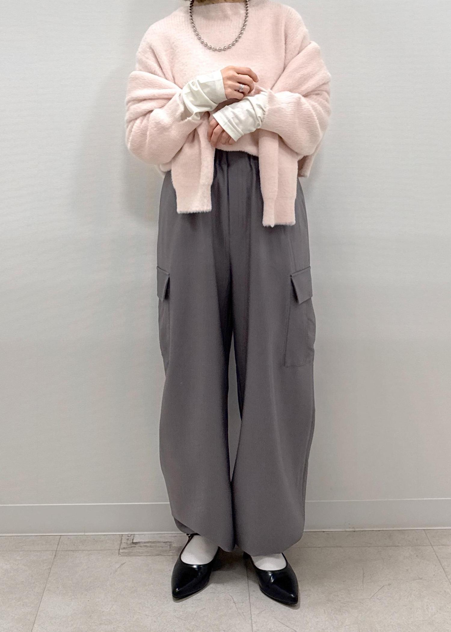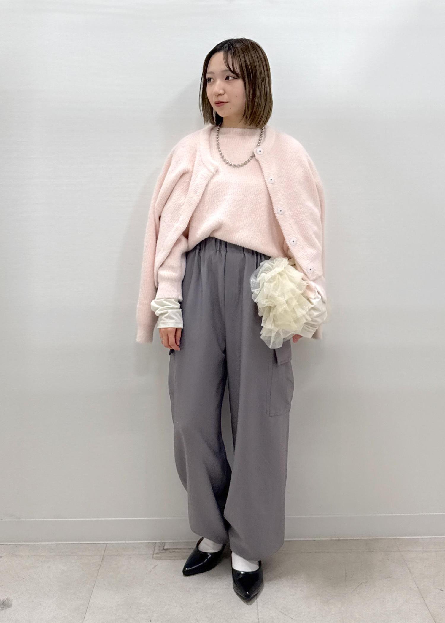 カーゴパンツにピンクのふわふわニットを合わせたフェミニンカジュアルコーデ☺︎