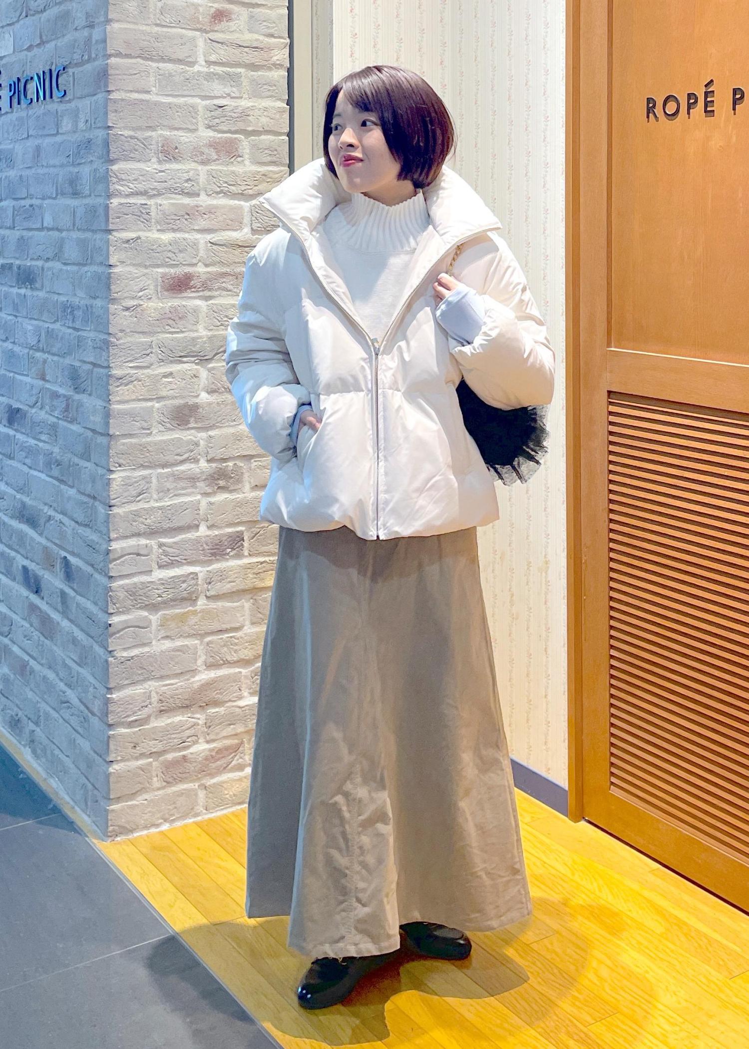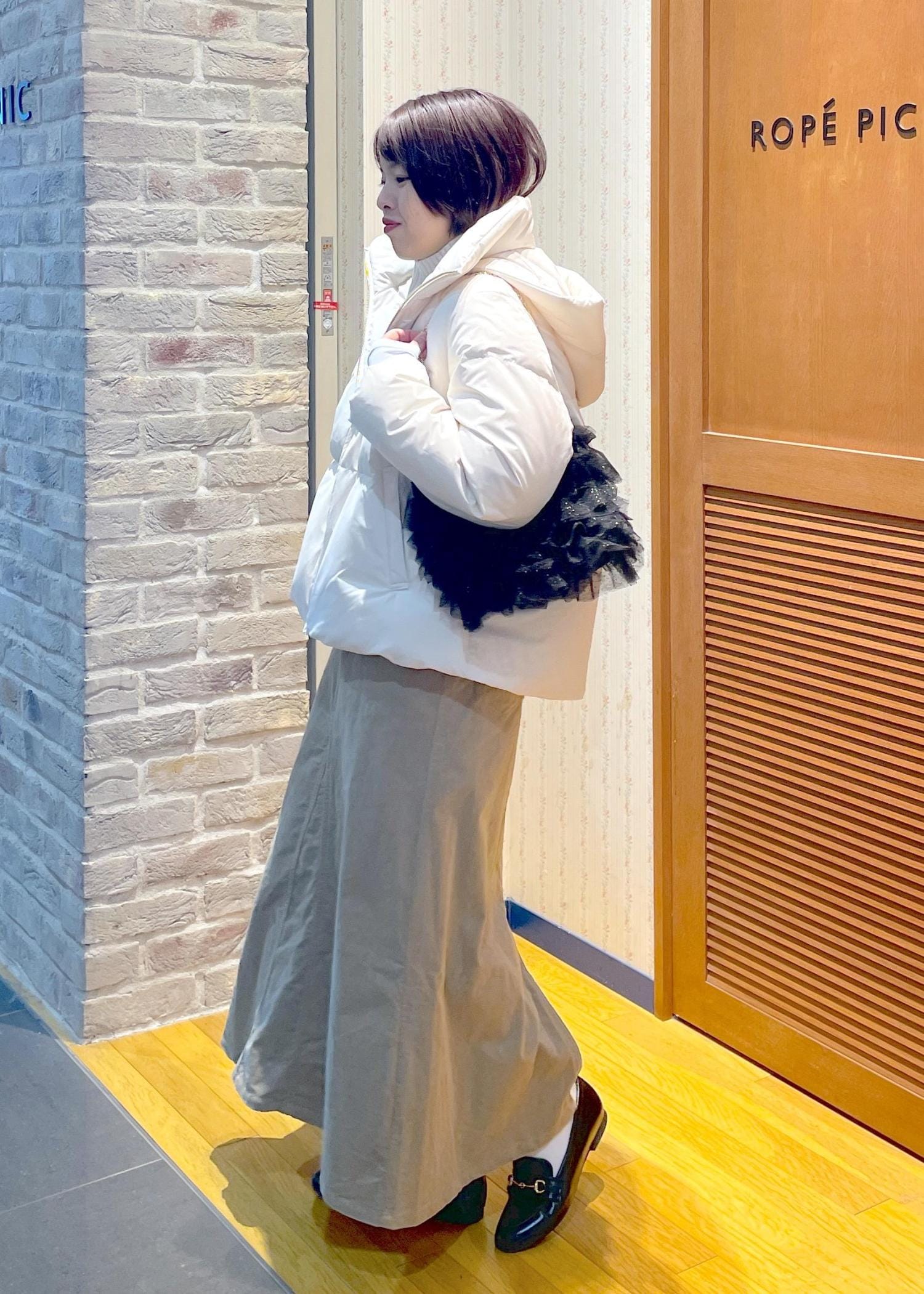 コーデュロイのスカートにショートダウンを合わせて、冬のお出かけにもぴったりのカジュアルコーデです!