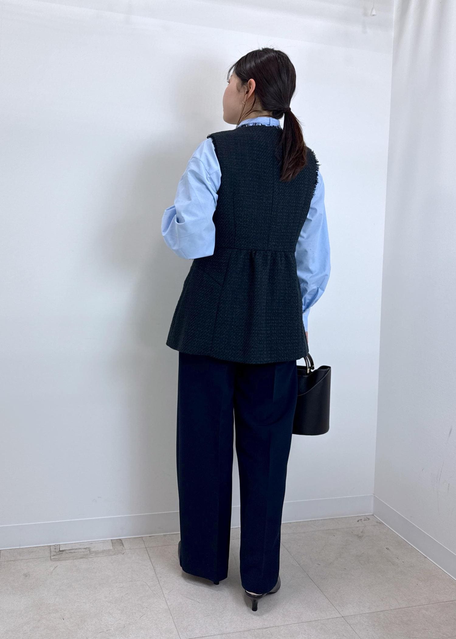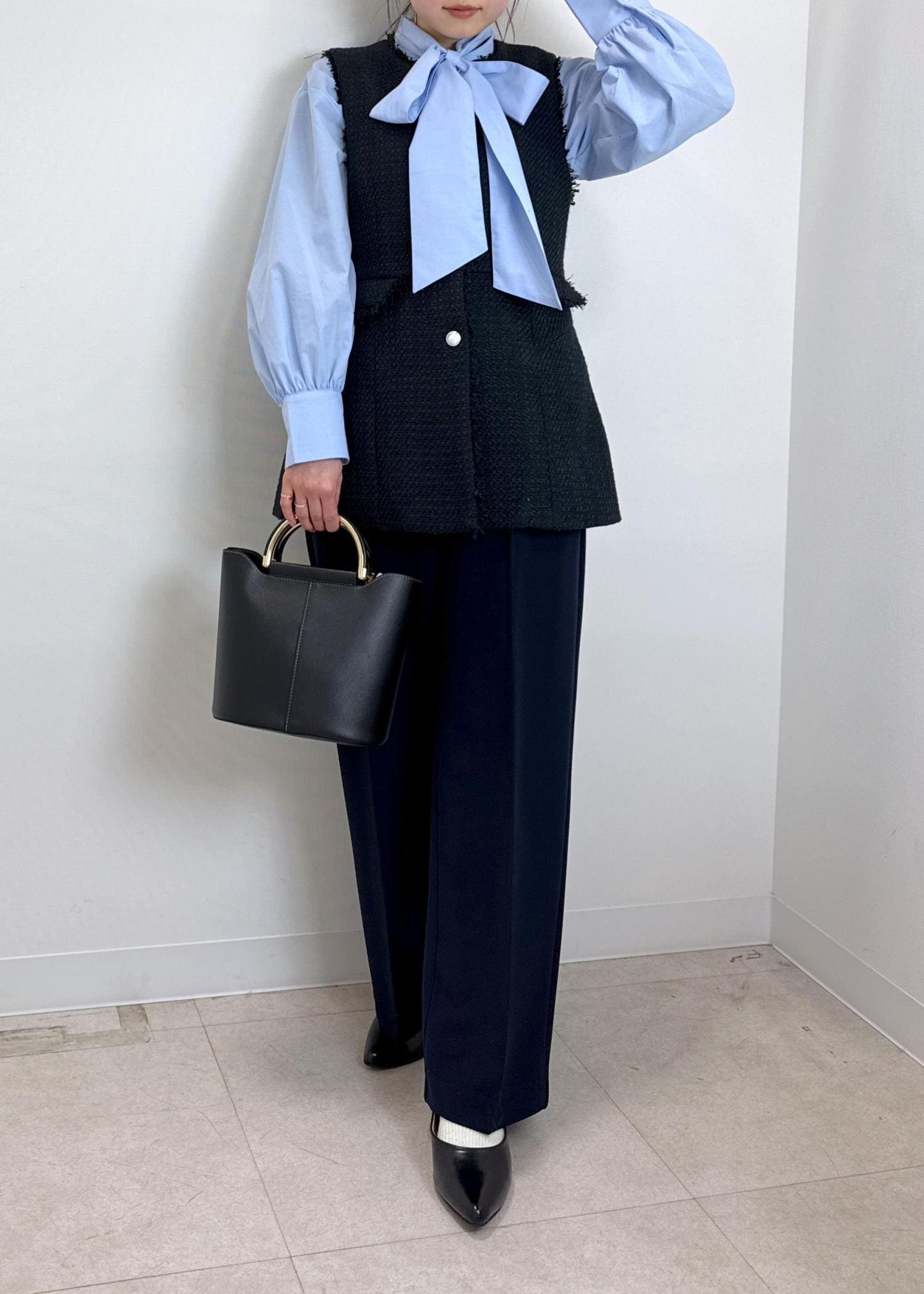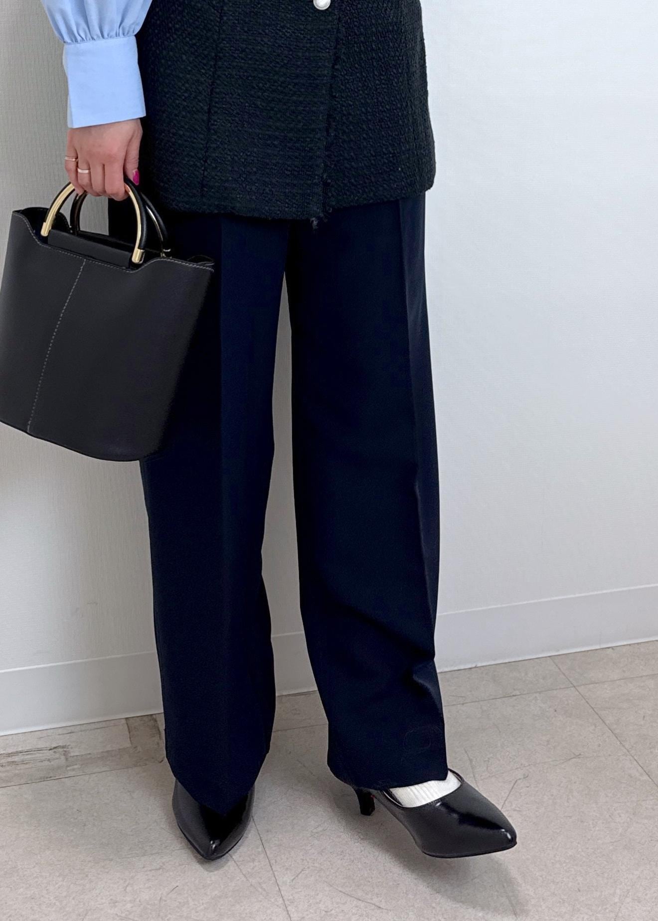 ツィードジレとキレイめパンツをネイビーで統一しハレの日にもピッタリなコーディネートにしてみました。