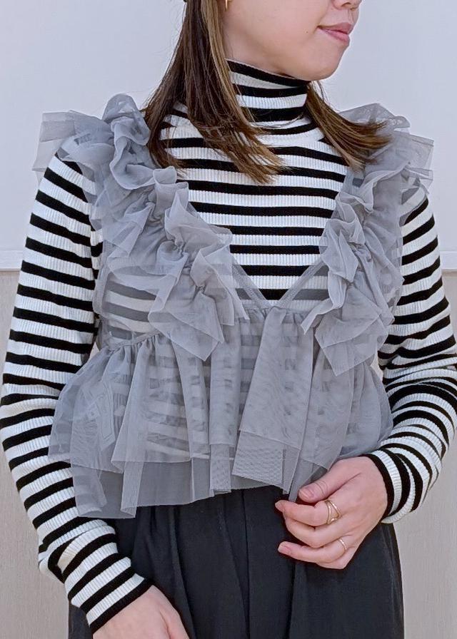 可愛い!フェミニン!なイメージのチュールアイテムをボーダーニットと、キャップを合わせて大人カジュアルに仕上げてみました♪