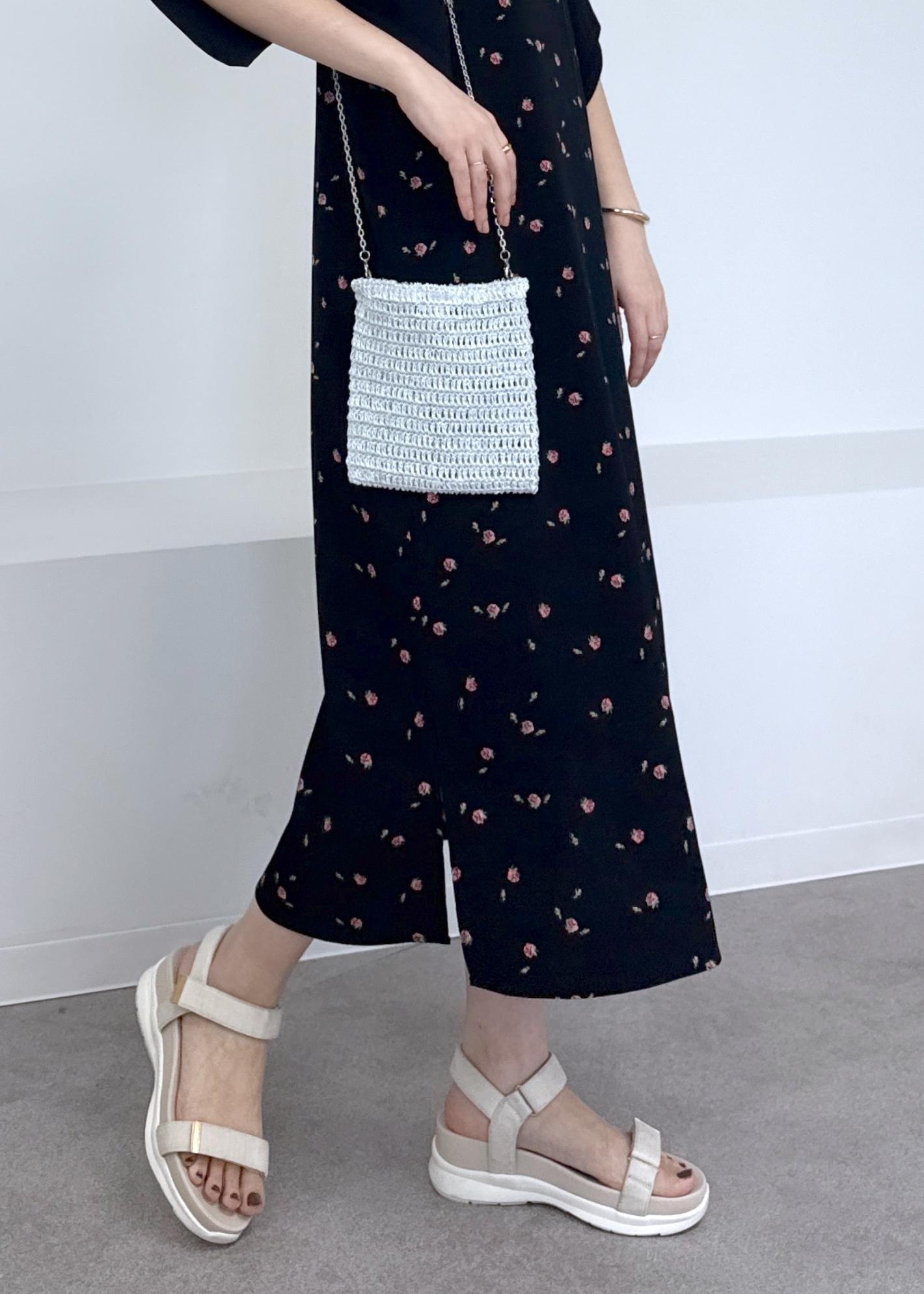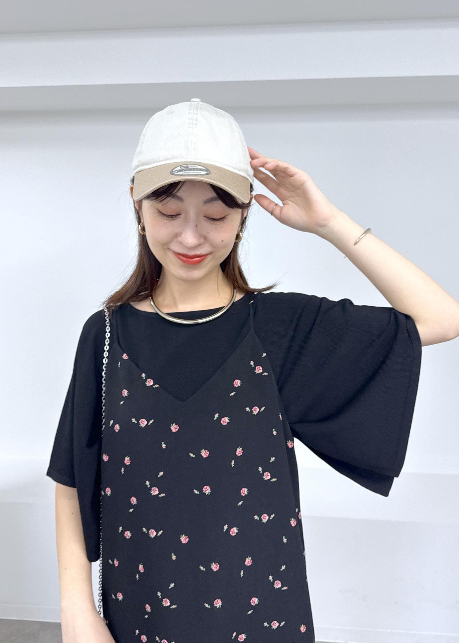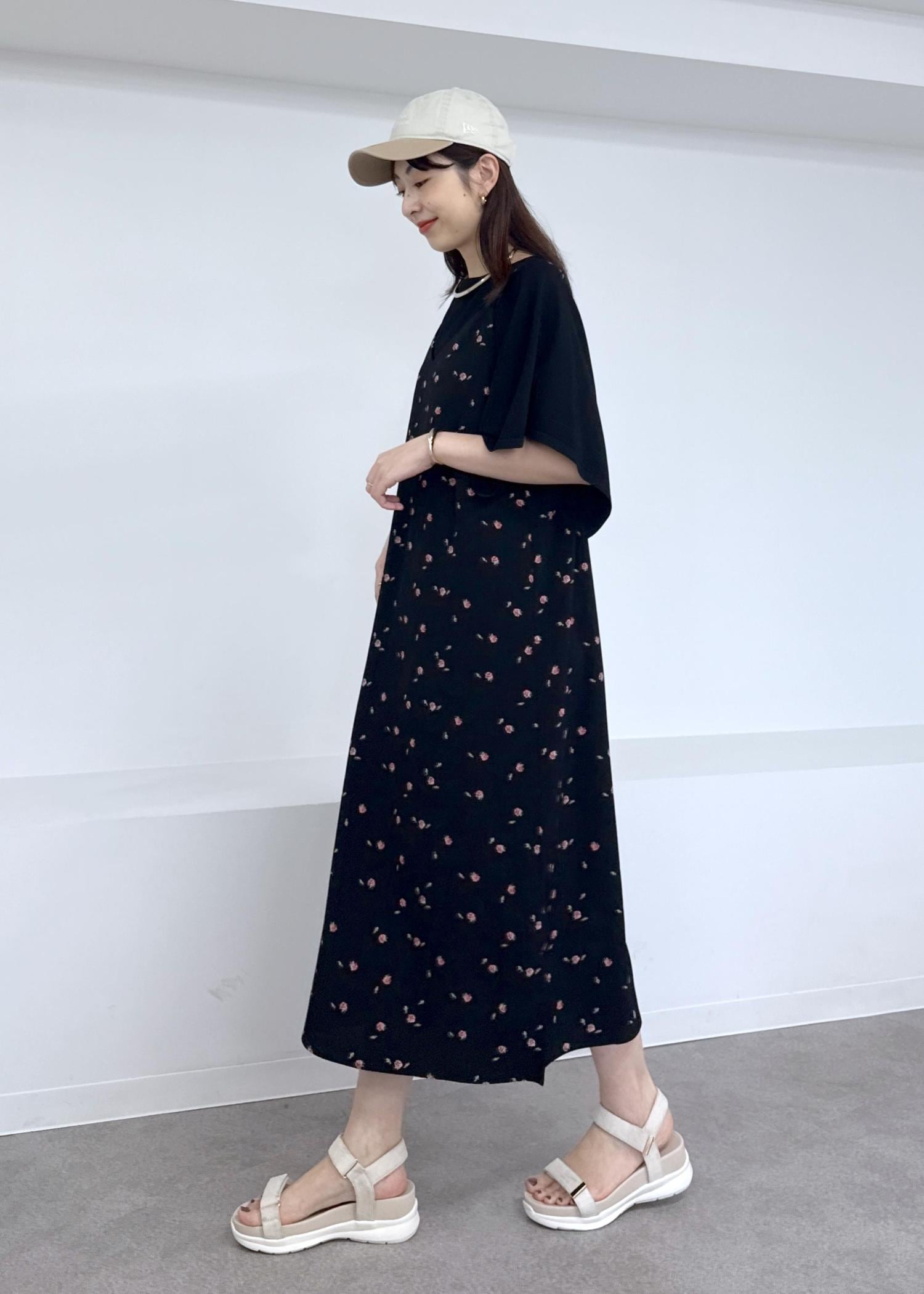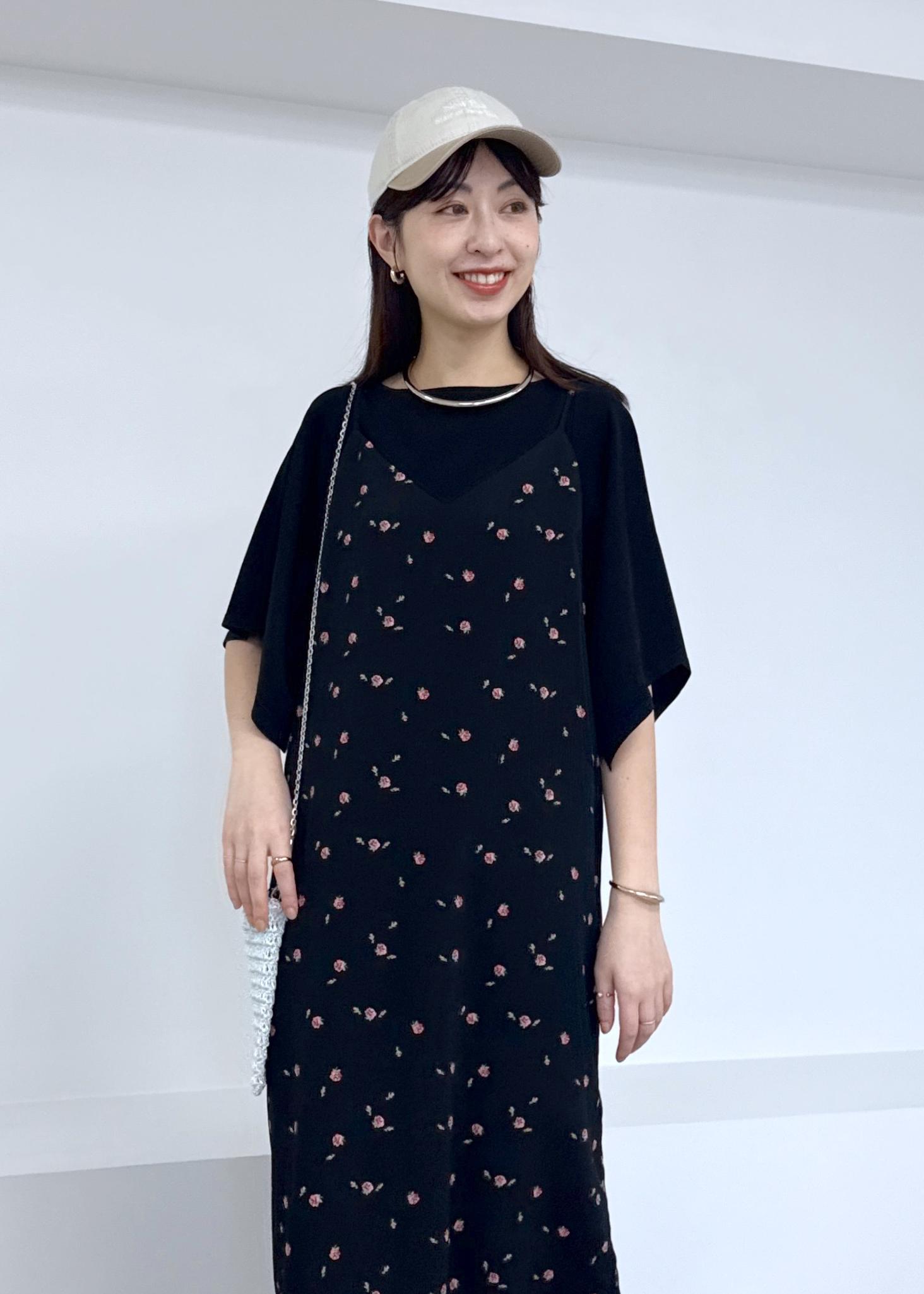 ストンと真っ直ぐ落ちるシルエットで細見えします。バラのプリントは控えめなので大人の女性も着やすいデザインです。アジャスターで着丈は調整可能。
