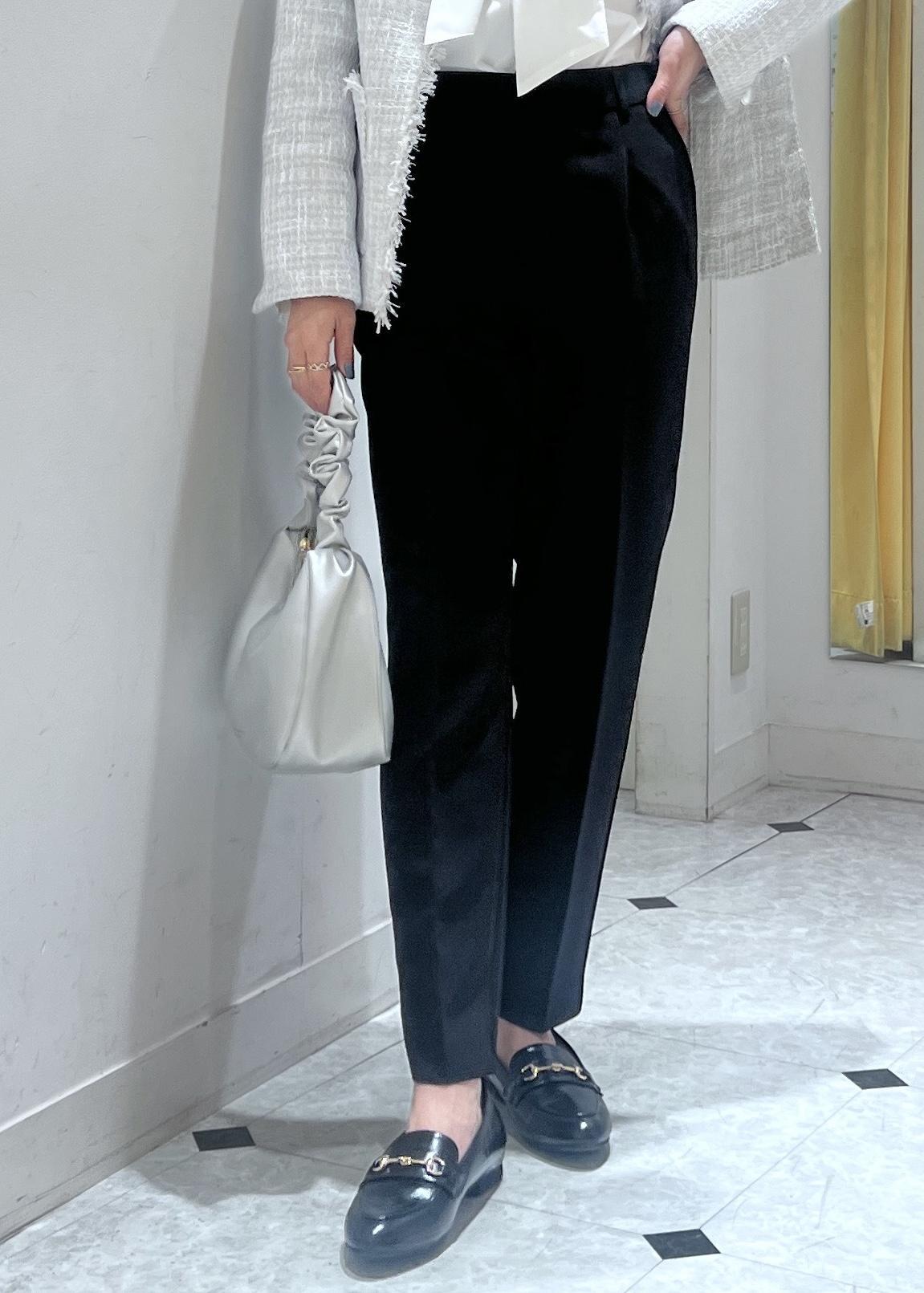 甘さ控えめに着たい方にはテーパードパンツでスッキリ感のある着こなしがおすすめです。