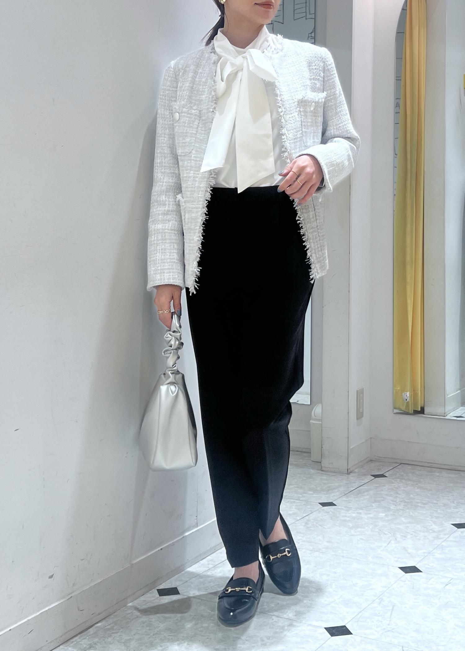 リボンボウタイのブラウスをインして、顔周りも華やかな印象に◎。
