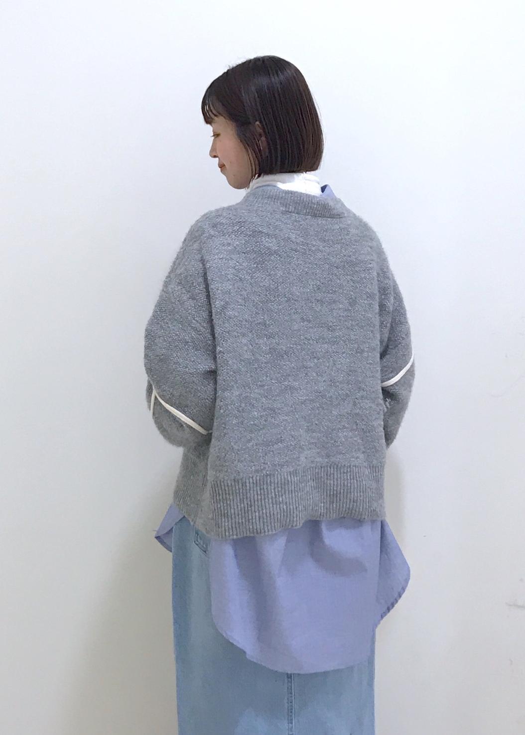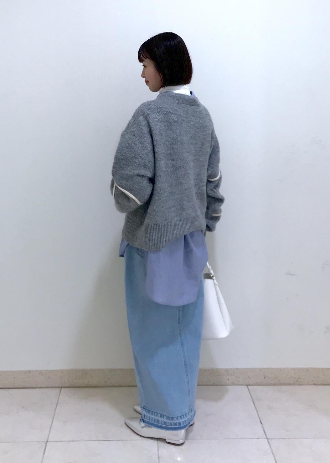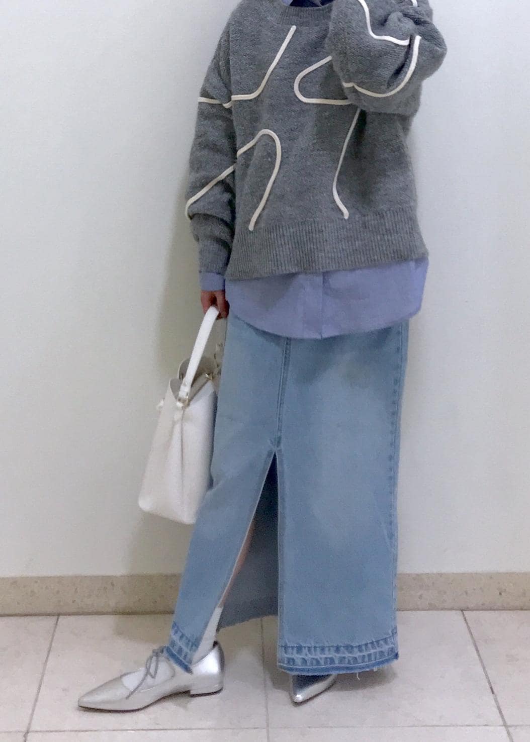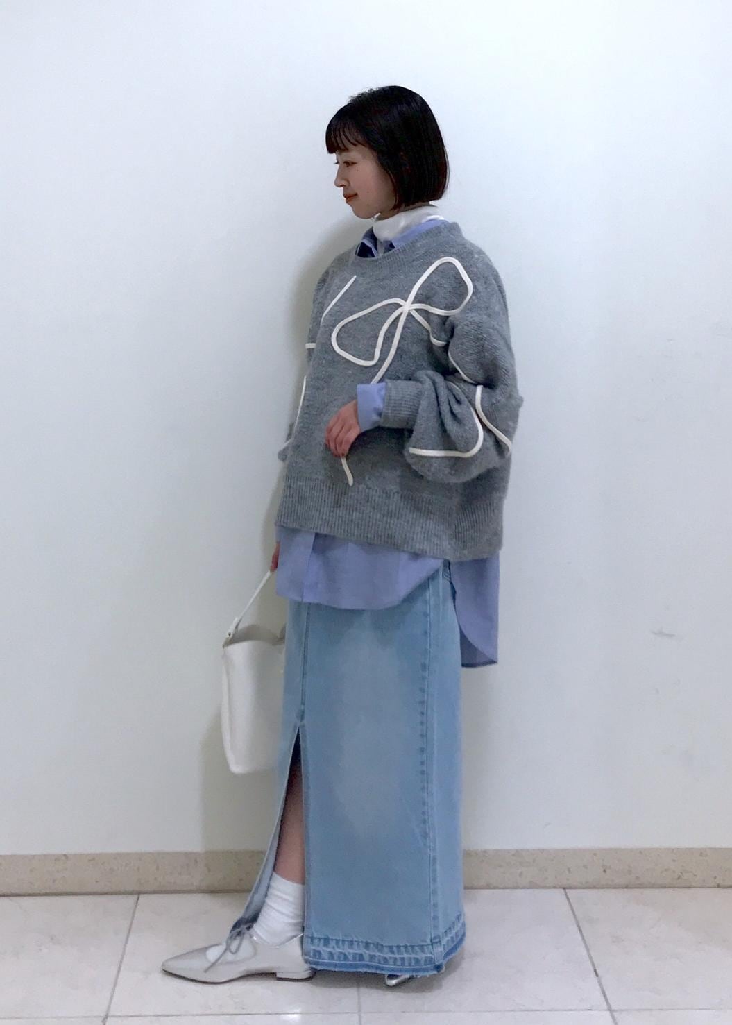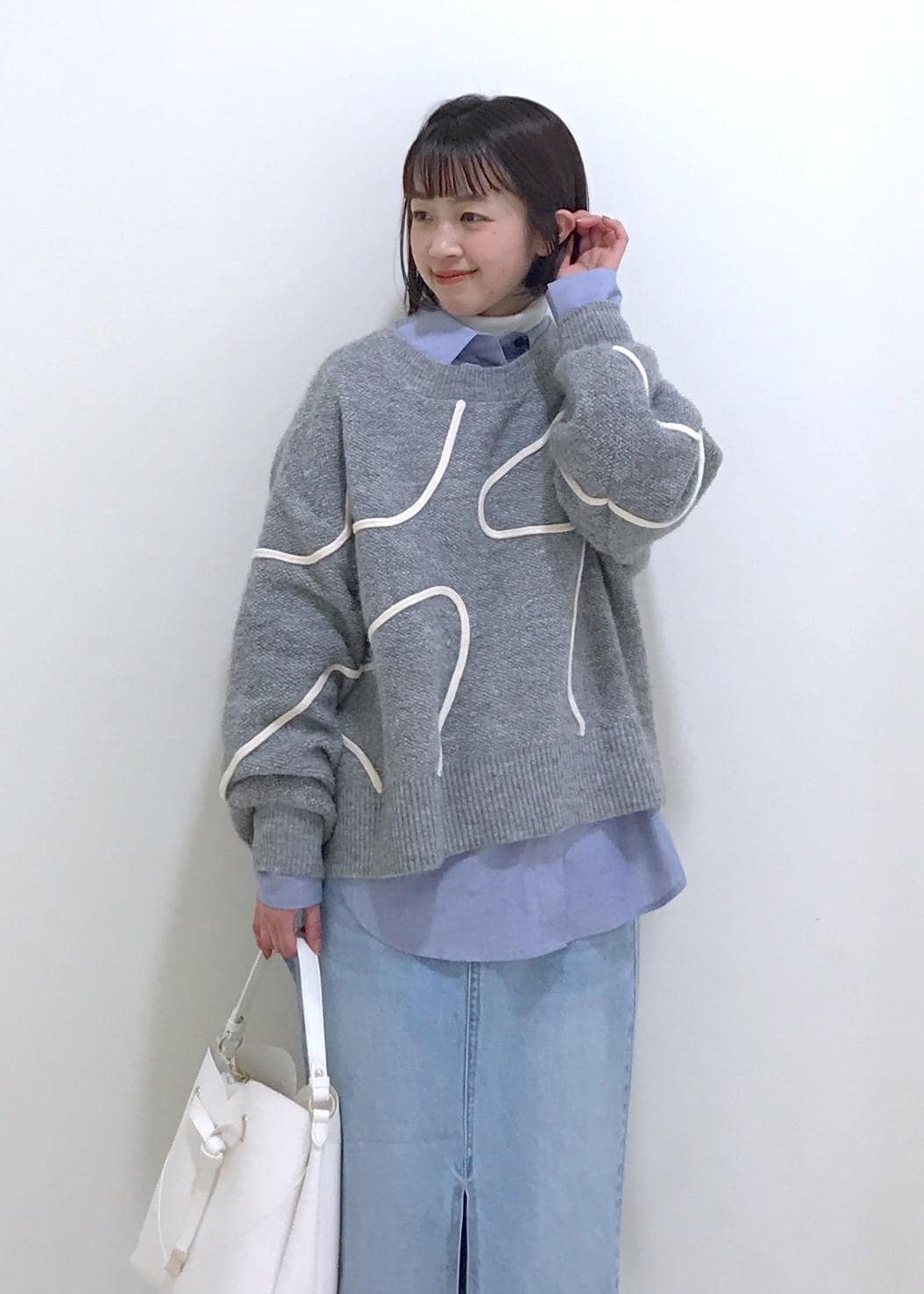 コード刺繍が可愛く1枚で着ても着映えするアイテムです♪今回はブルーのシャツを合わせて知的な印象に!