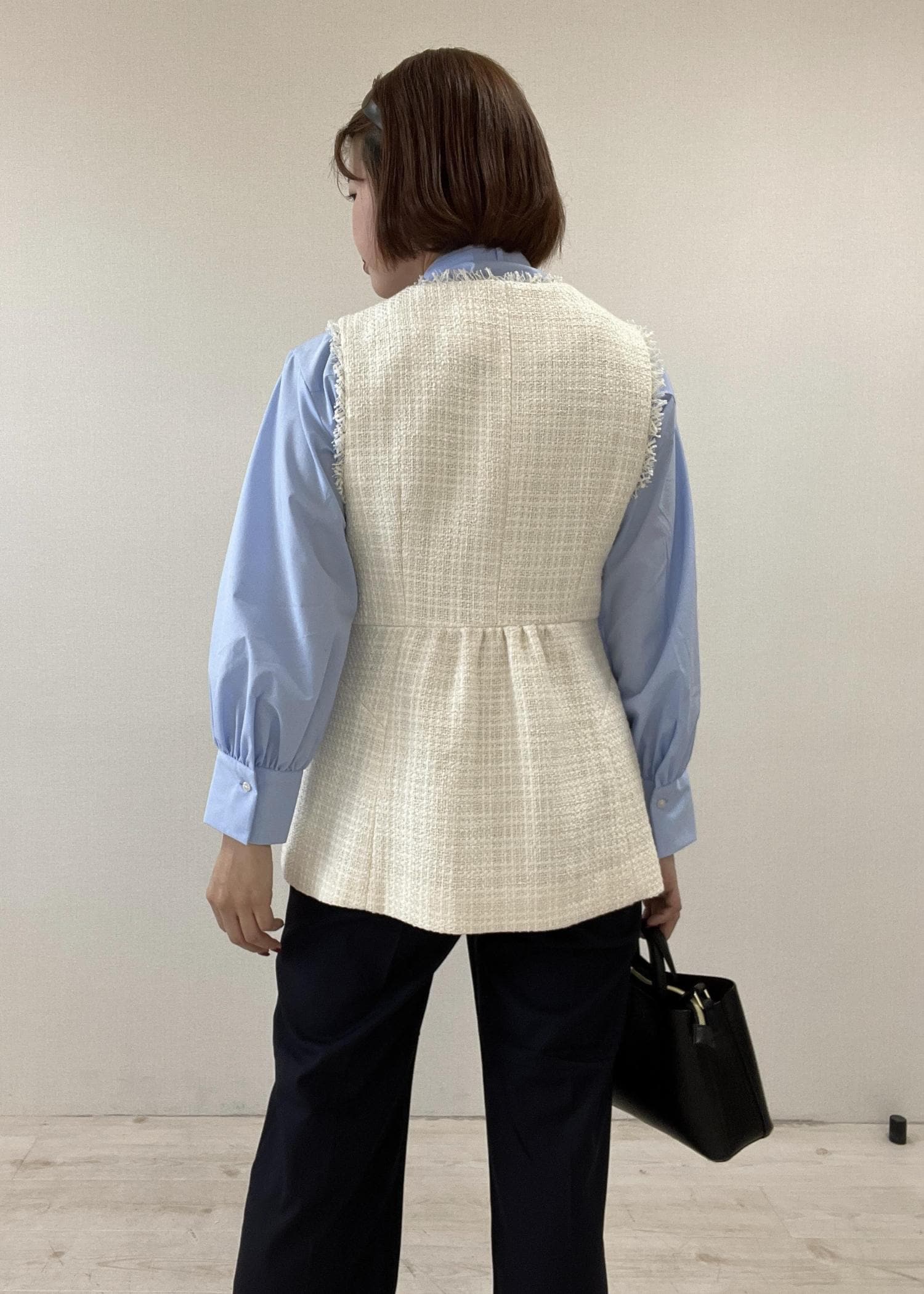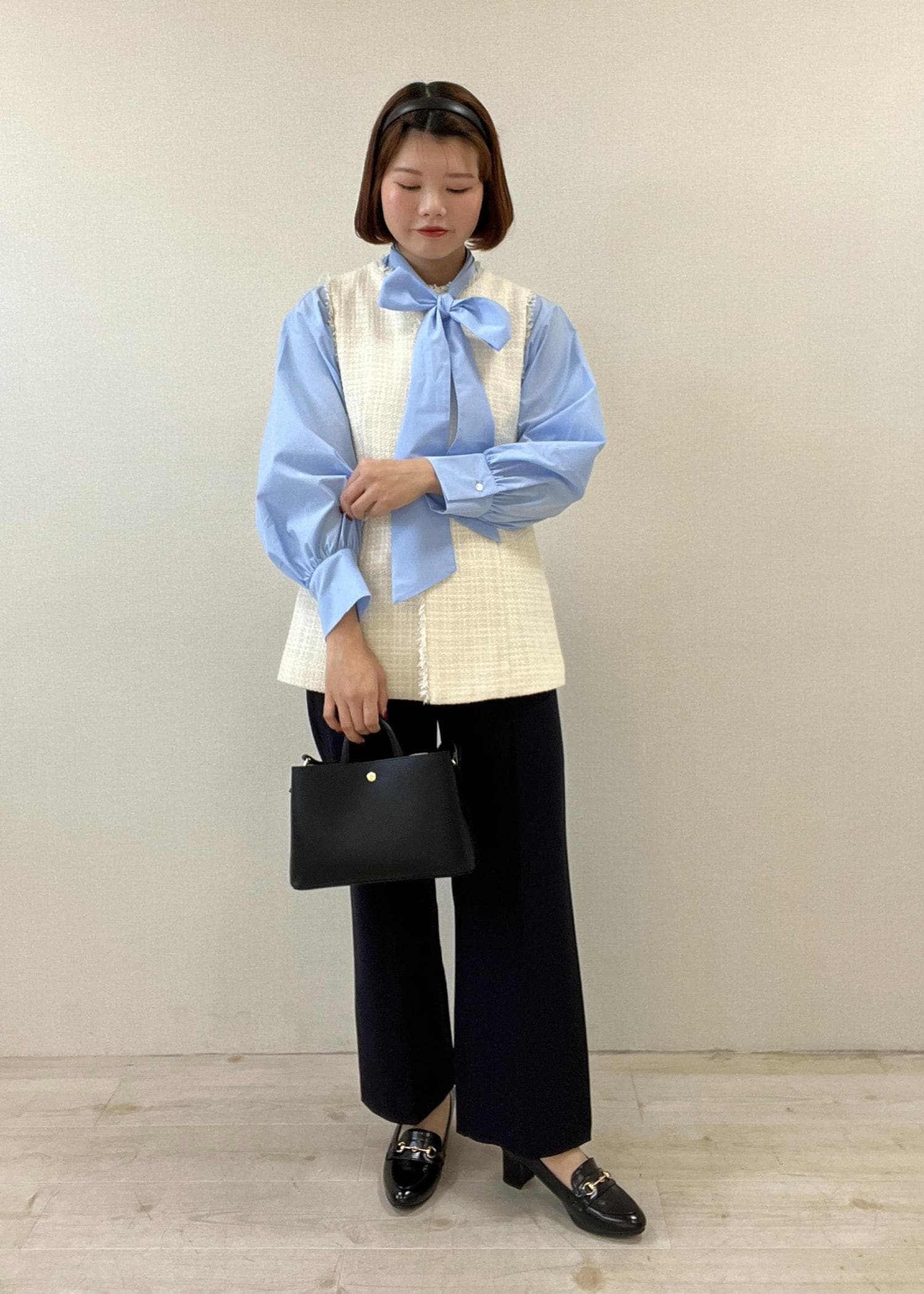 今回は入園/入学式に向けたコーディネートを組みたかったので、オフホワイトのツイードジレで華やかさをプラス◎
