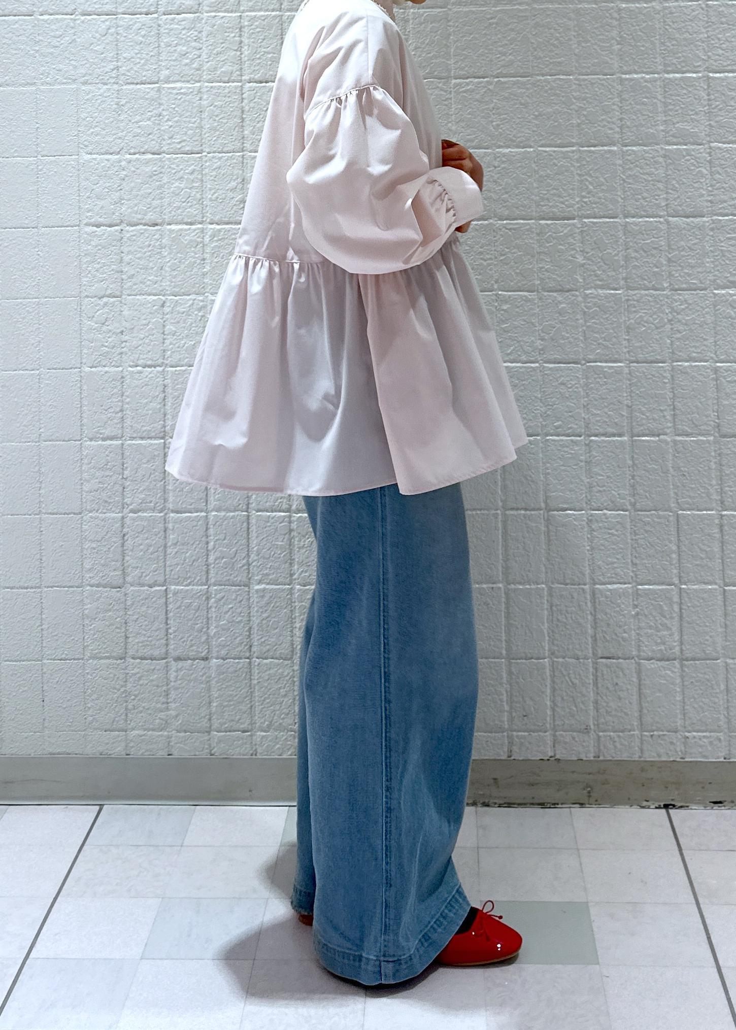 春らしいピンクのブラウスをつかったカジュアルコーデです。