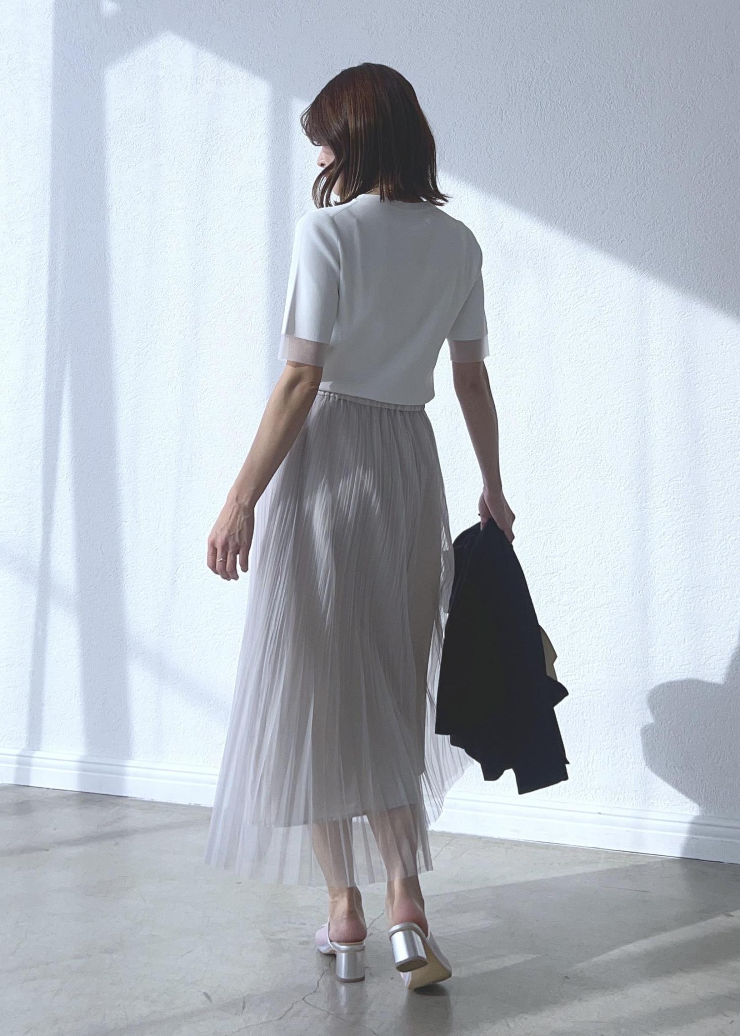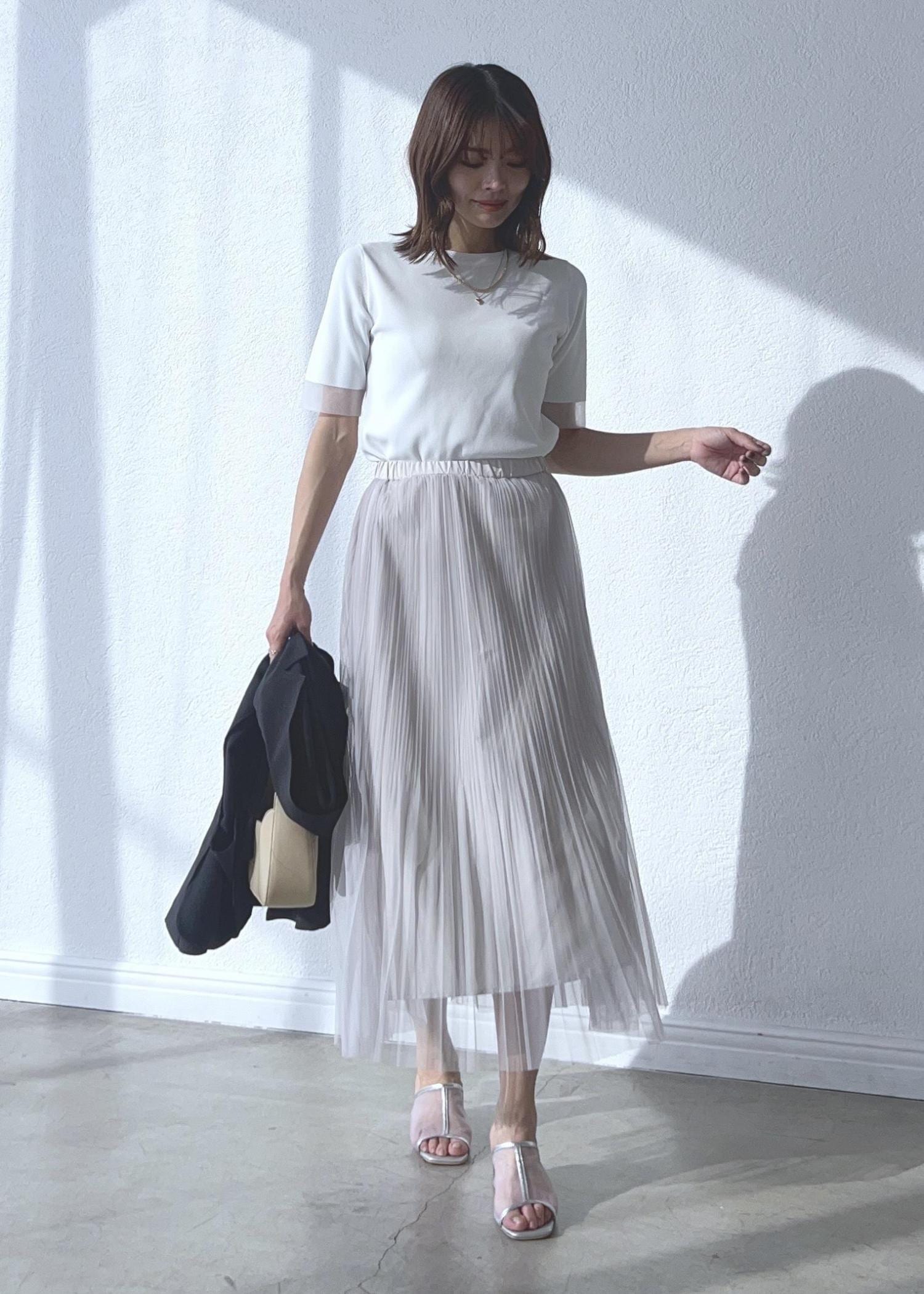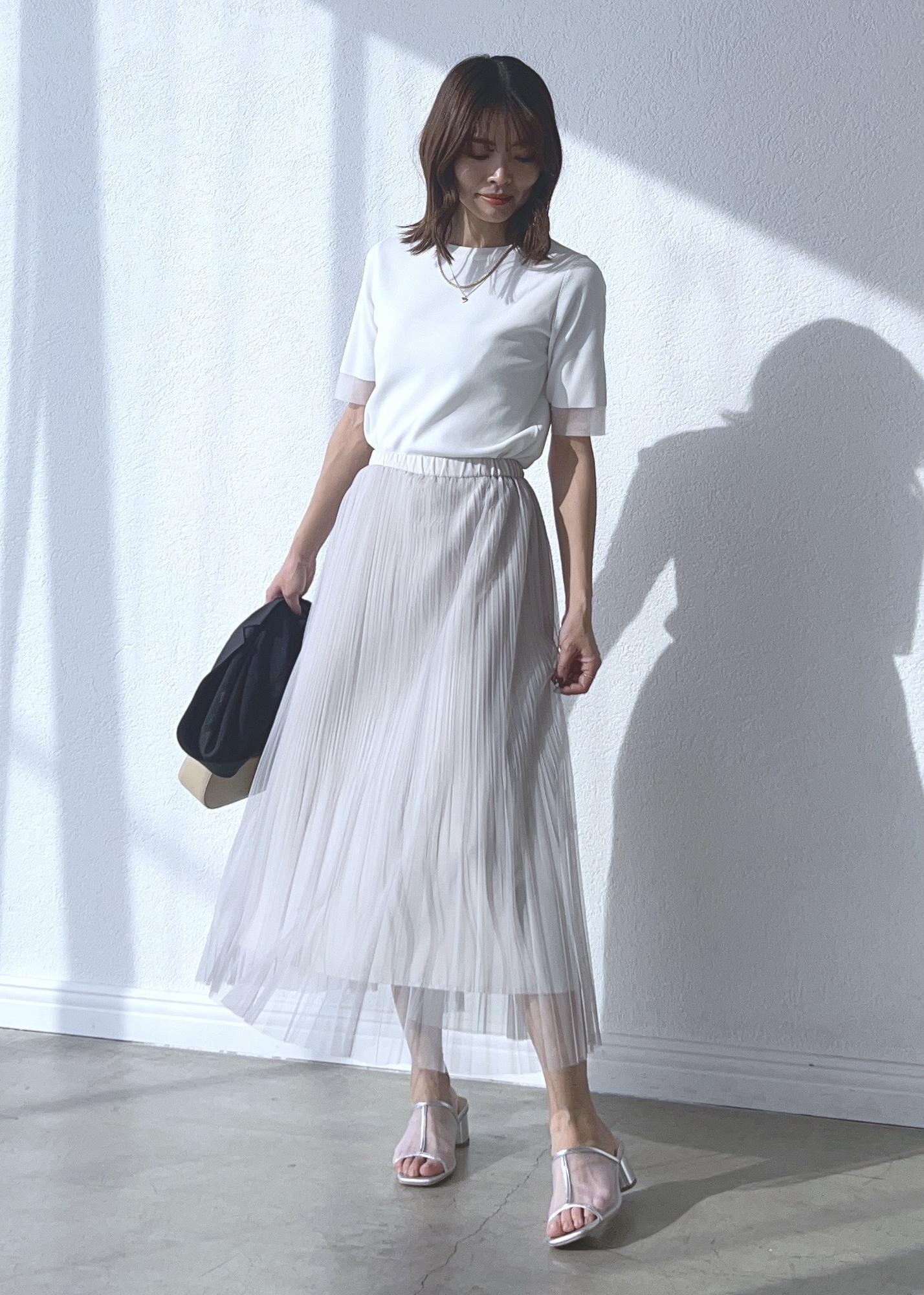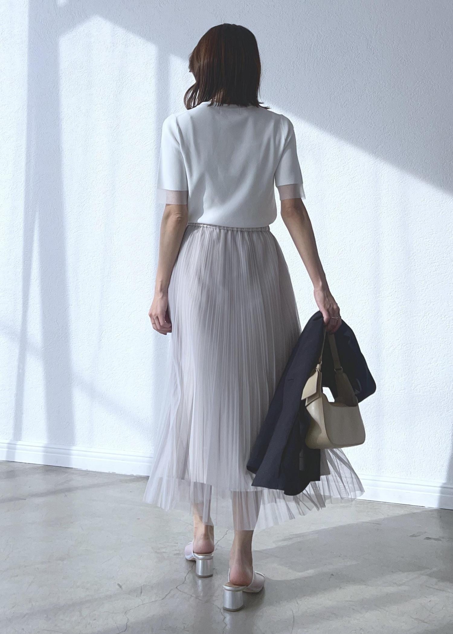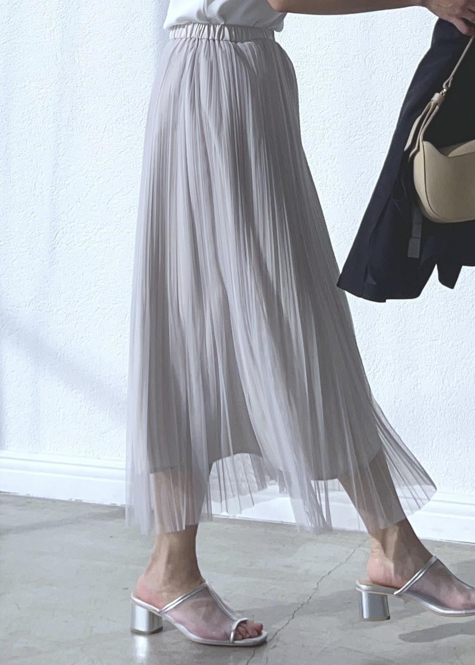 透け感のあるプリーツスカートは、揺れ感もあって華やかな表情のあるデザインがポイントです。