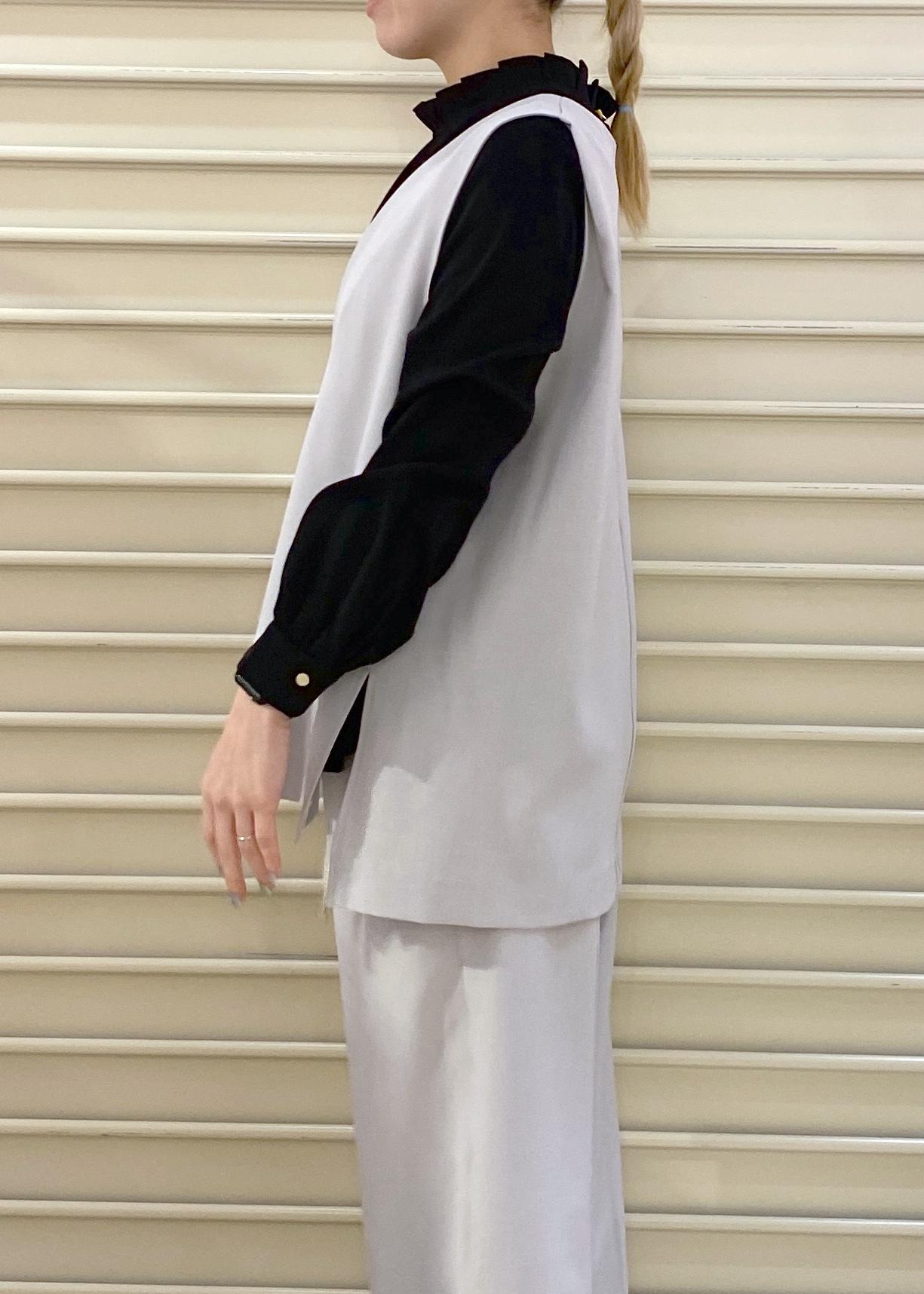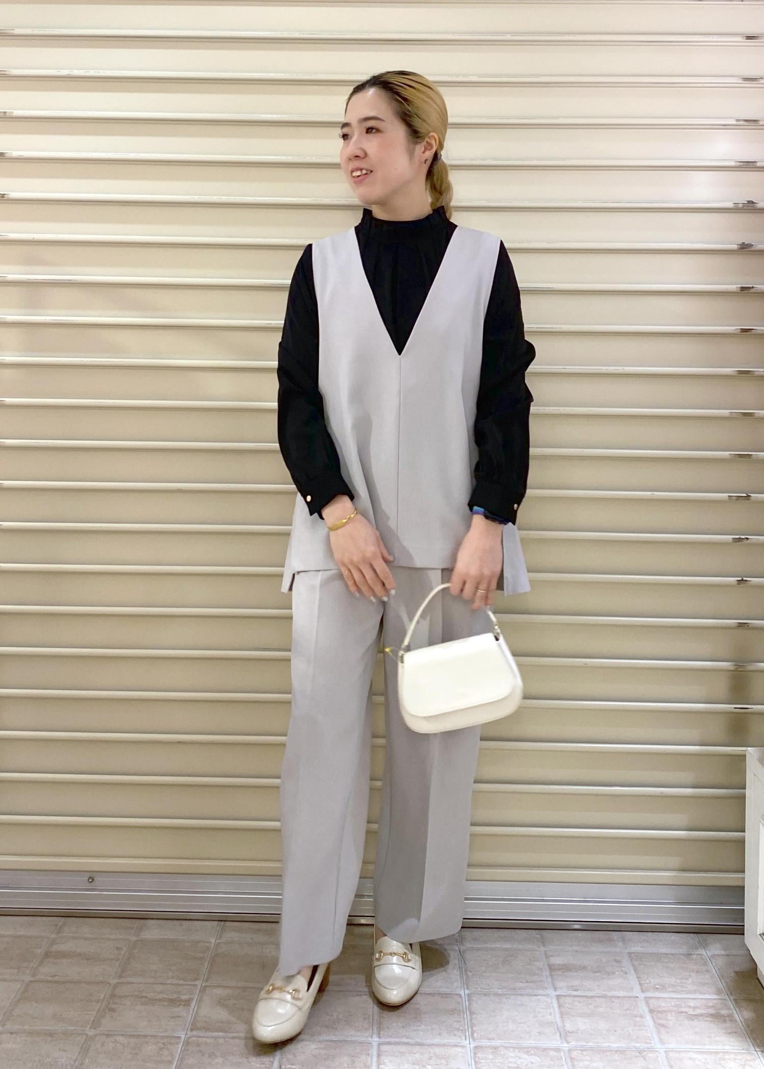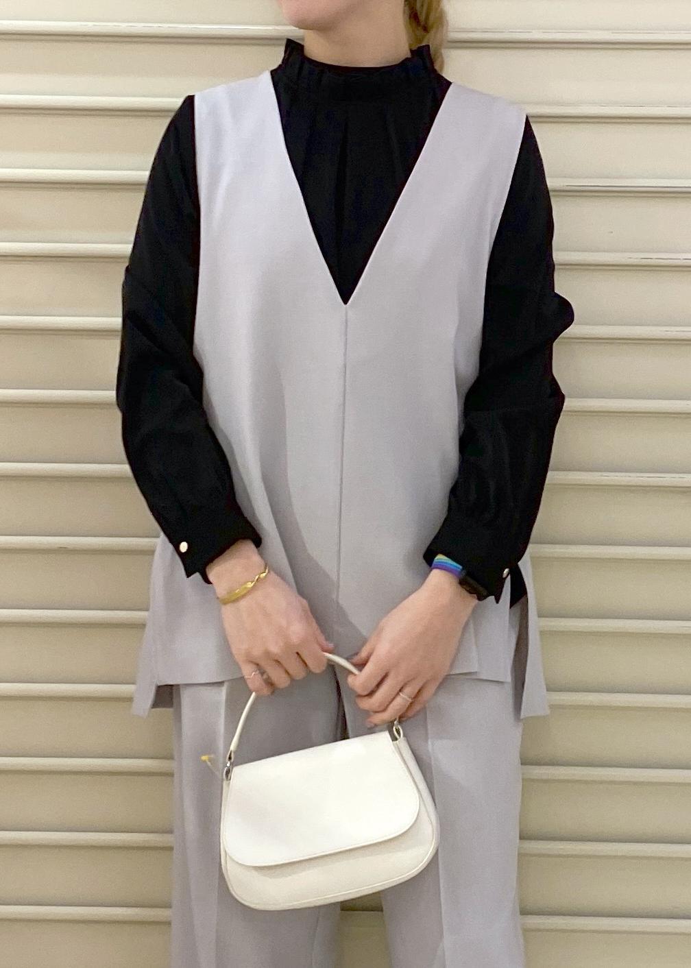 ジレは深めのVネックなので合わせるブラウスで雰囲気を変えられます。