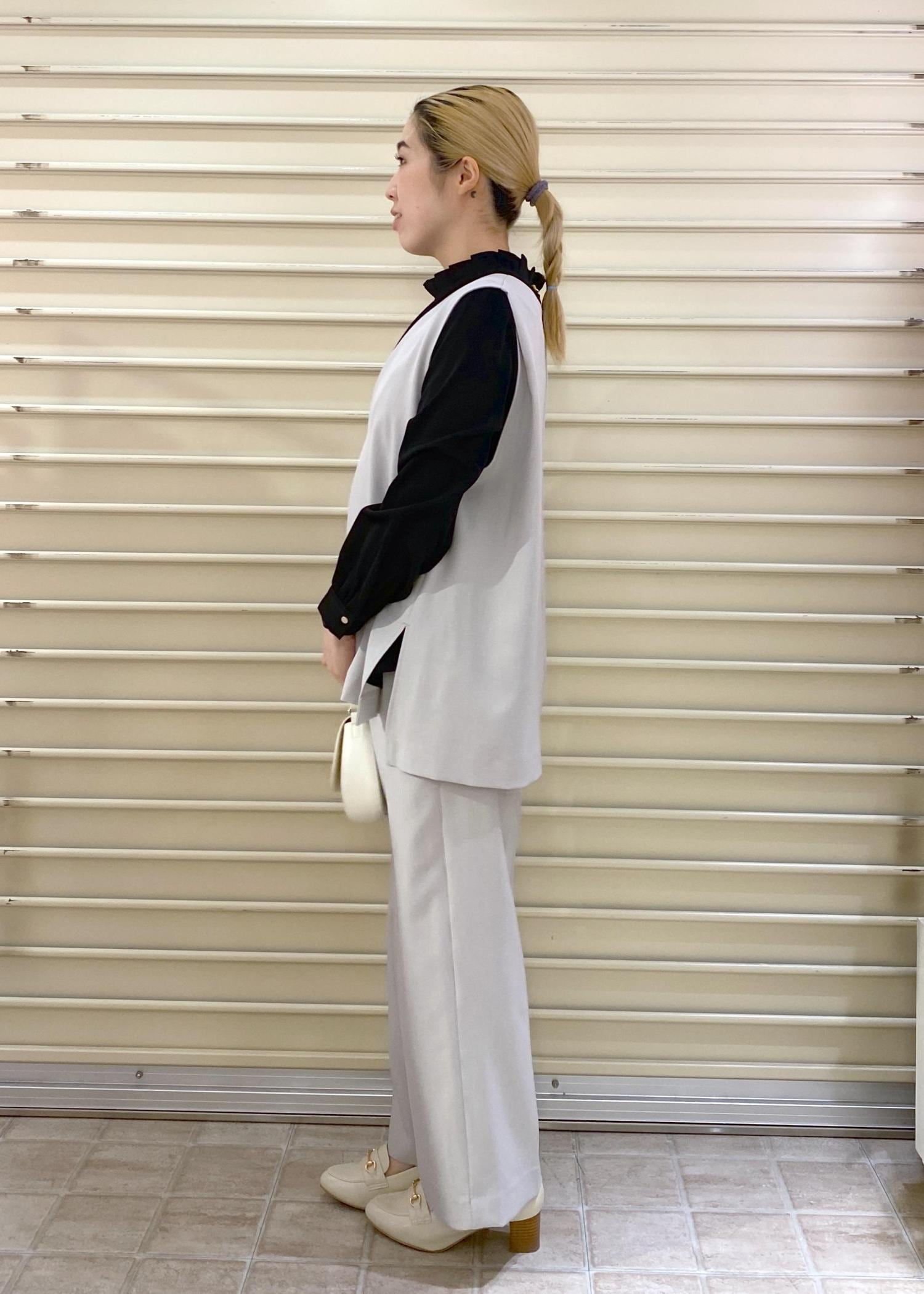 ワイドなパンツと長めのジレで体型カバーしてくれます。