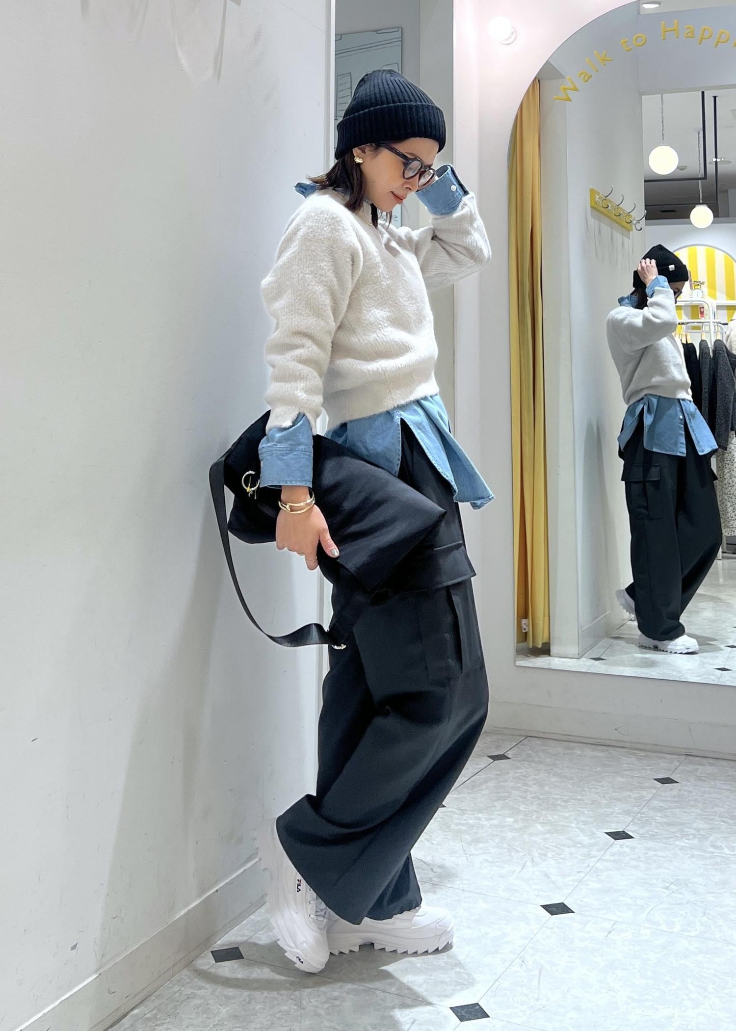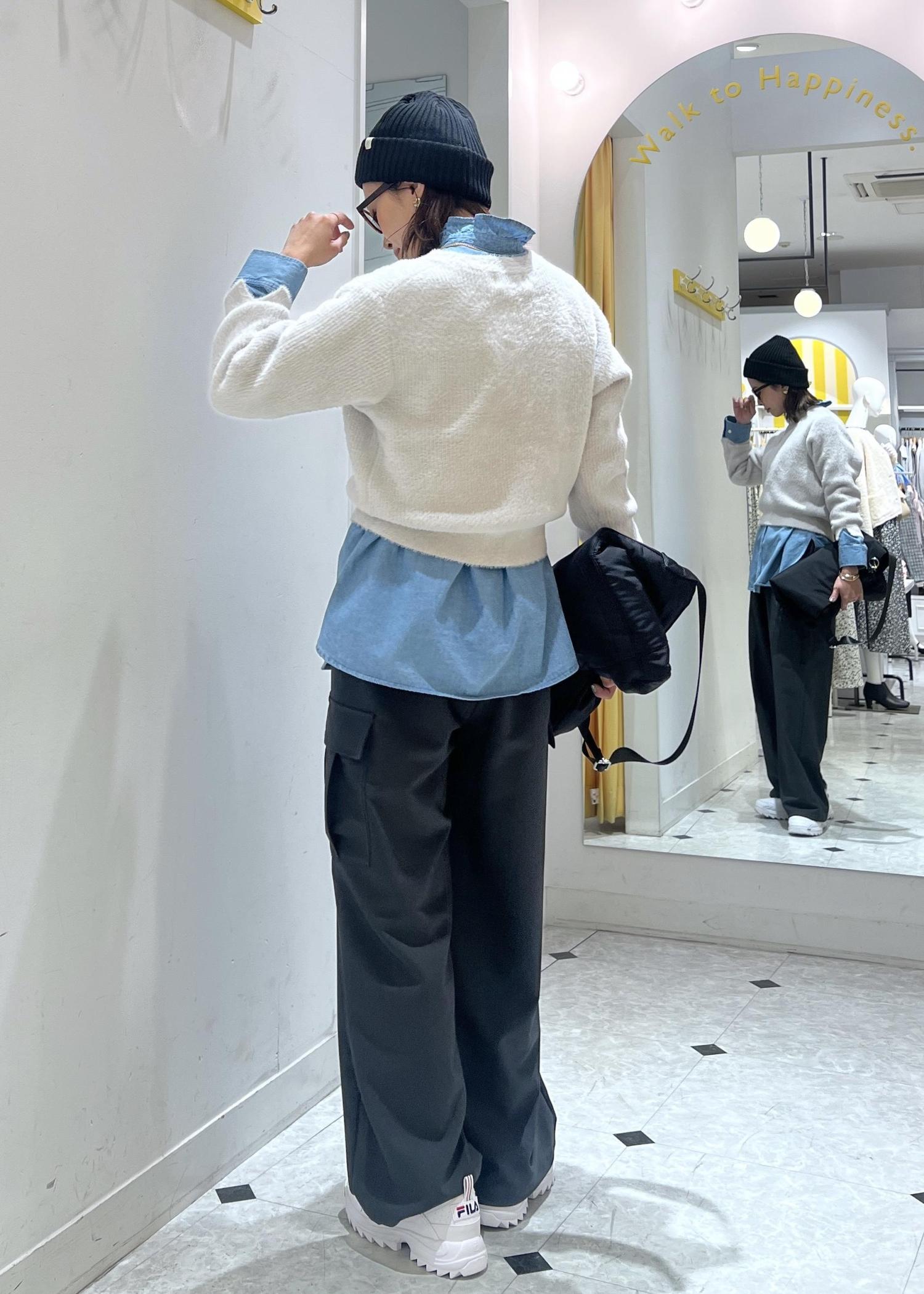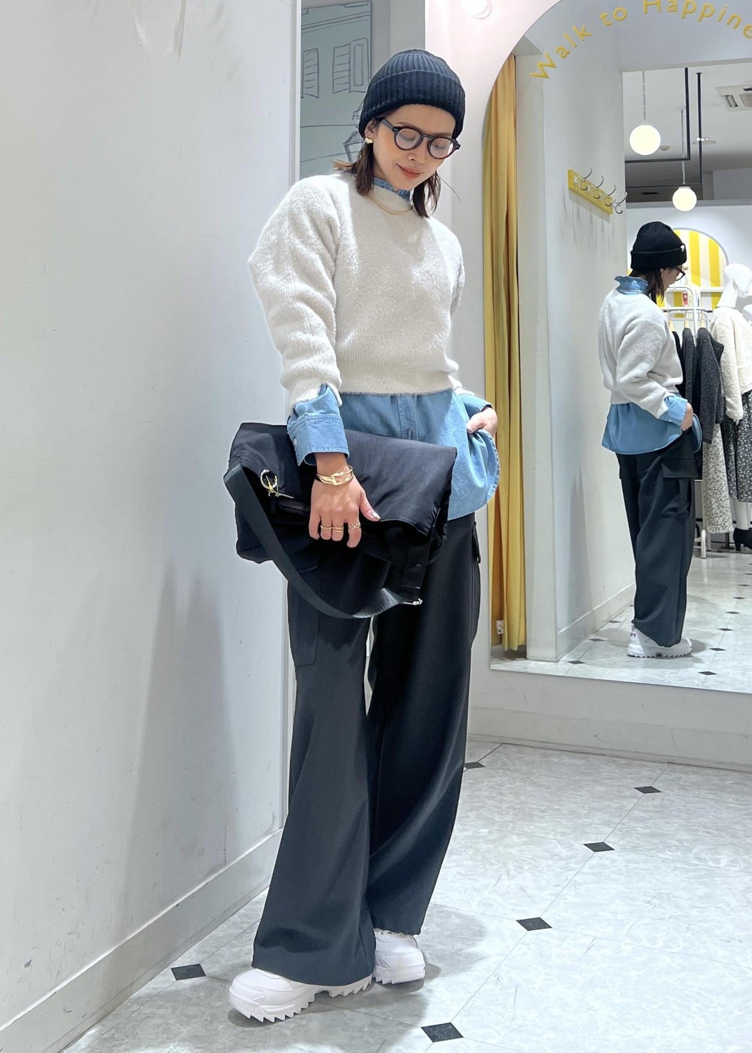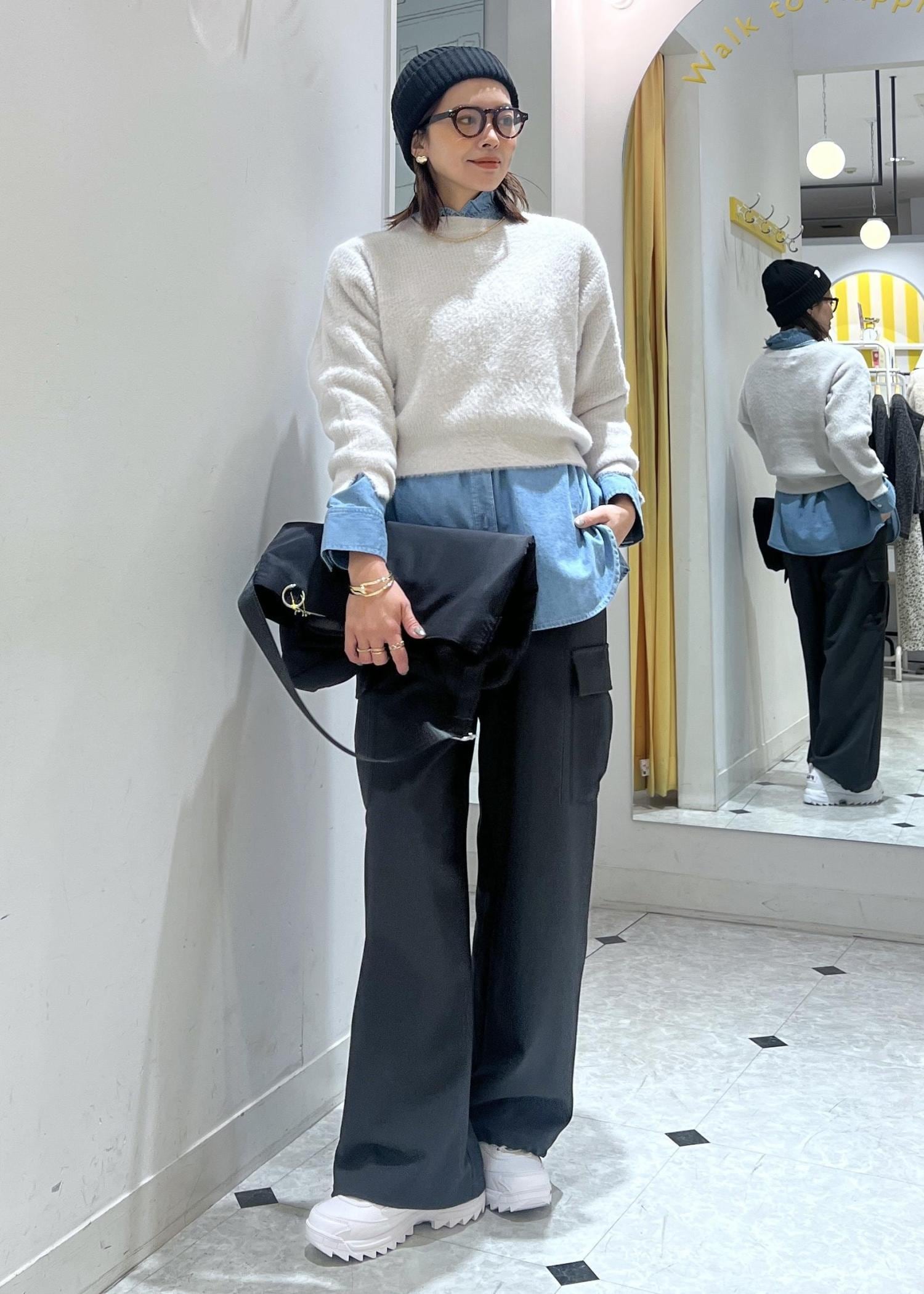 春まで着れるニットは、シャツをインして冬から着回しもできておすすめアイテム。