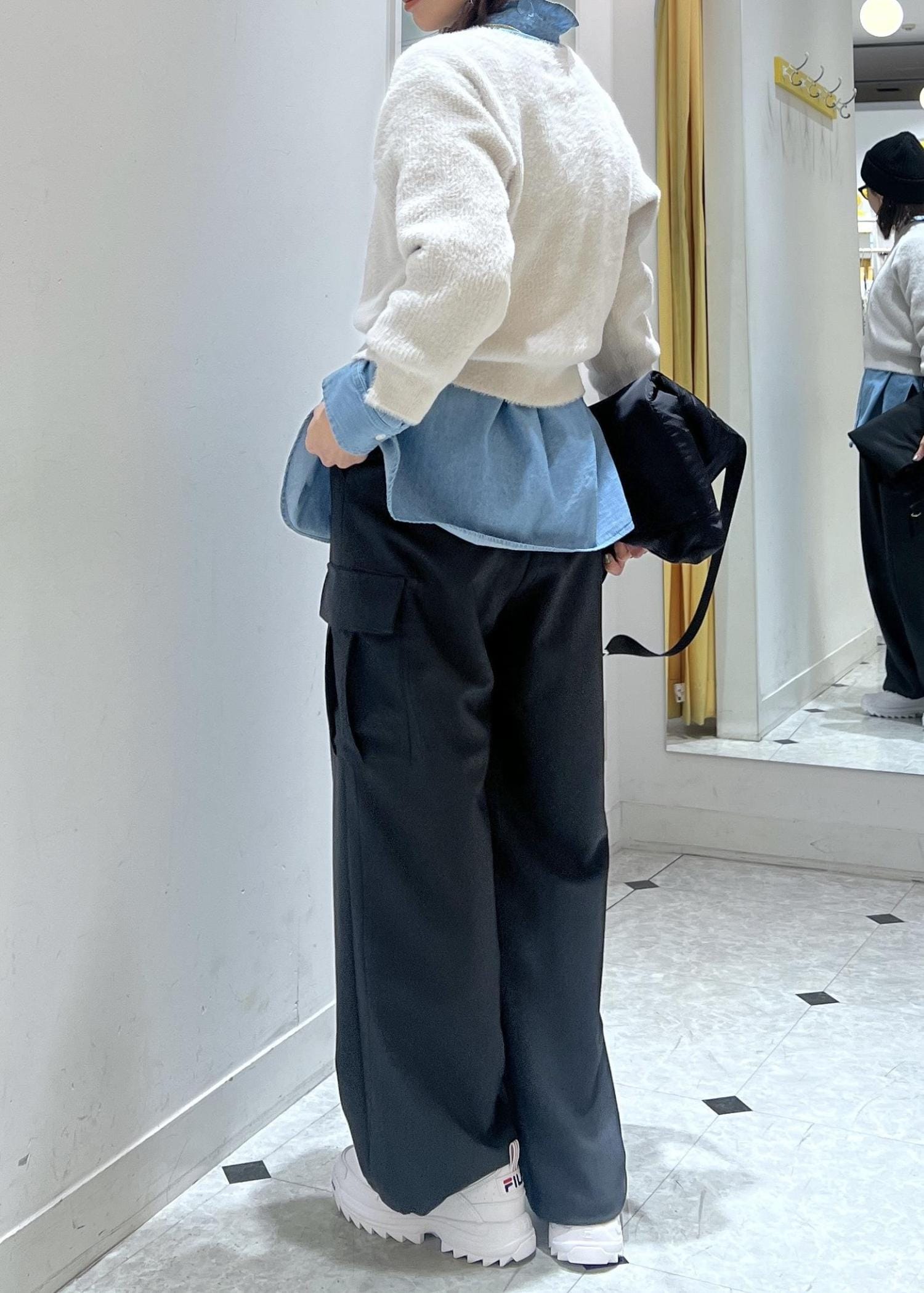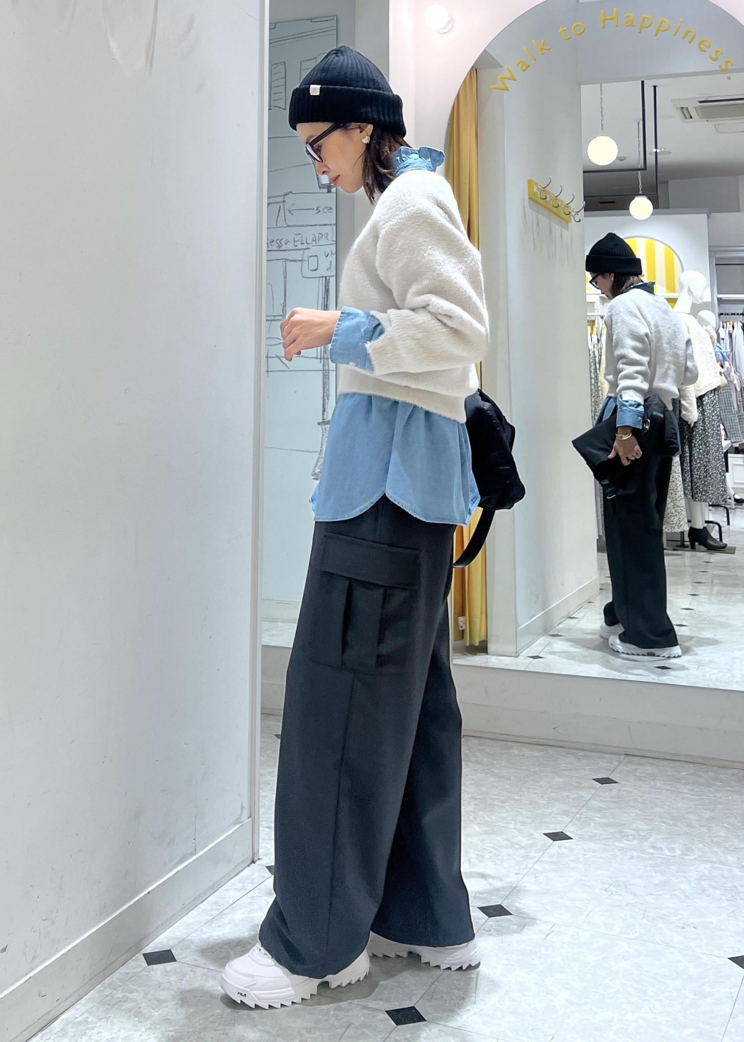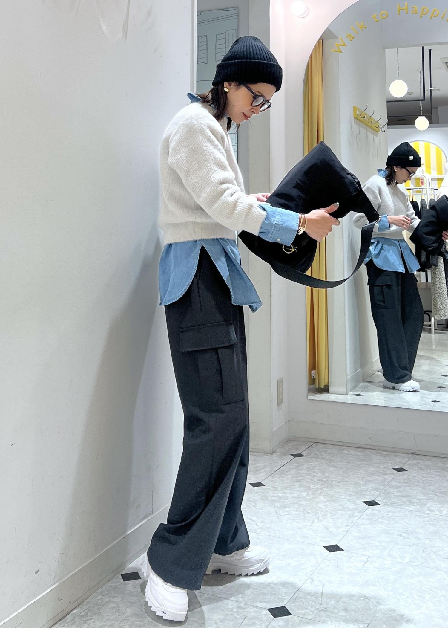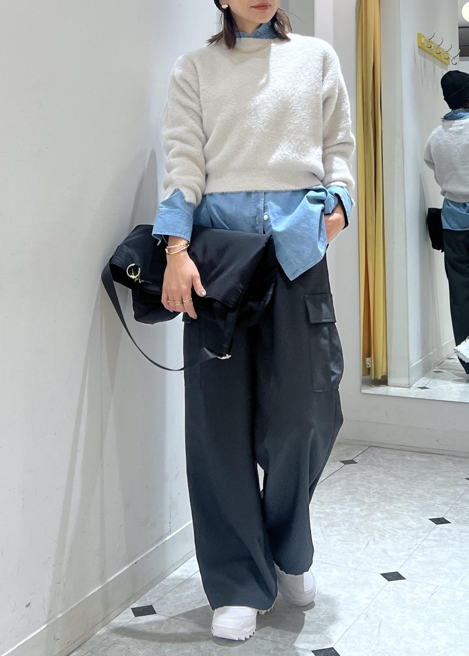 春まで着れるニットは、シャツをインして冬から着回しもできておすすめアイテム。