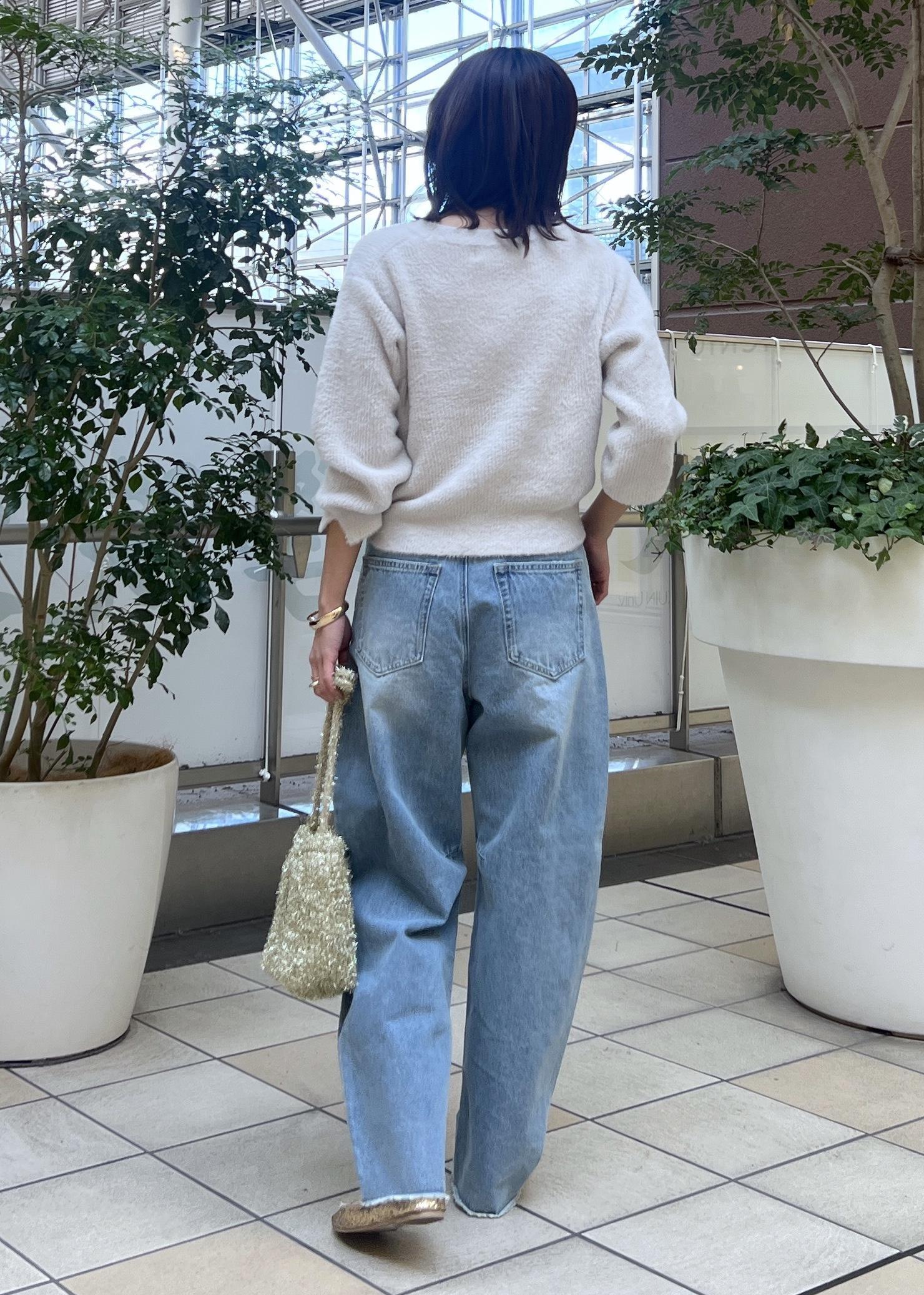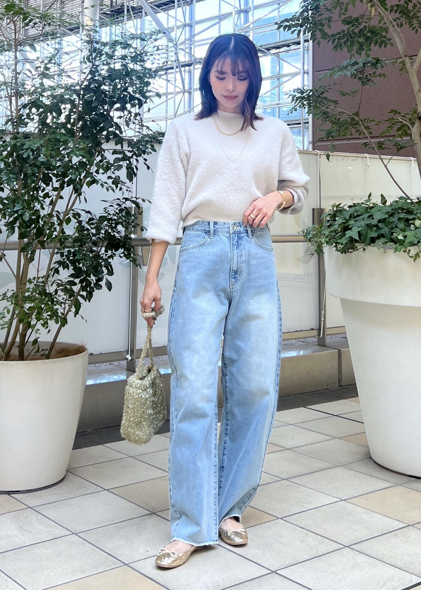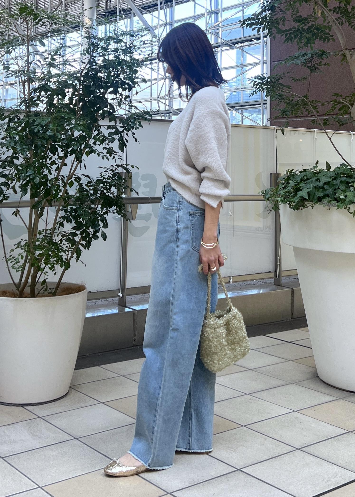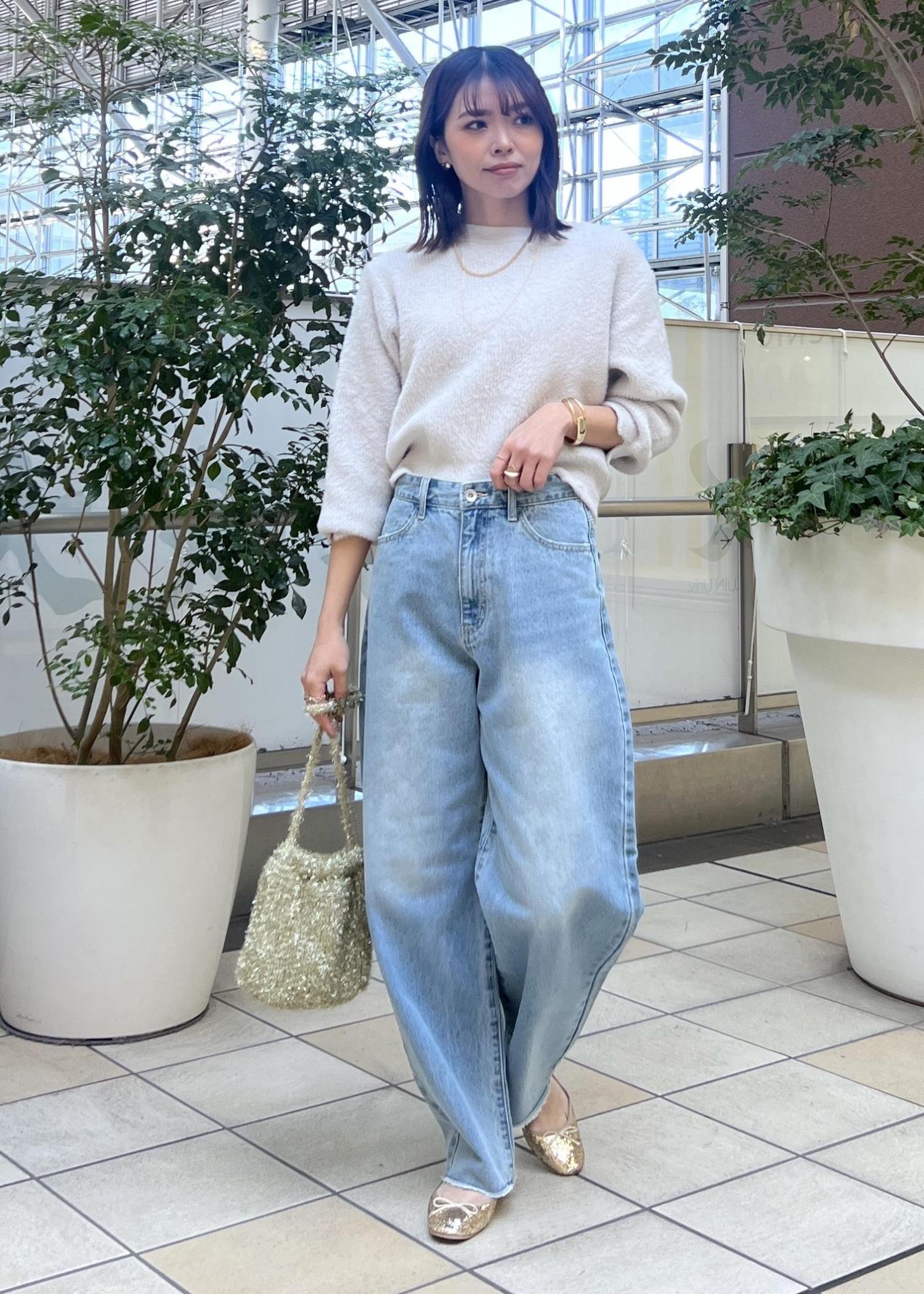 ニットにデニムのシンプルなコーデですが、ゴールドアイテムを小物にしてワンポイントにしました。