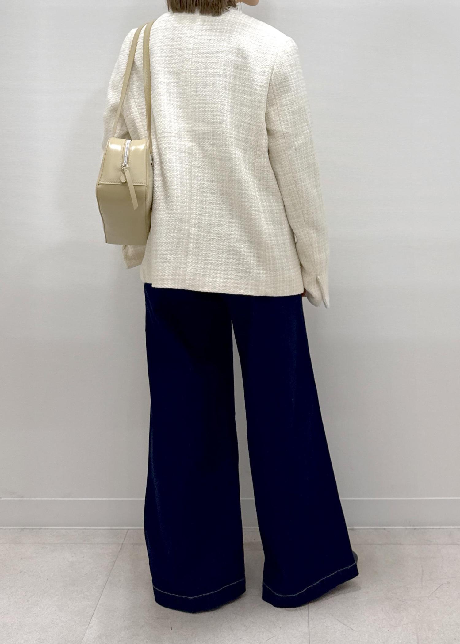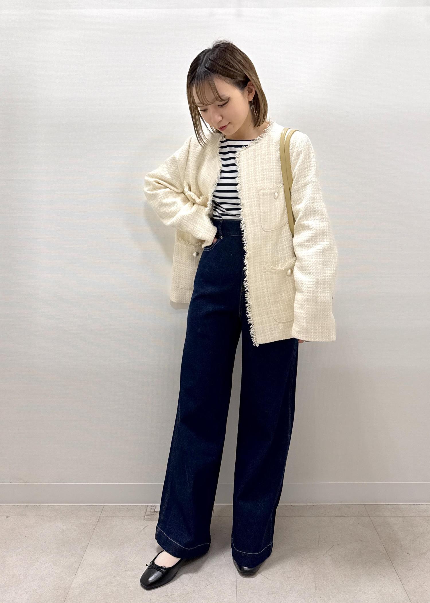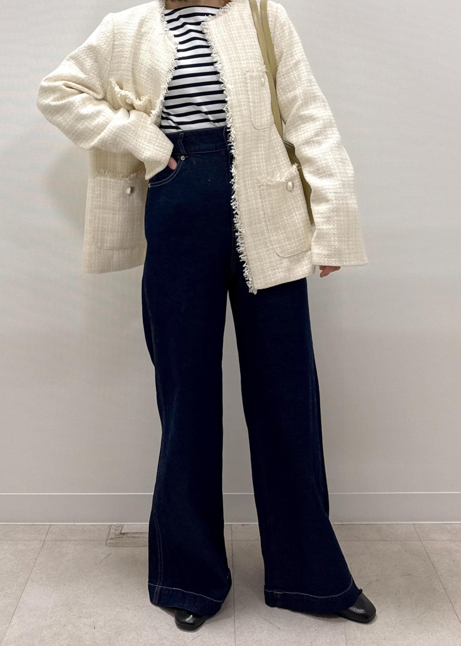 セレモニーにもおすすめなツイードジャケットをデニム、ボーダートップスで合わせたカジュアルコーデ☺︎