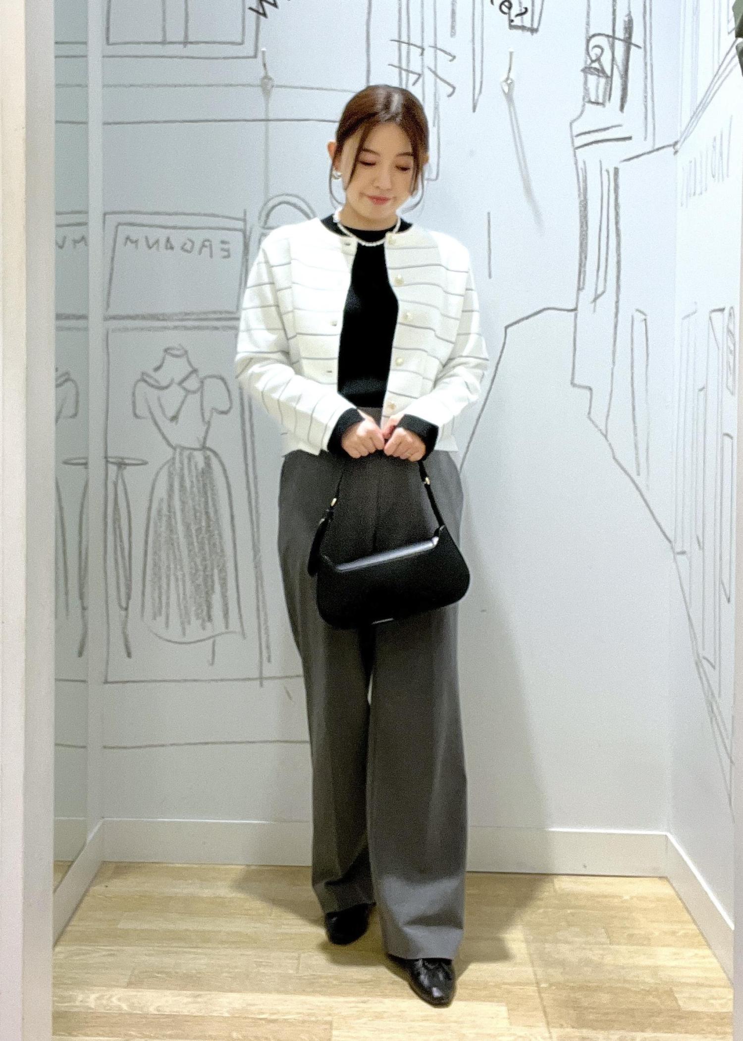 私の身長だと着丈は腰あたりくらいになります。コンパクトでスッキリみえします。きれいめにもカジュアルにも着ていただけるカーディガンです。 -