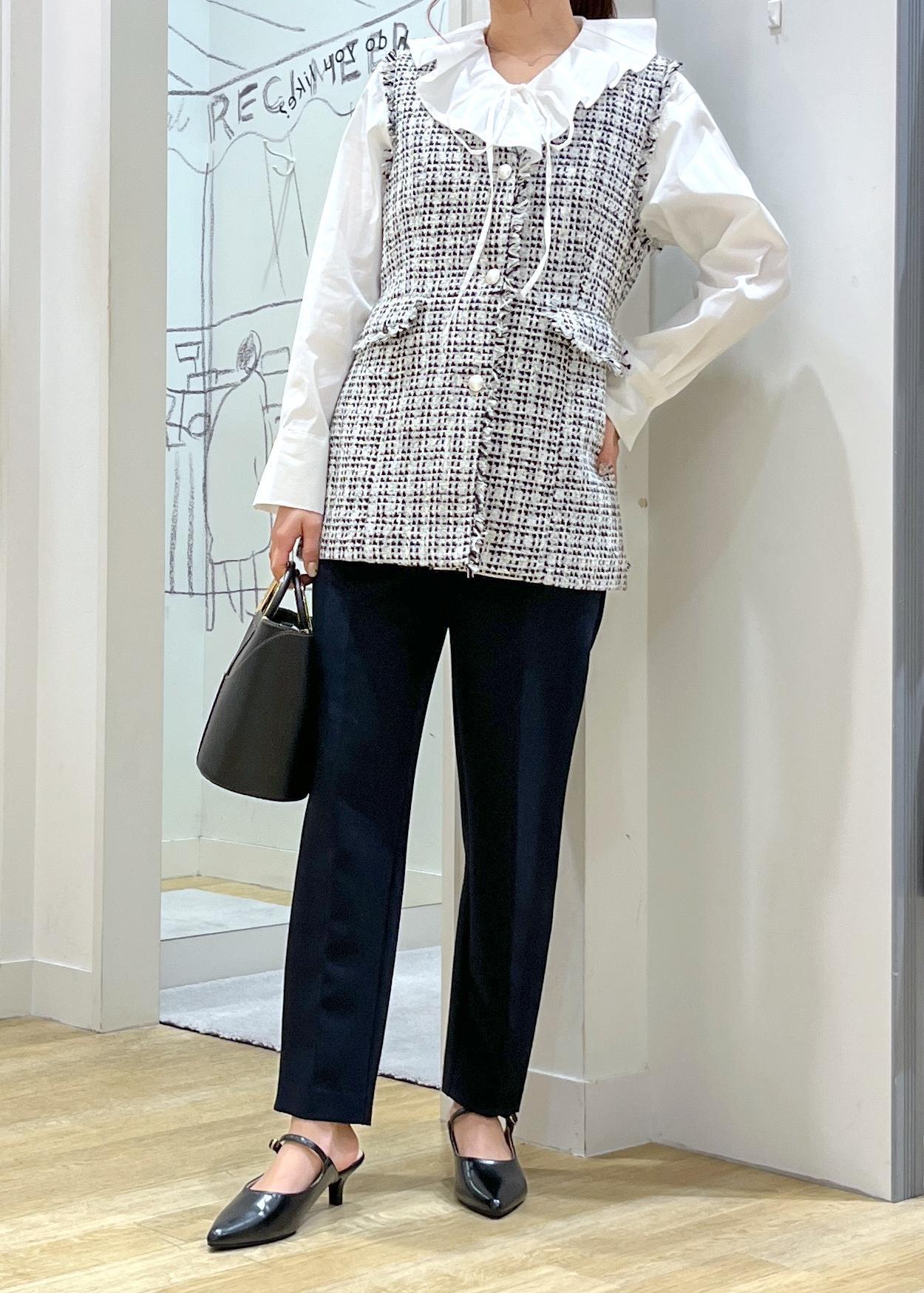胸元のデザイン特徴のブラウスと合わせて、華やかさを取り入れました。