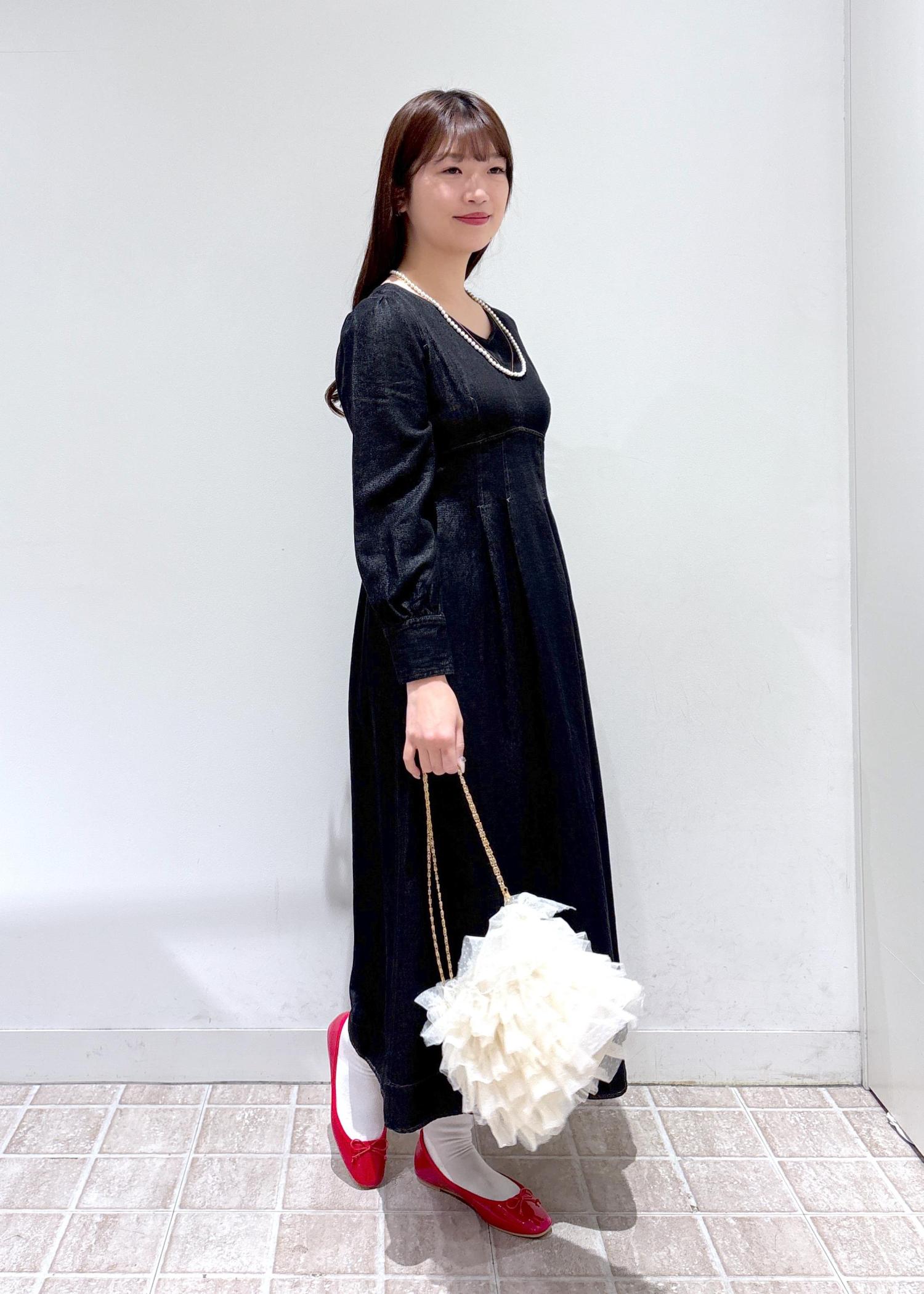 ブラックデニムに小物はパールやチュールアイテムを合わせて、甘さをプラスしました◎