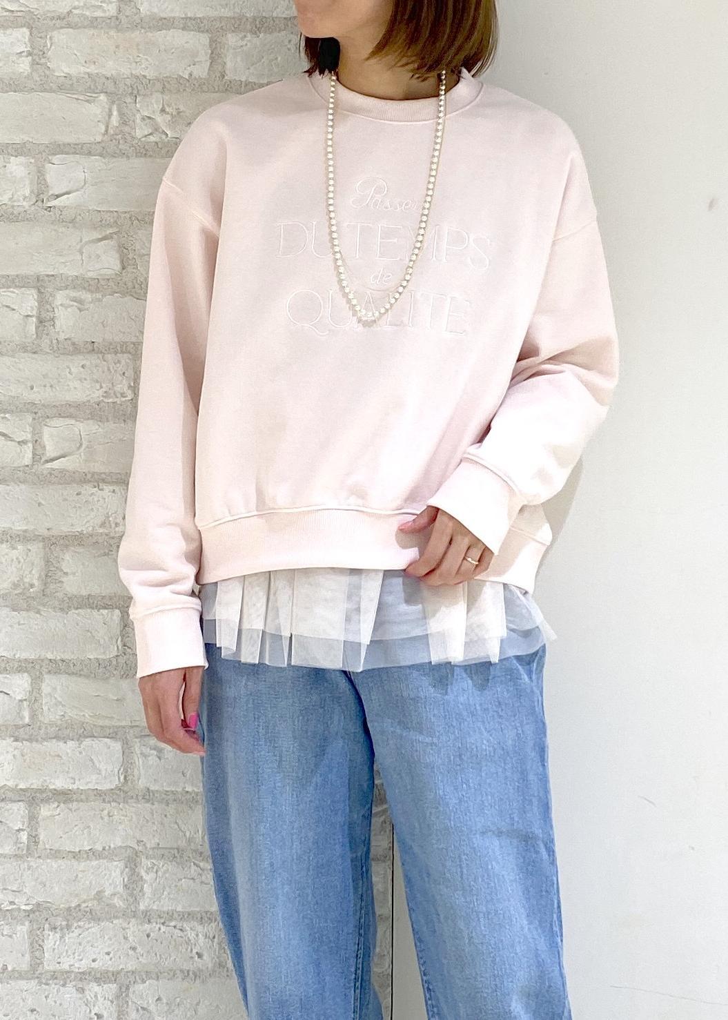 ピンク色のスウェットを重ねたカジュアルコーデ。