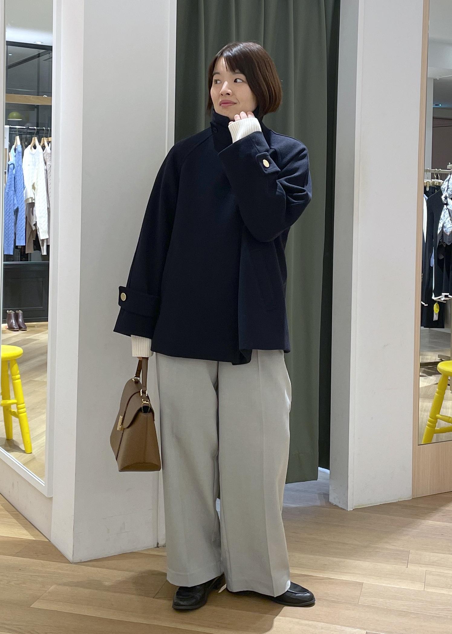 ボトムは脚のラインがきれいに見えるネイビーのワイドパンツを合わせて、スマートに大人な印象でまとめました◎