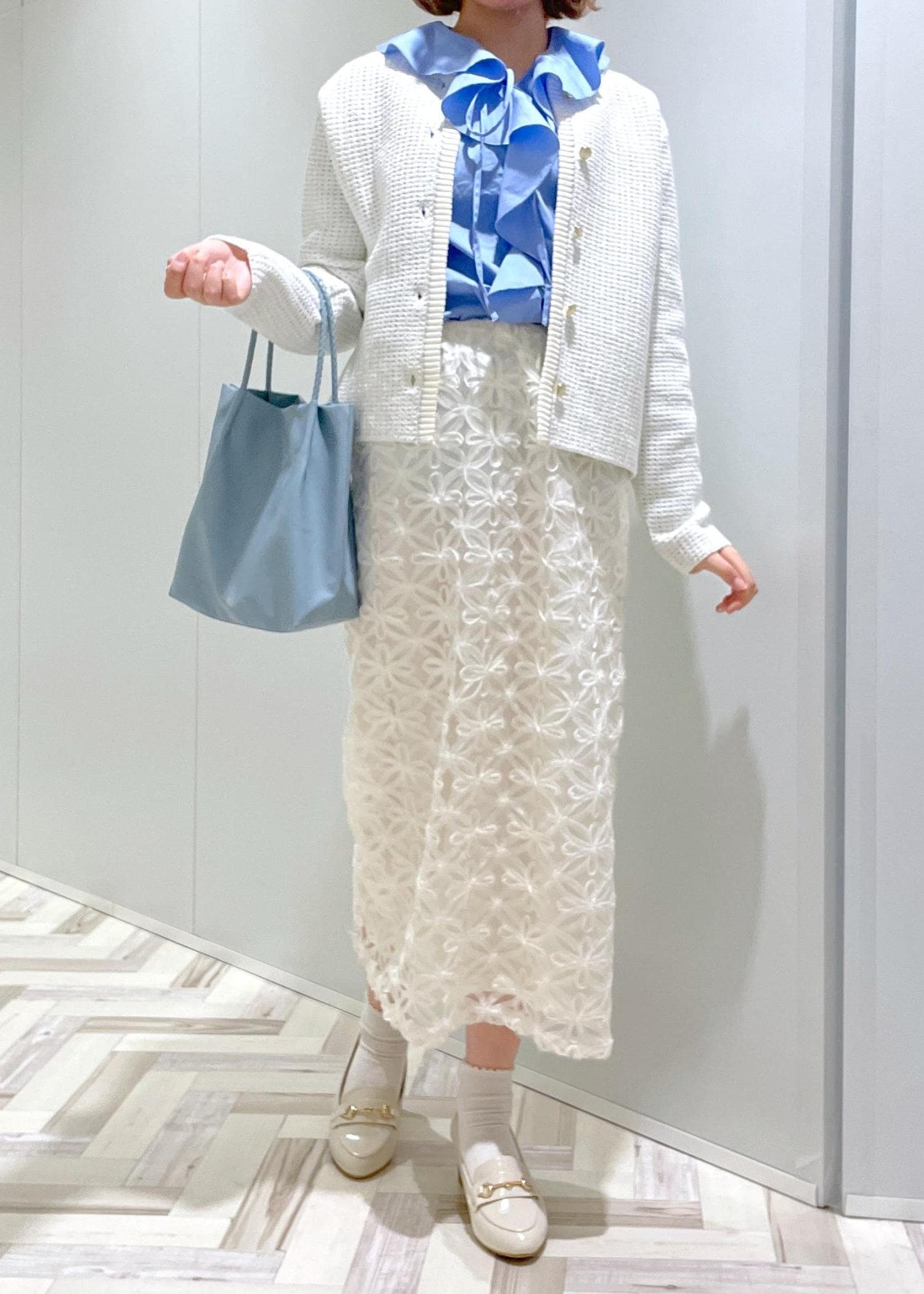 フリルブラウスとスカートで可愛らしさを出しつつ、キレイめカーディガンで纏めてます◎