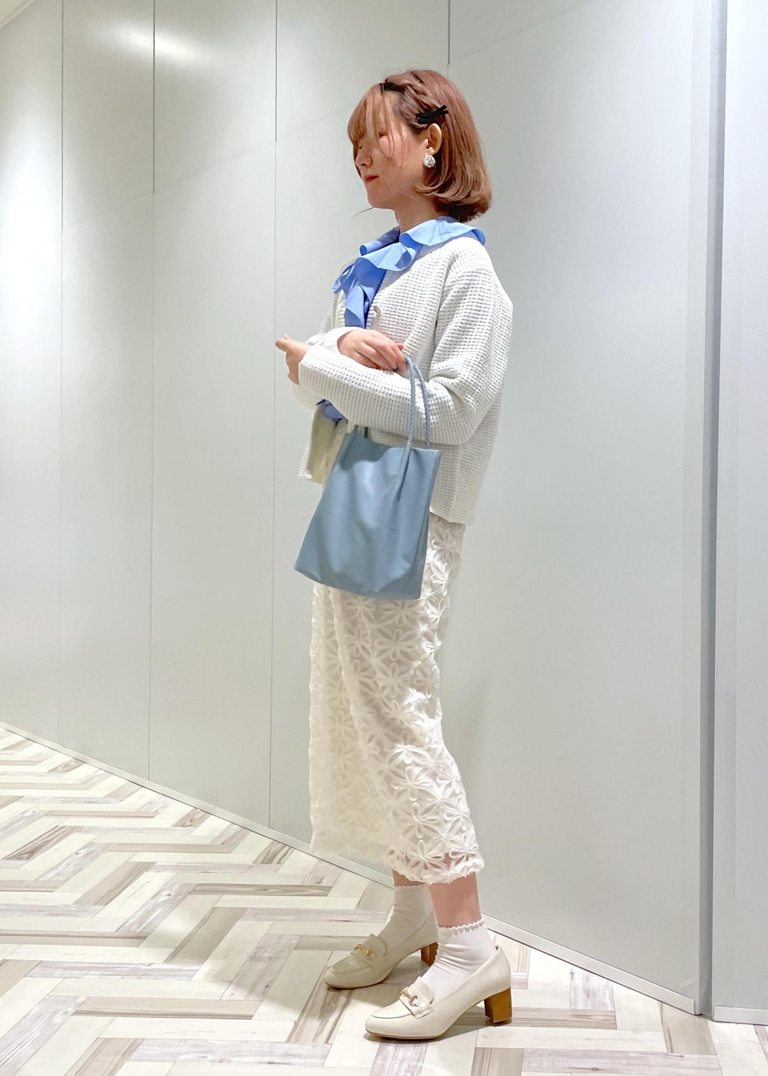 ツイード素材のカーディガンを合わせて今からでも着れる春アイテムのコーディネートです。