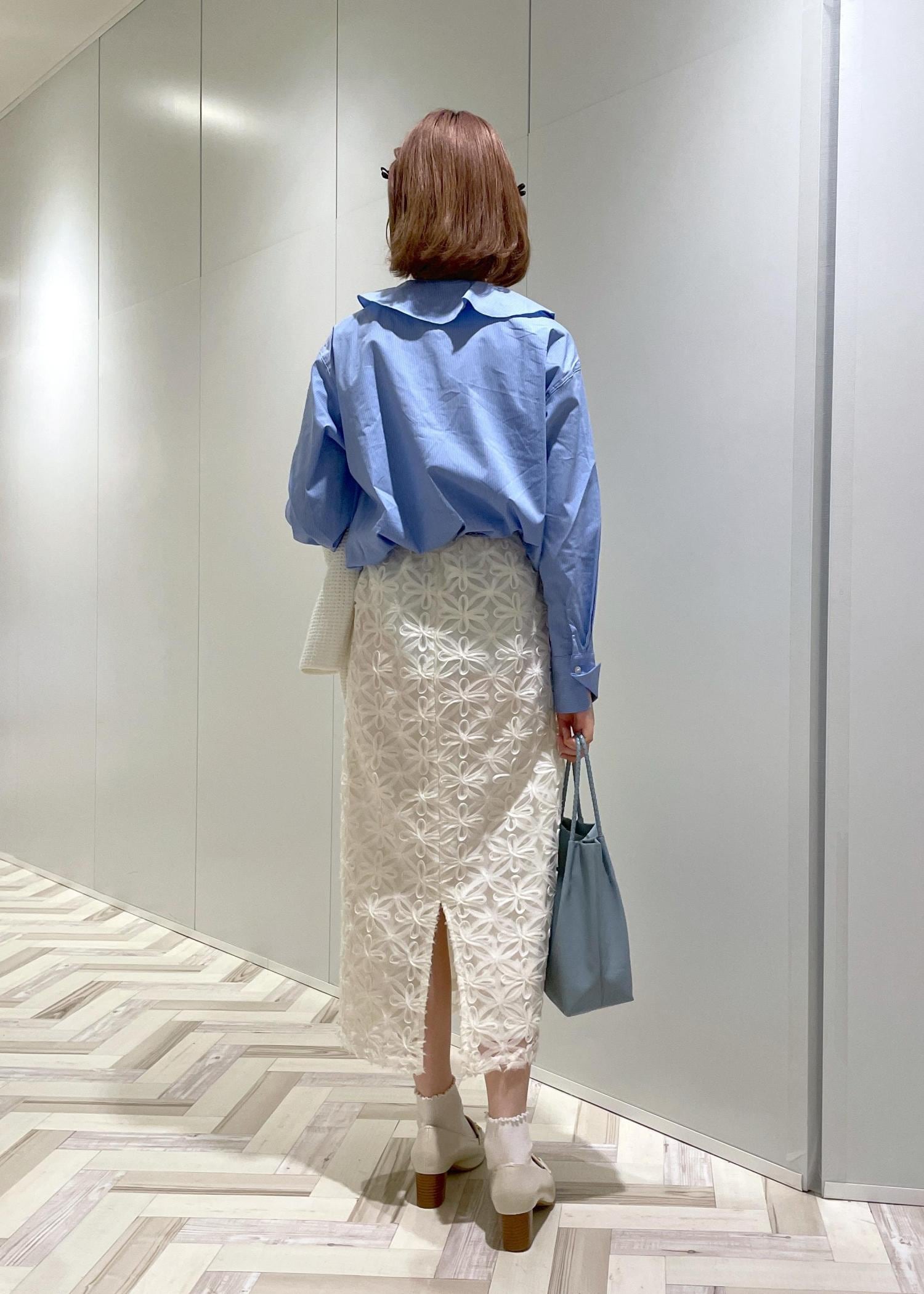 春らしい明るい水色のブラウスと、花柄のチュールスカート。