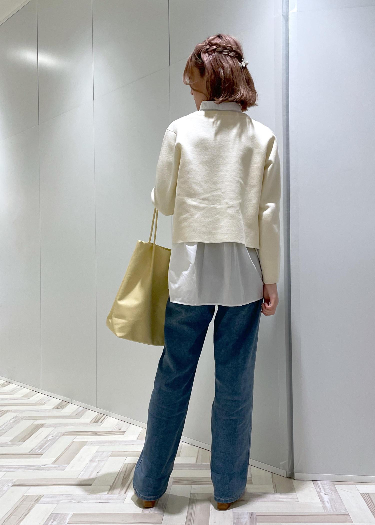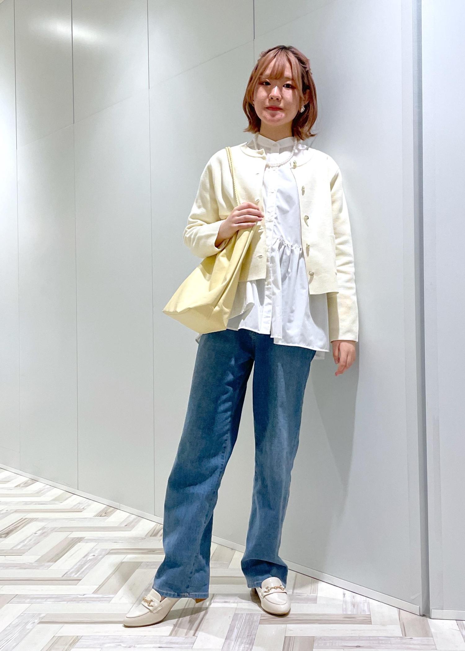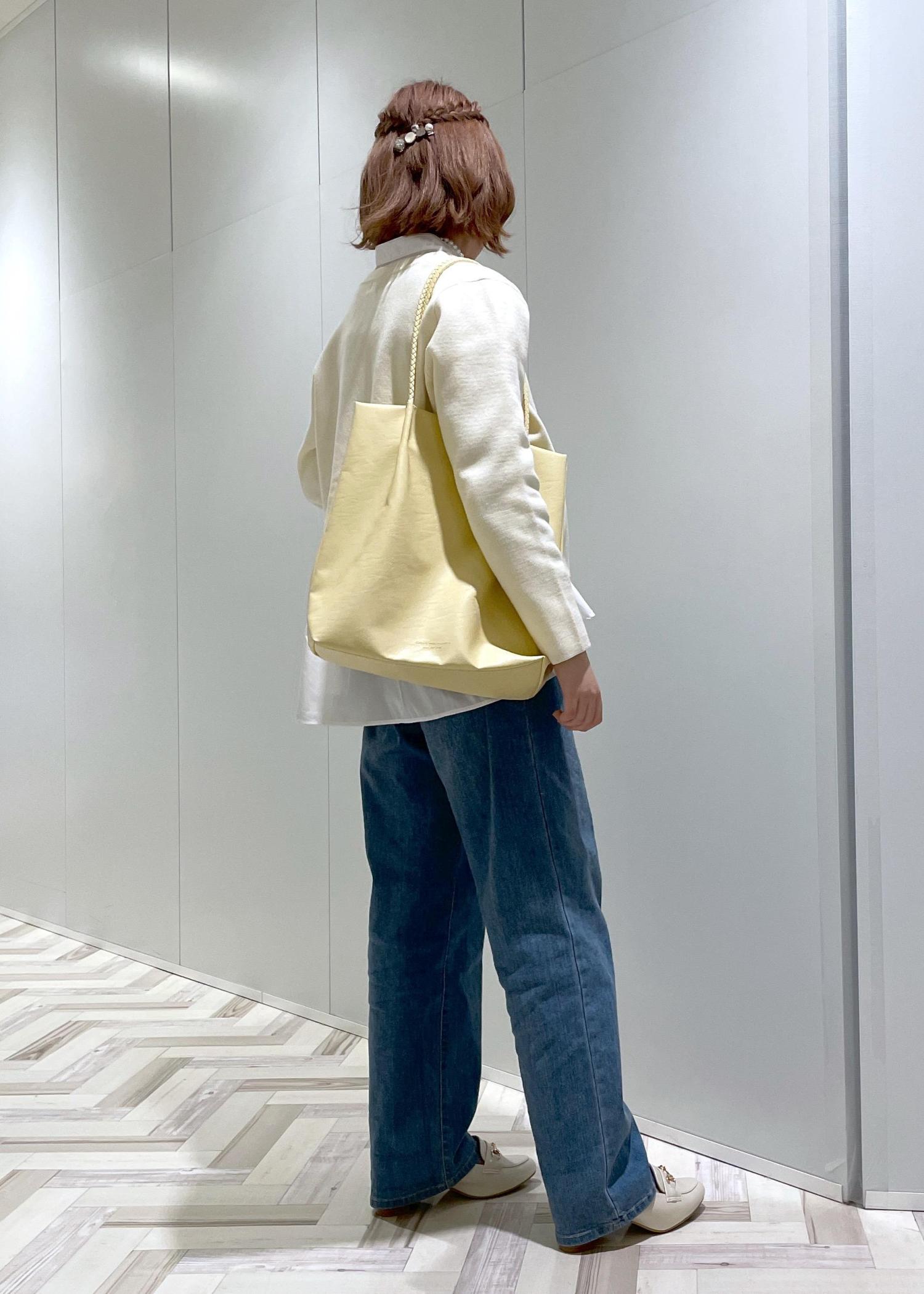 パッと明るい印象になるイエローのバッグや、カーディガンを使ったコーディネートです。