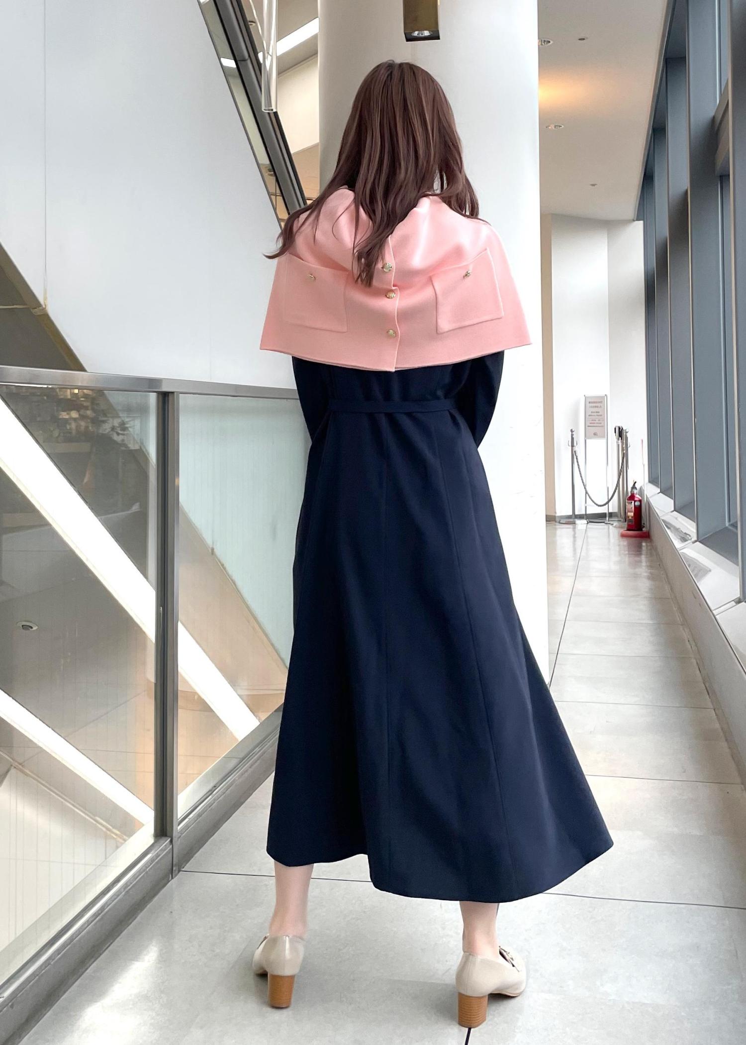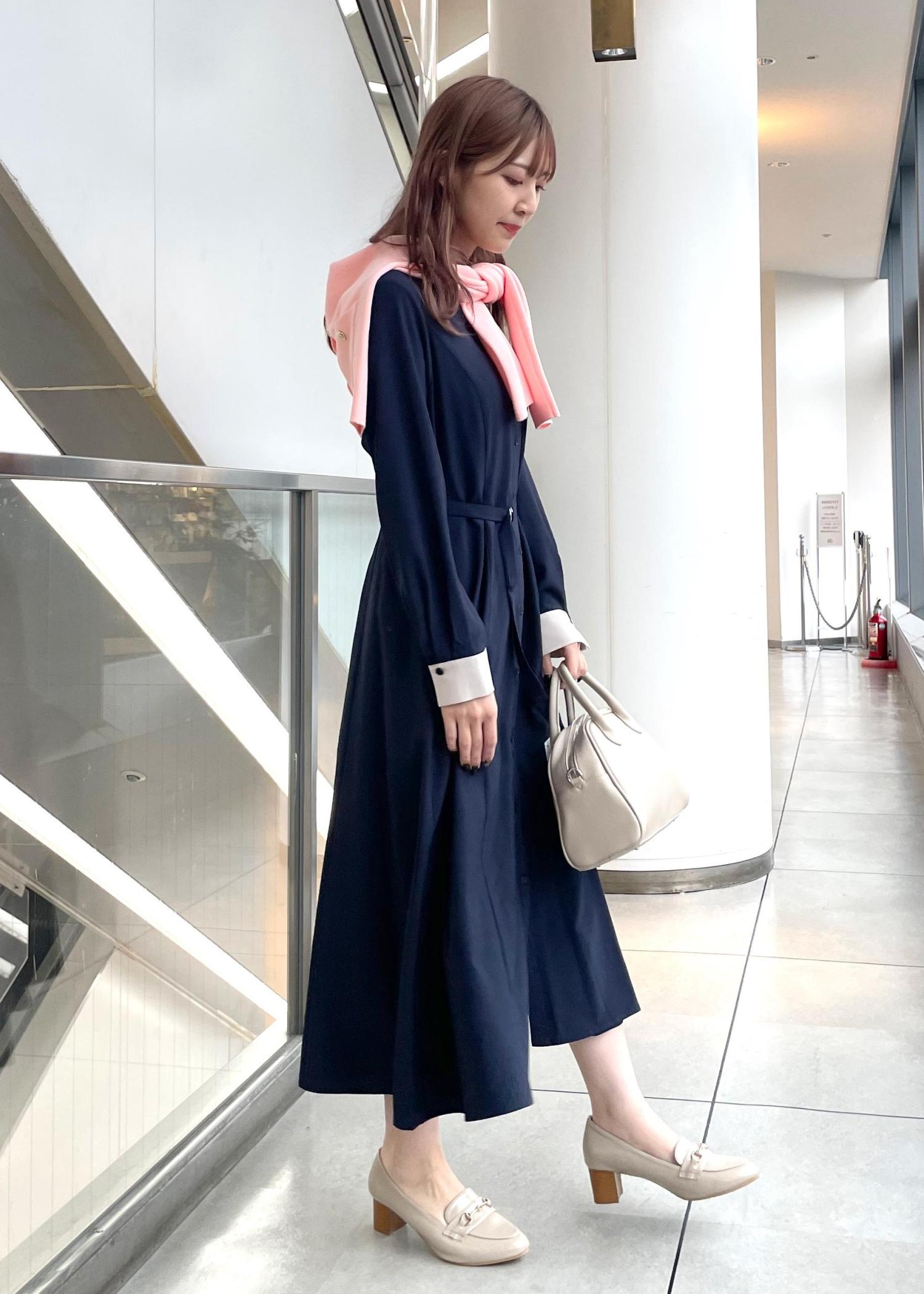 一枚でサマになるワンピースに、ワンポイントのカーディガンを合わせた春のスタイル。ちょっとした食事会やお出かけにピッタリです。
