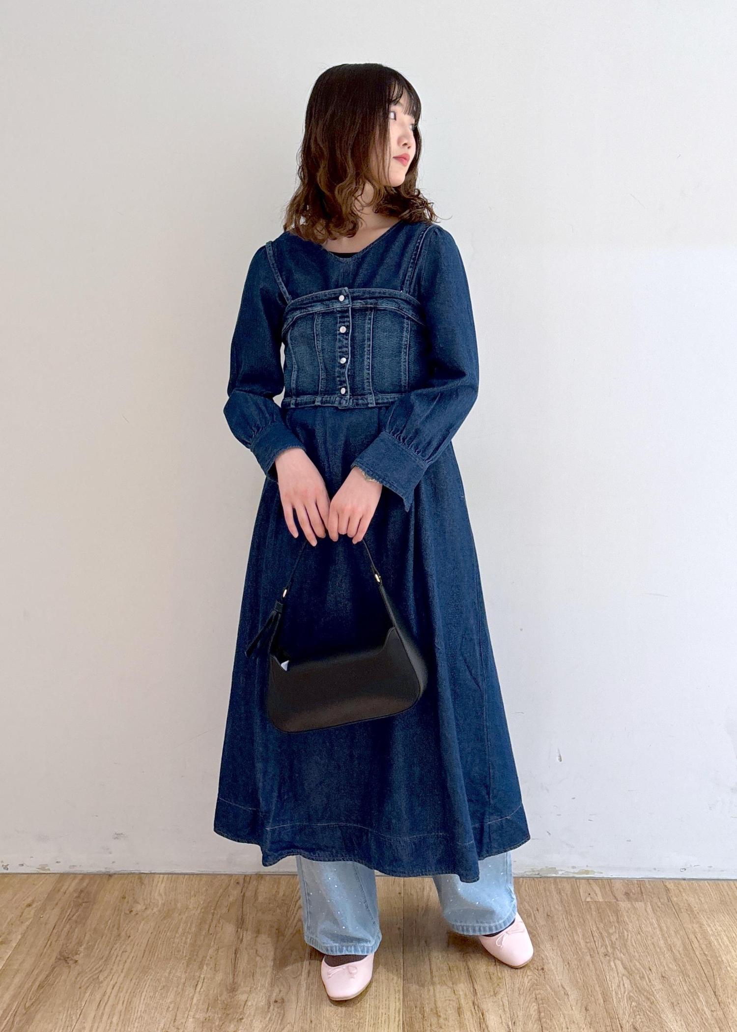 デニムワンピースとデニムビスチェでセットアップ風にコーディネートしてみました!デニムアイテムをレイアードすると重くなりすぎかなと思うかもしれませんがデニムの色みを変えるだけで重すぎず統一感のまとまる組み合わせなのでおすすめです!小物にアクセントになる色物を合わせるとより⭕️です!