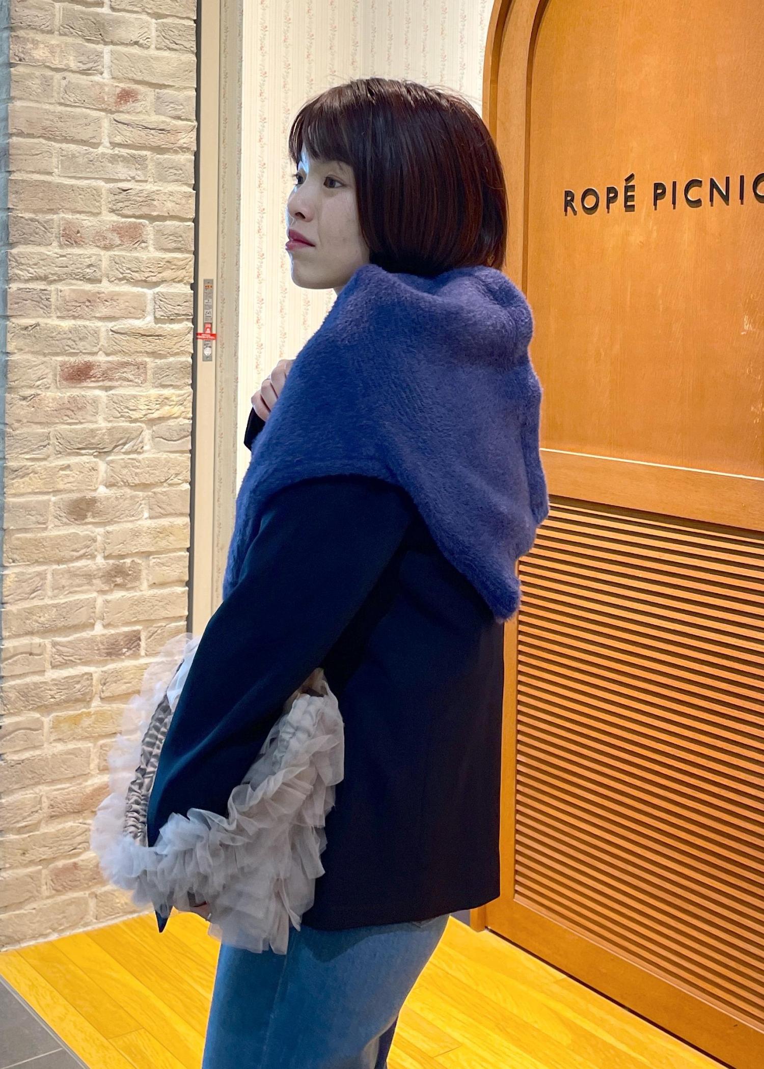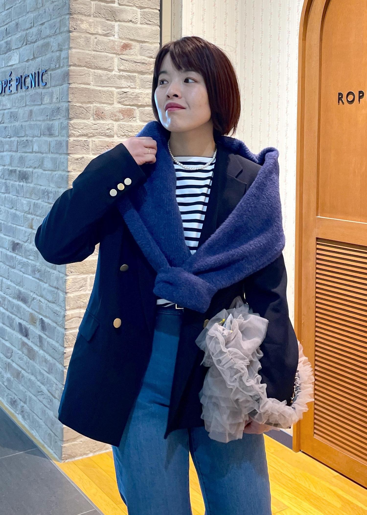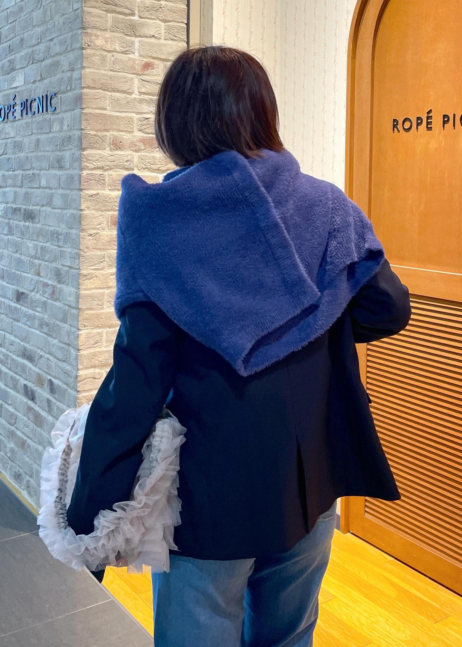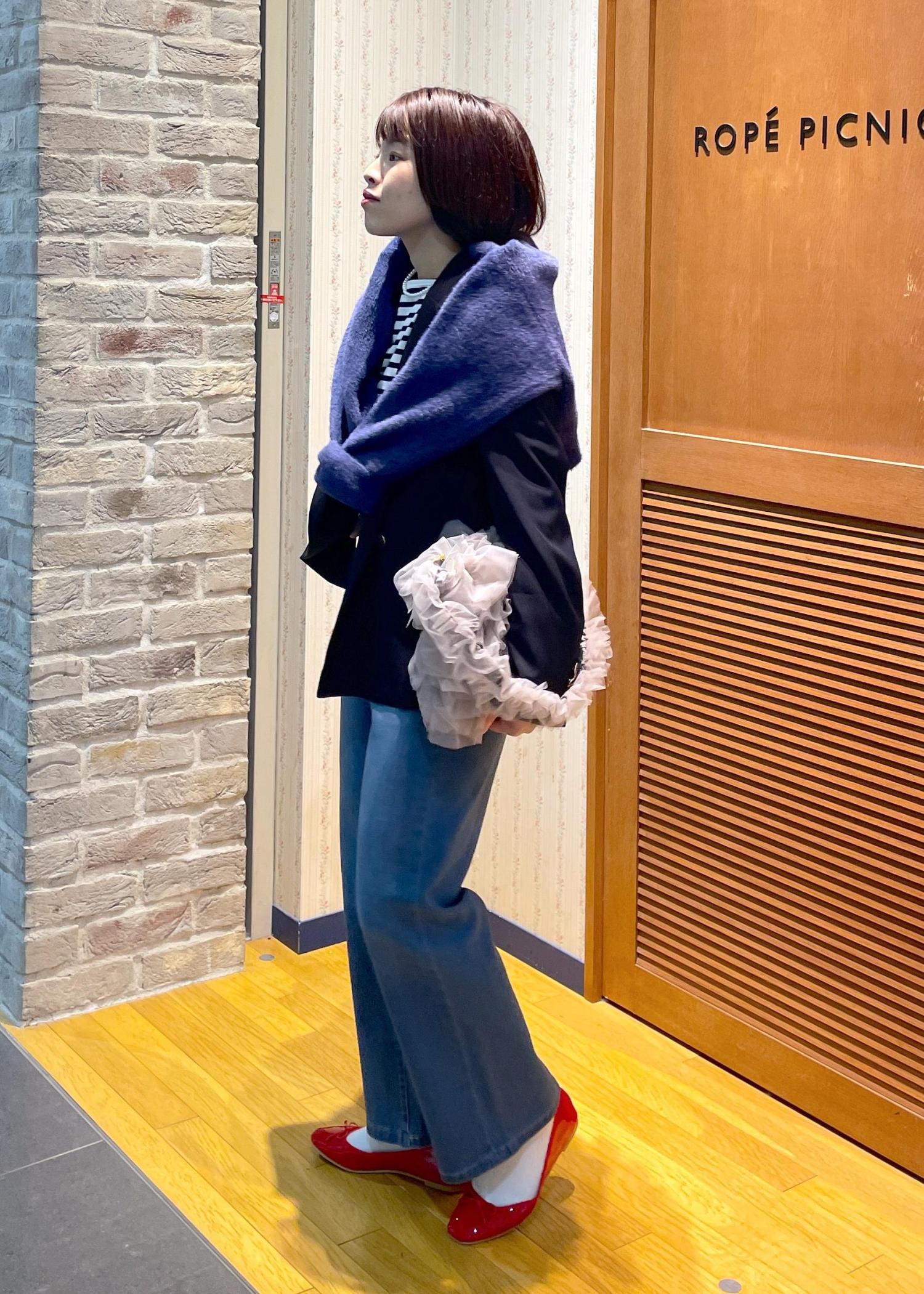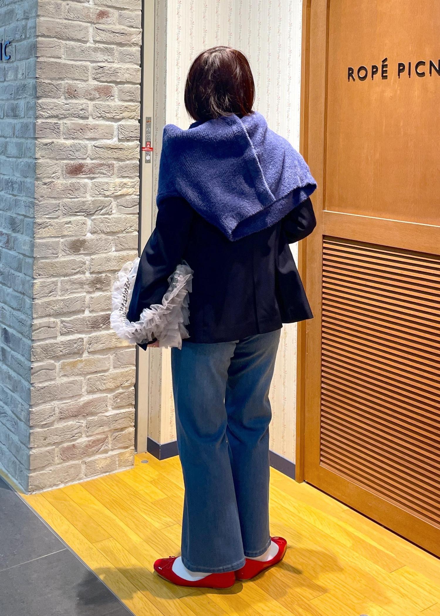 シンプルなスタイルだったので、フェザーニットカーディガンを肩掛けしてコーディネートに立体感を◎