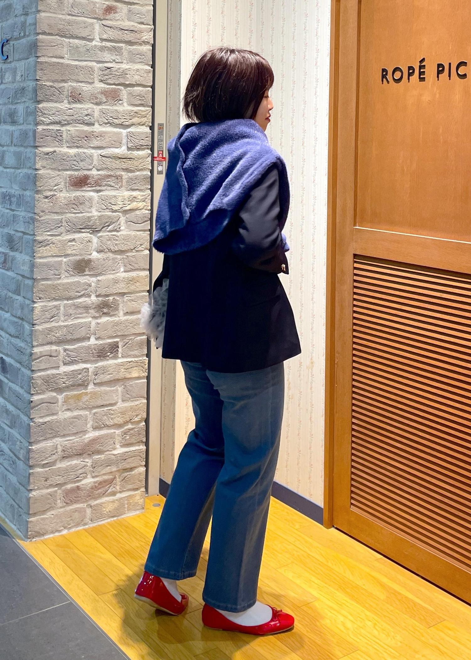 足元の赤のバレエシューズはベーシックなカラー合わせのアクセントに取り入れてみました!