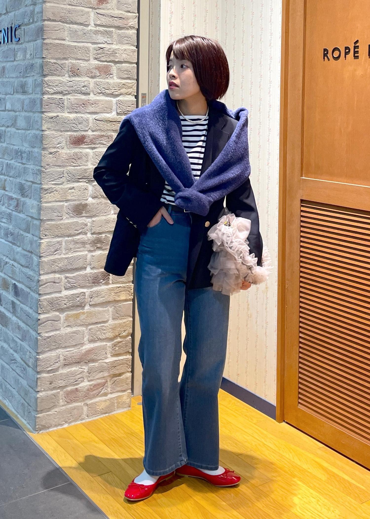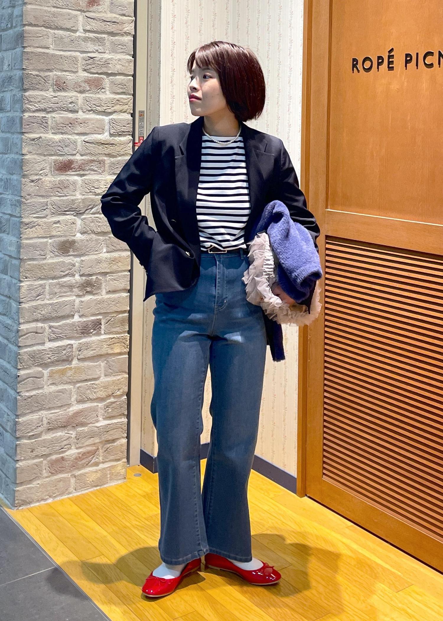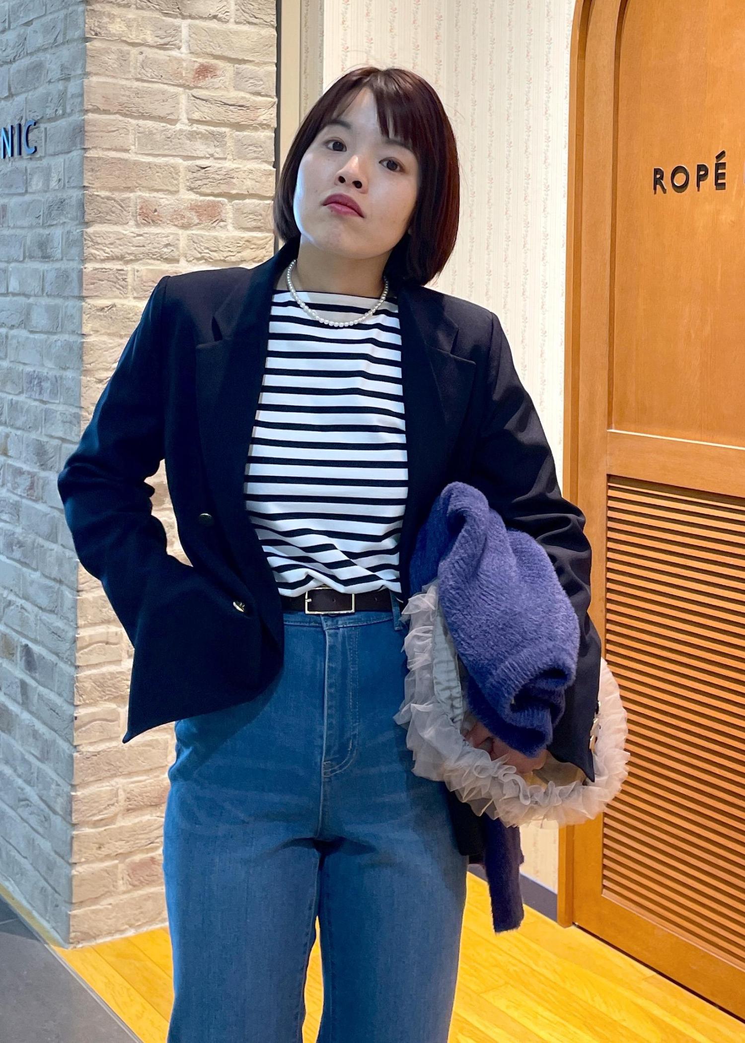 ジャケットにボーダートップスとデニムを合わせた、カジュアルダウンしたお出かけコーデです!