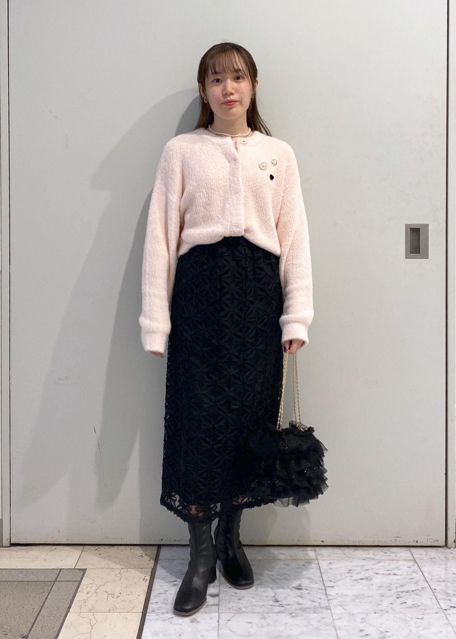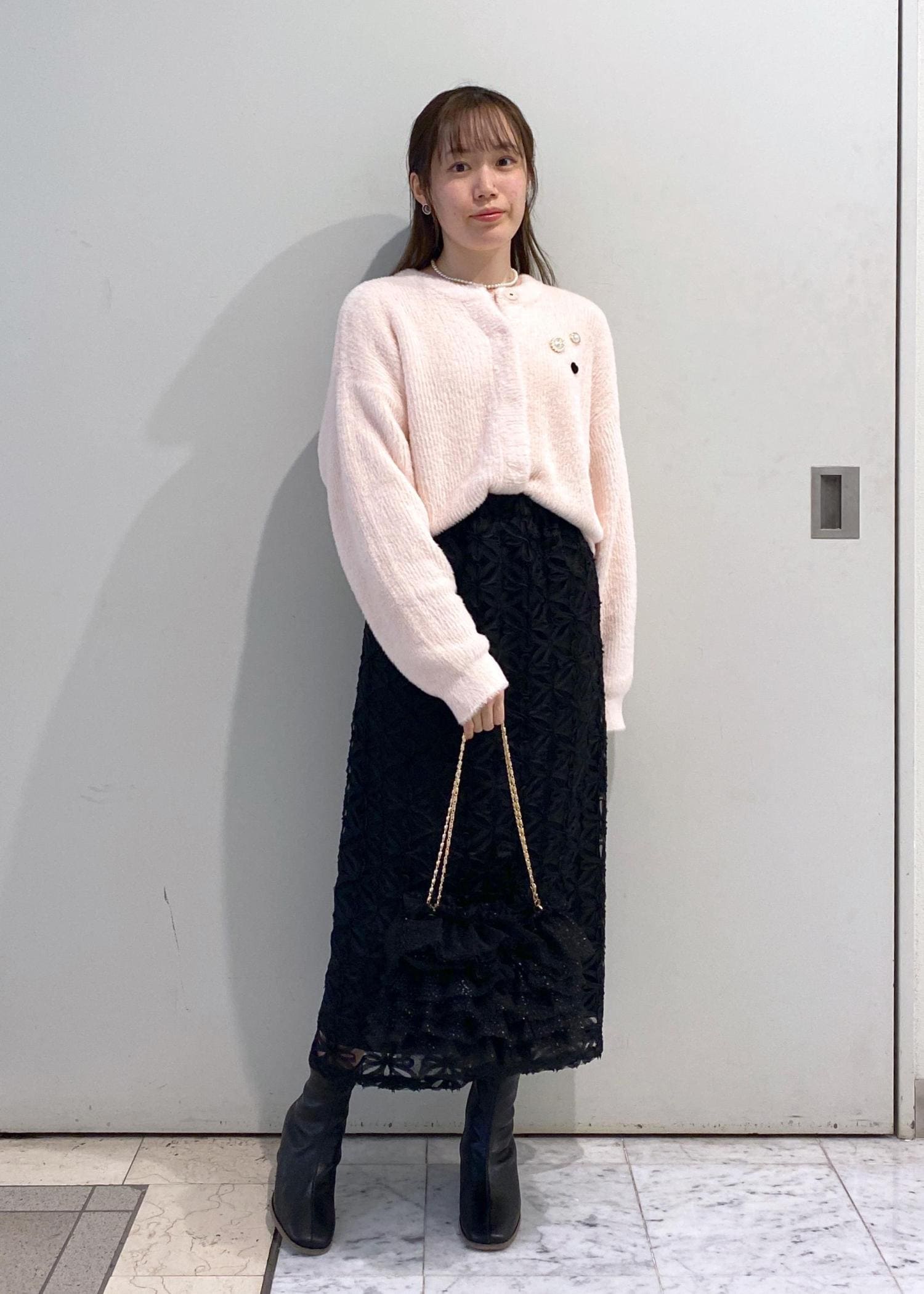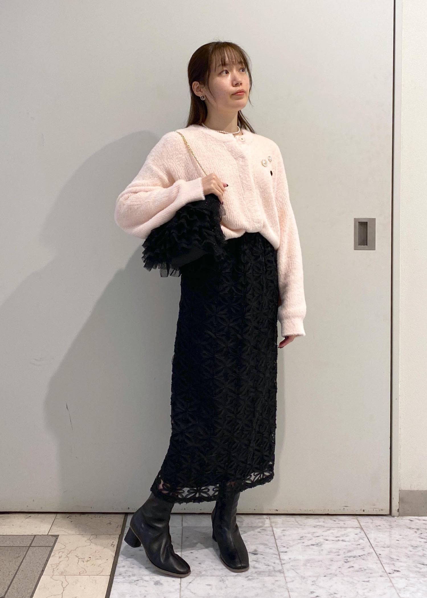 カーディガンのピンクを差し色にして、甘めのコーディネートに仕上げました。