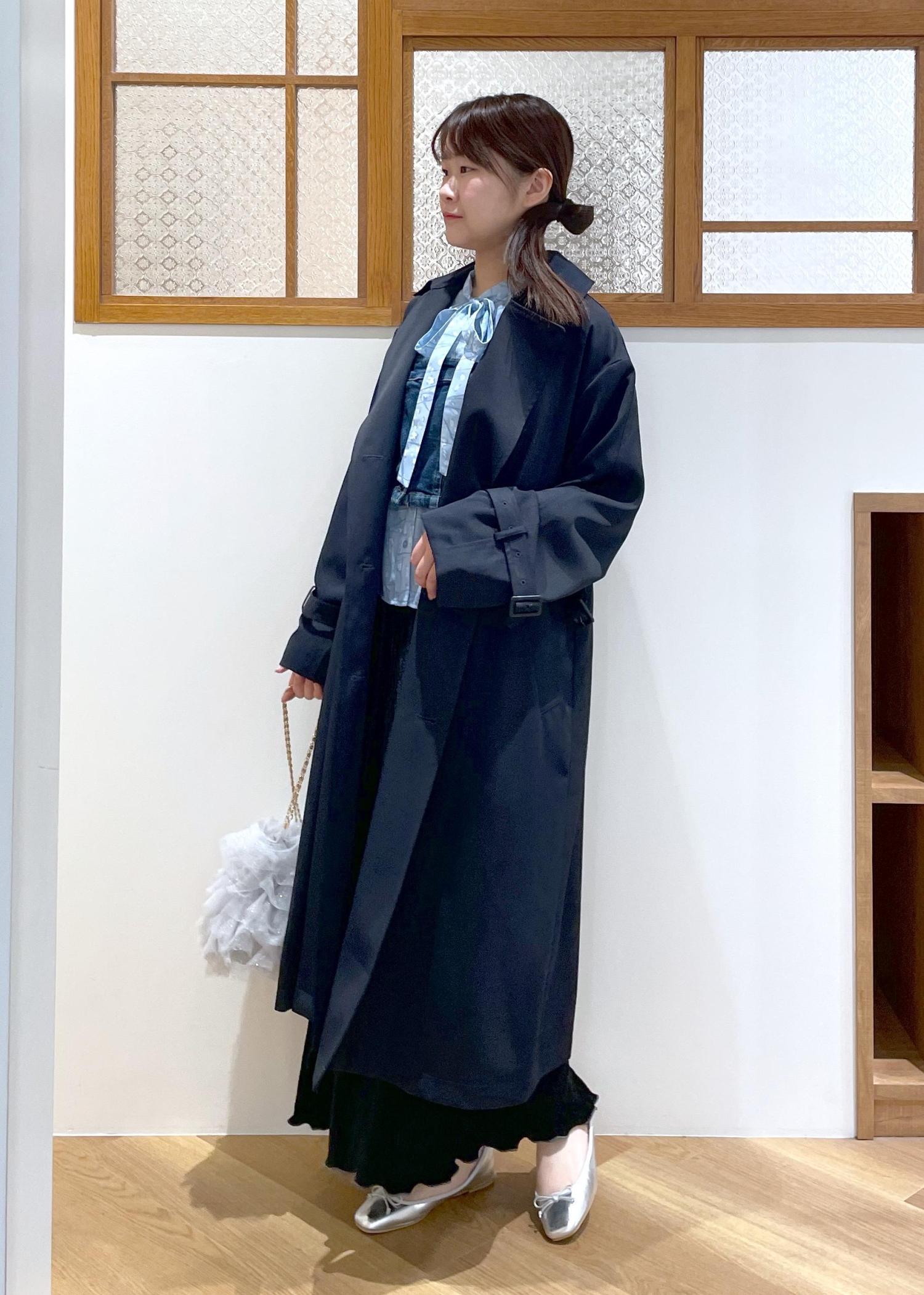 ブラウスにビスチェをレイヤードし、その上からトレンチコートを羽織ることで旬のレイヤードコーデを意識。