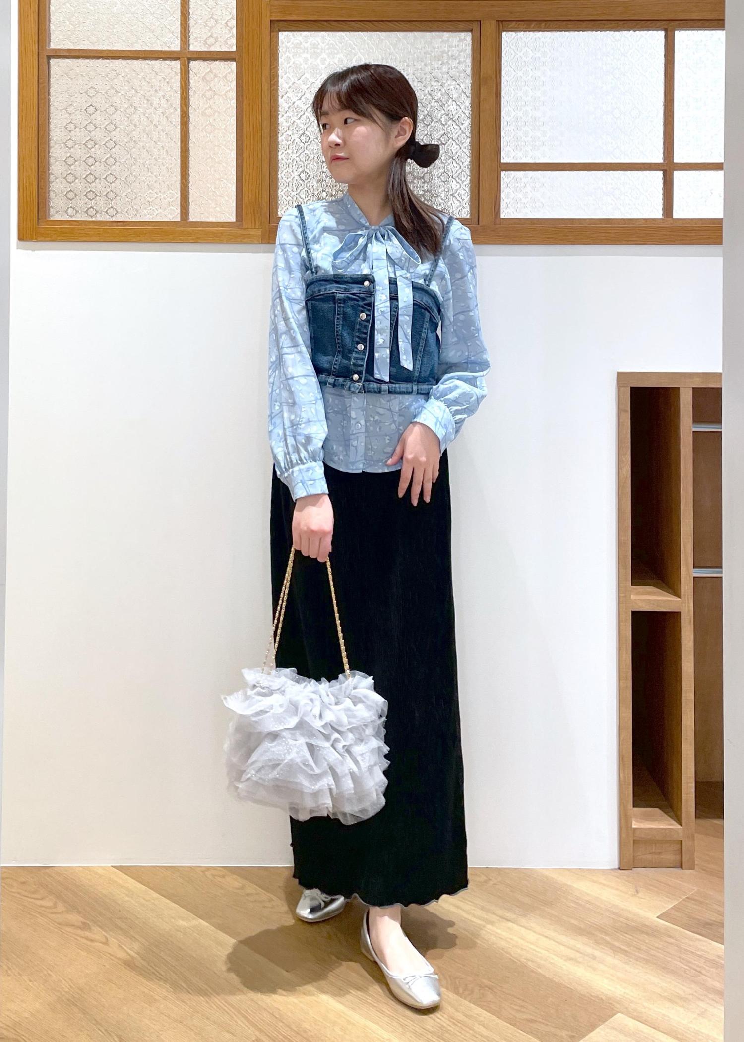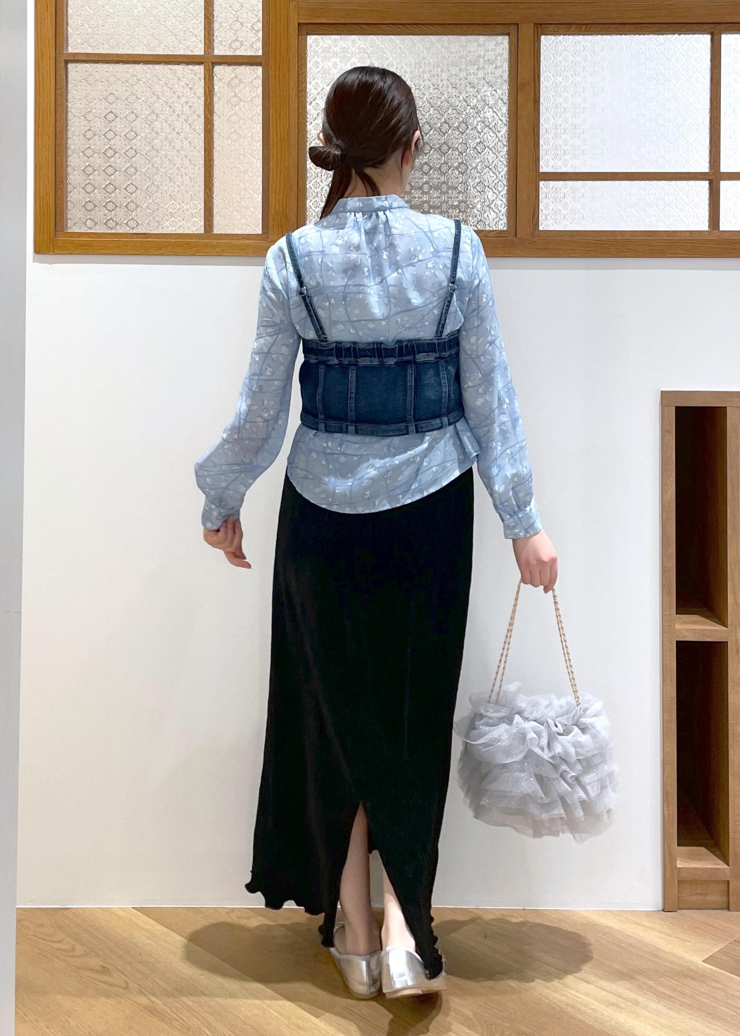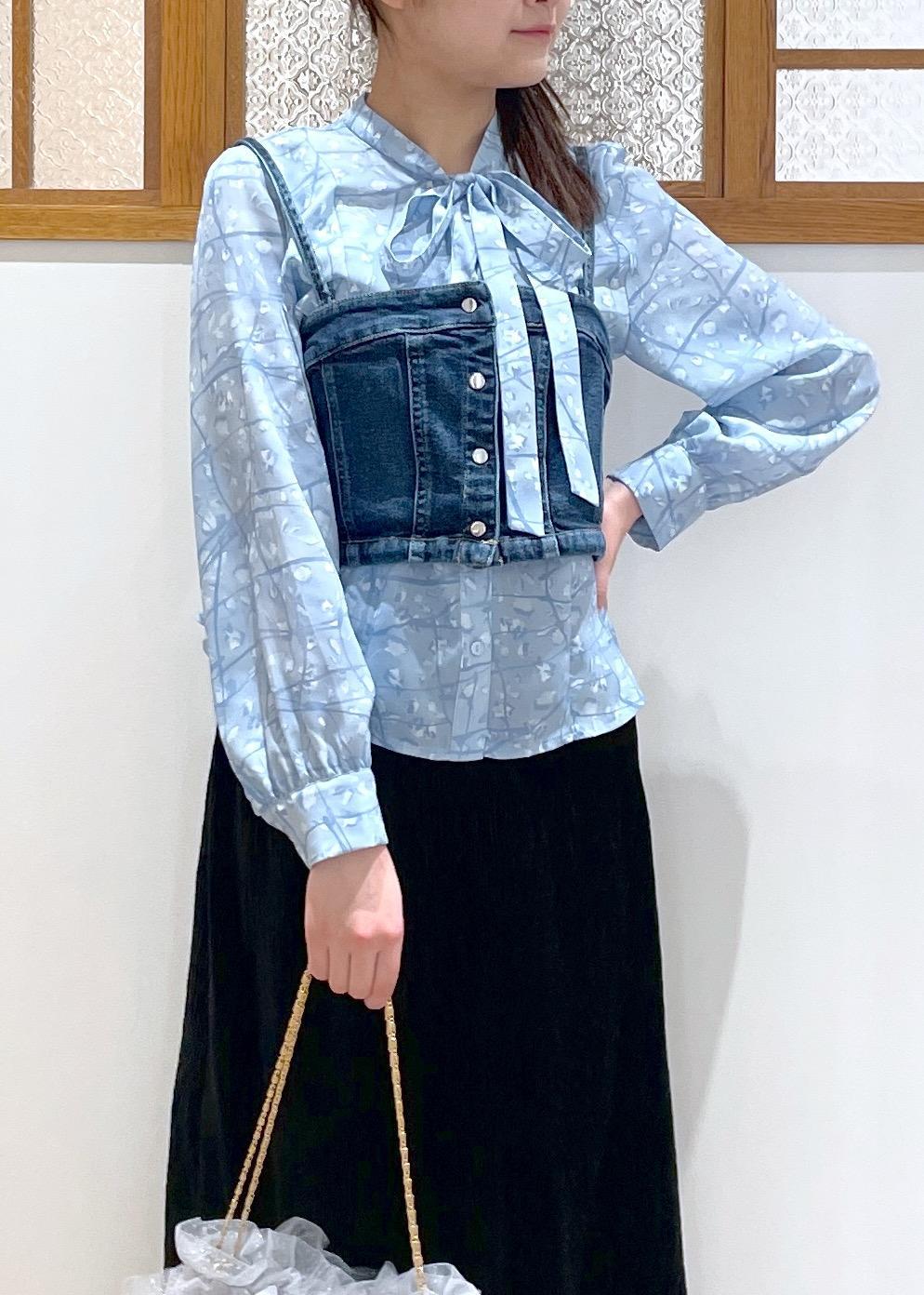 柄ブラウス×デニムビスチェでお洒落上級者を狙いました。