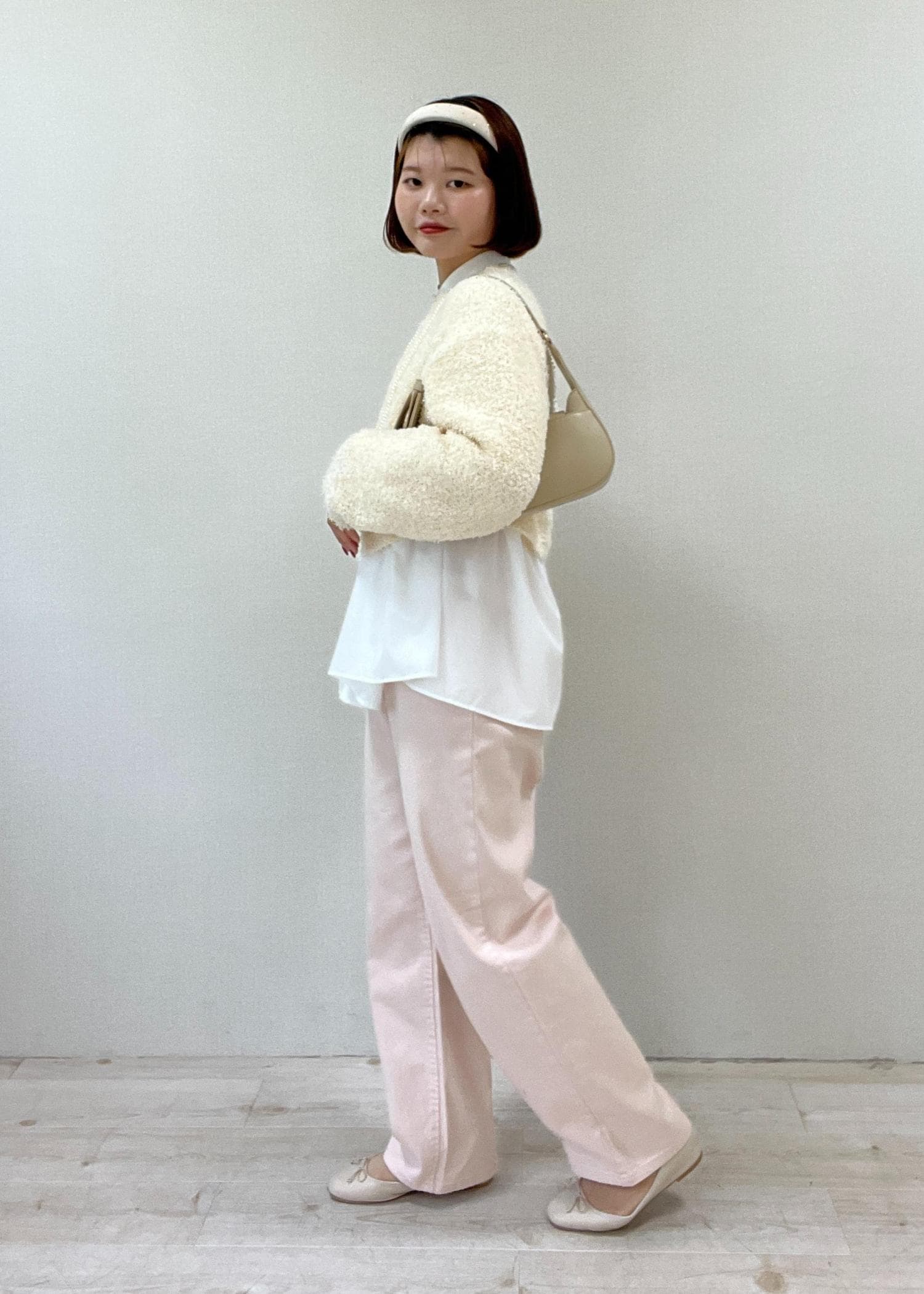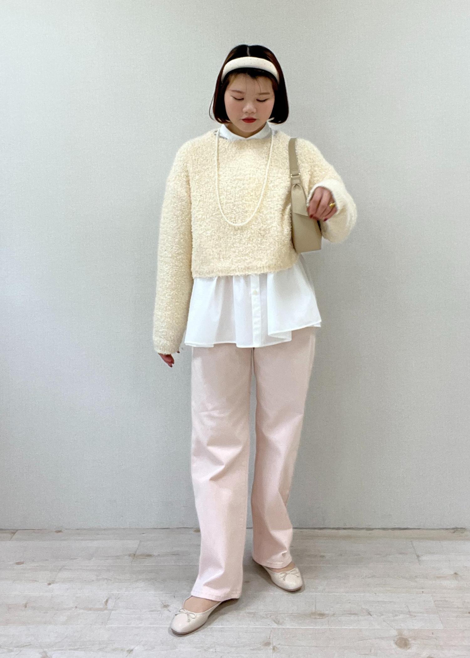 デニムが引き立つように他アイテムは馴染みやすいキナリ系で揃えましたが、パールネックレスやカチューシャを合わせて華やかさも取り入れたコーディネートにしました!
