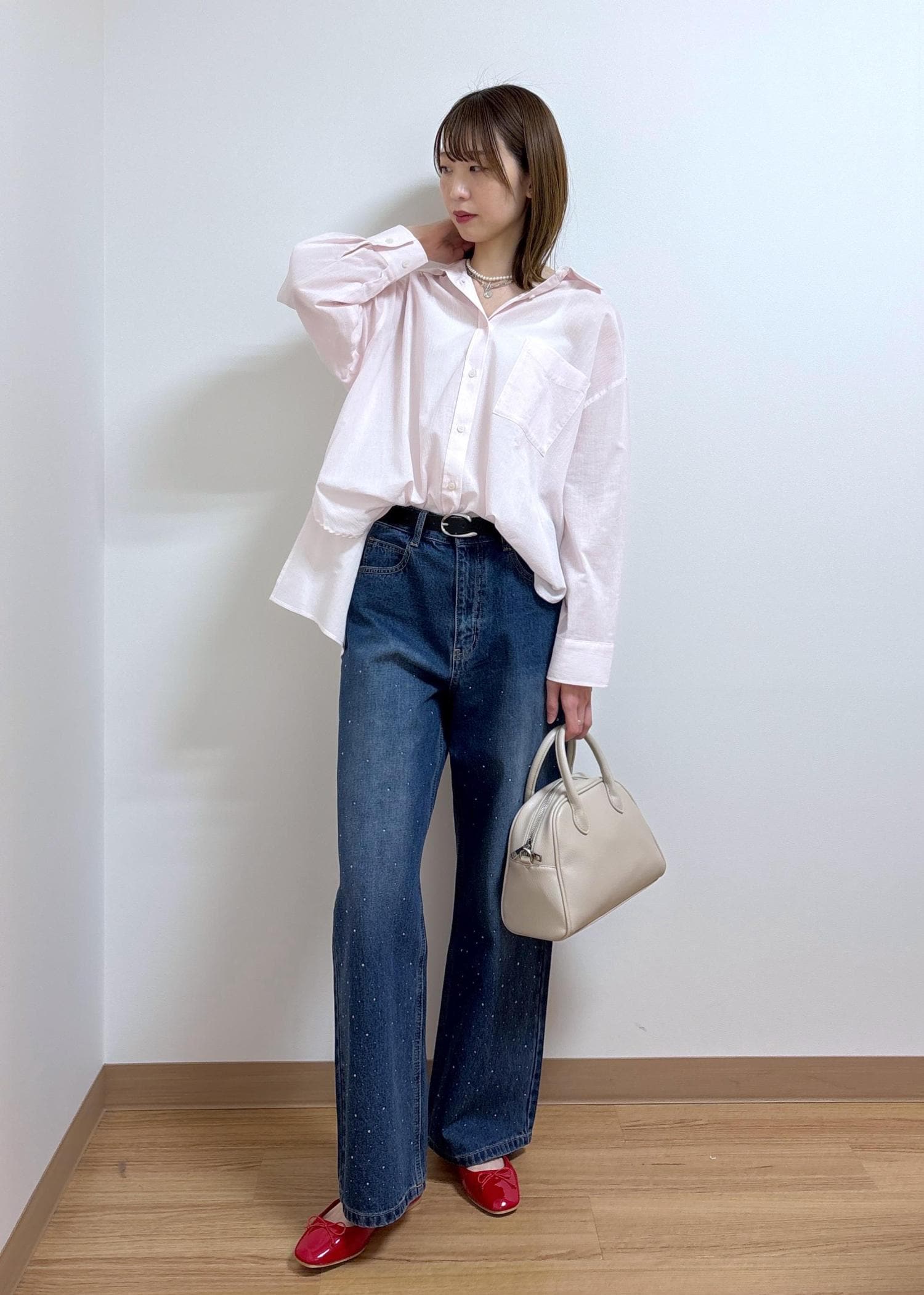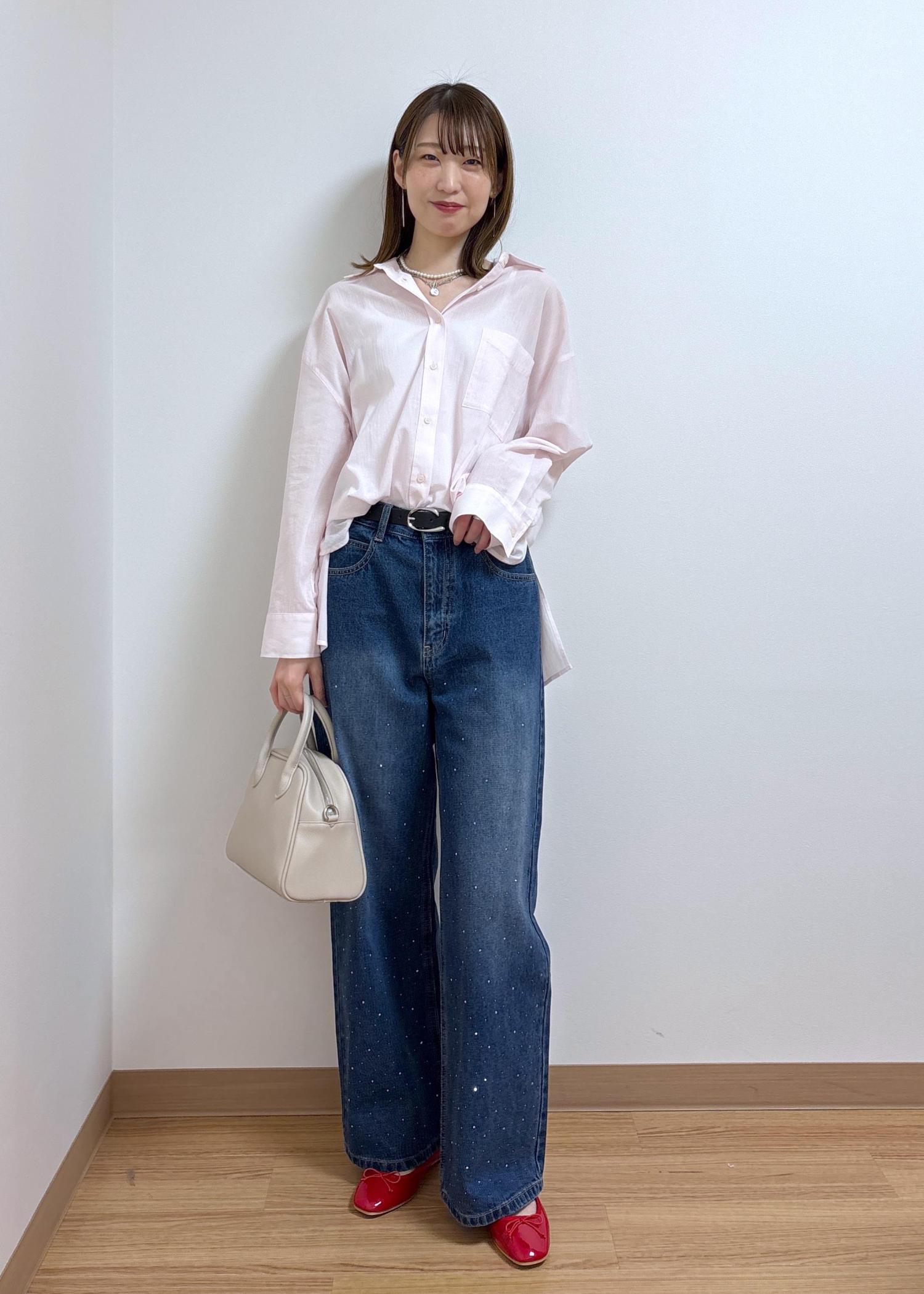着用しているデニムは、 前面にビジューがあしらわれているので、シンプルなトップスを合わせても華やかな印象になります。