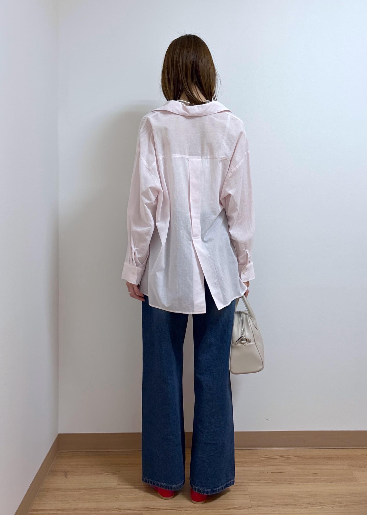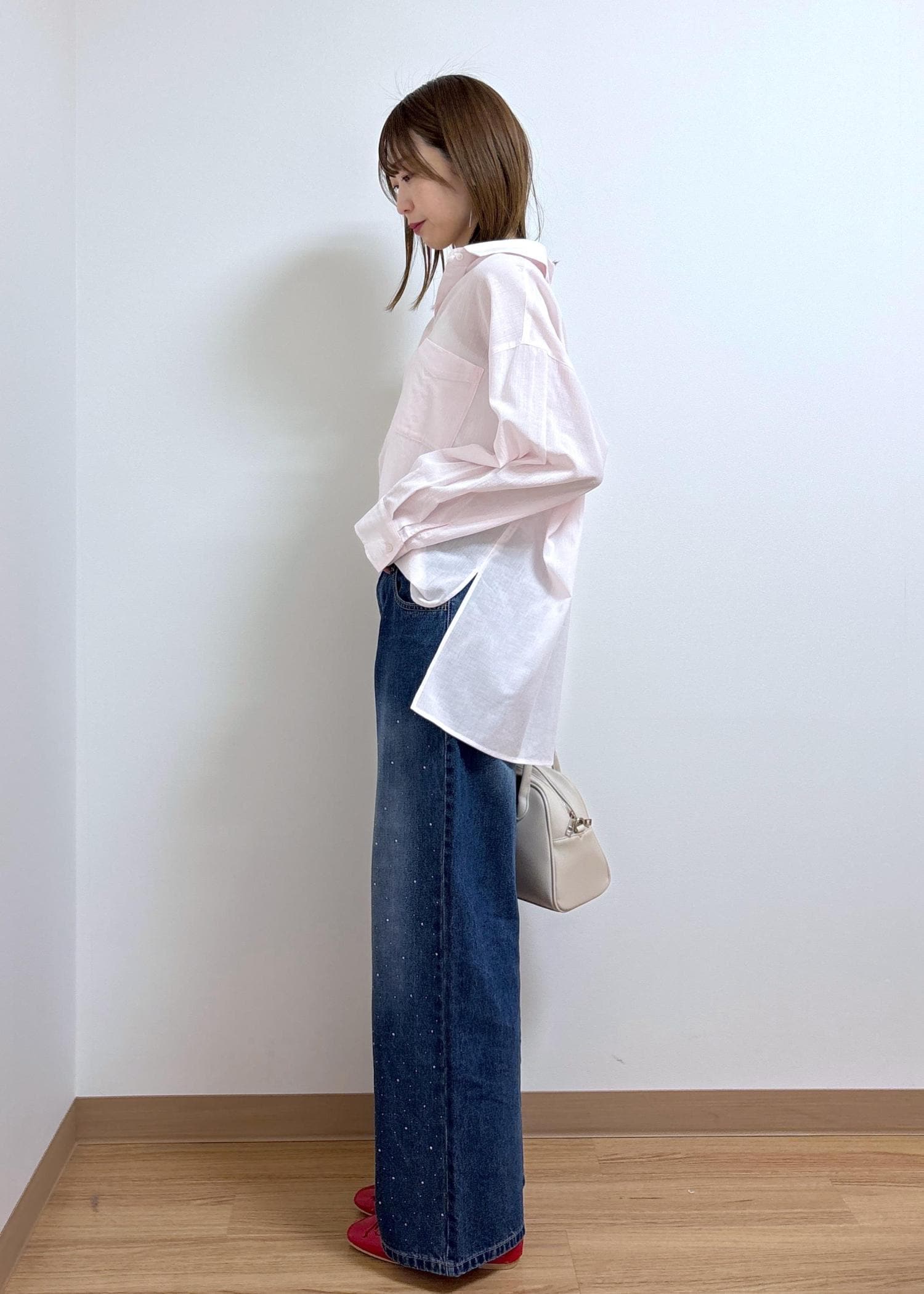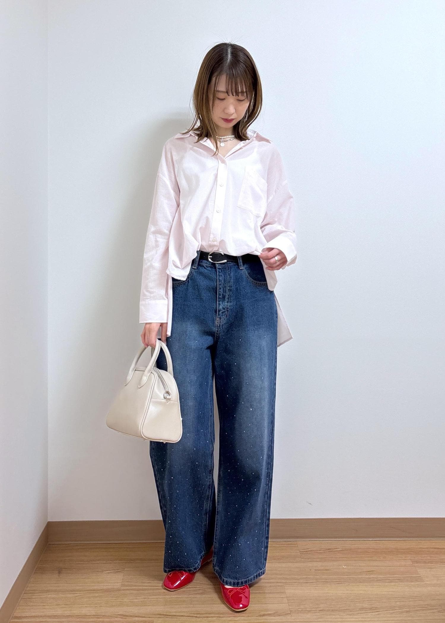 淡いピンクに濃紺デニムを合わせた、春らしい大人カジュアルなスタイリングです。