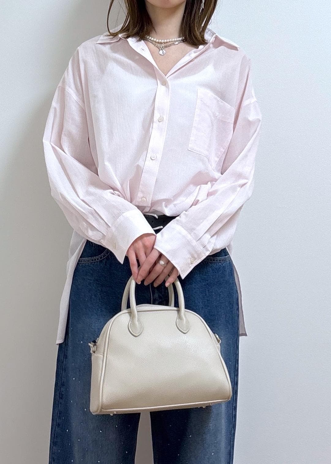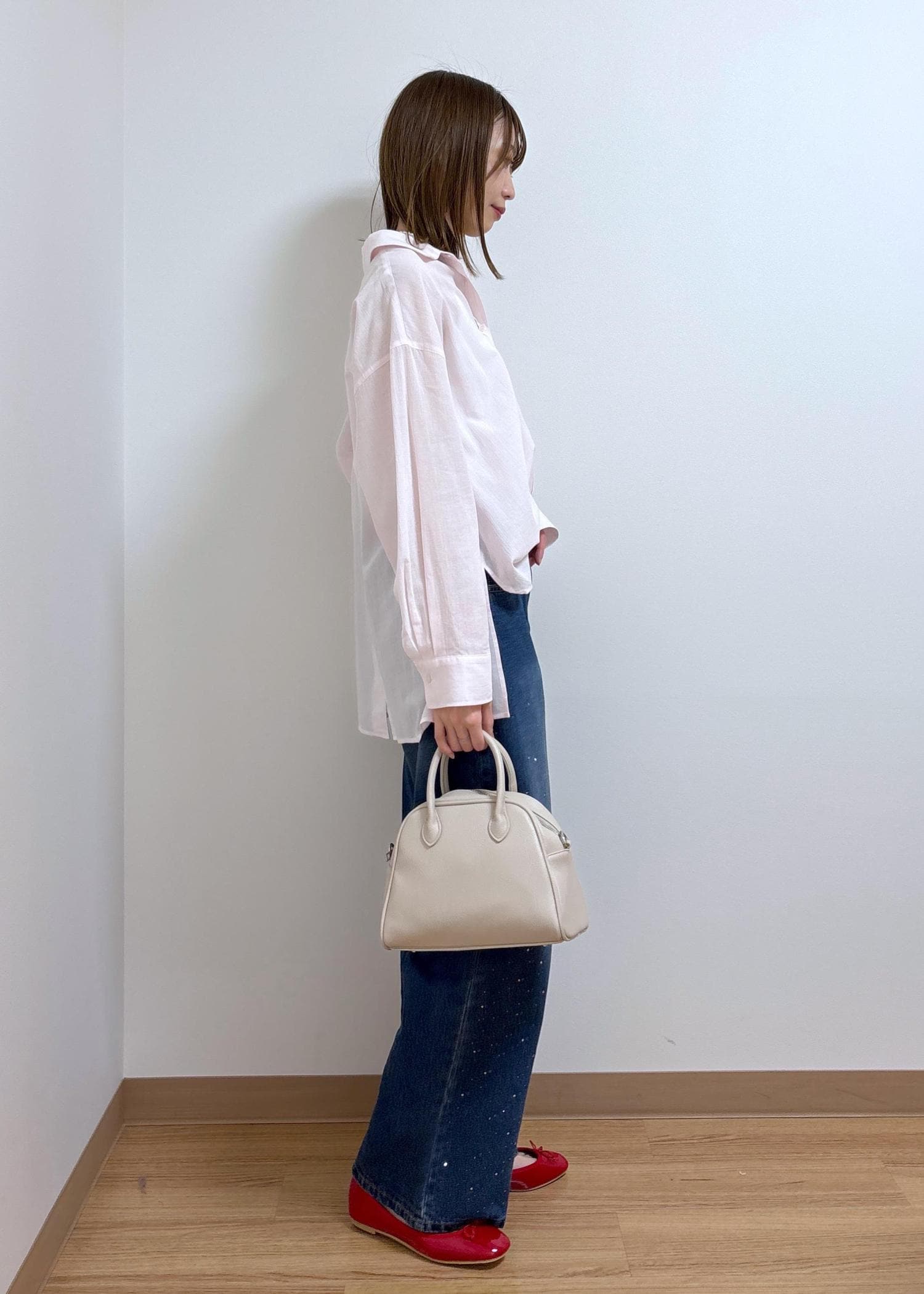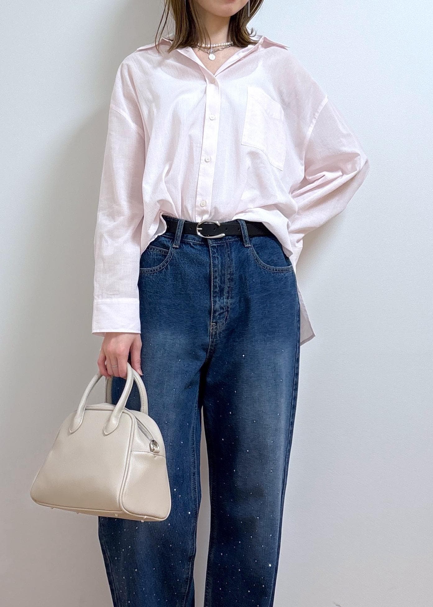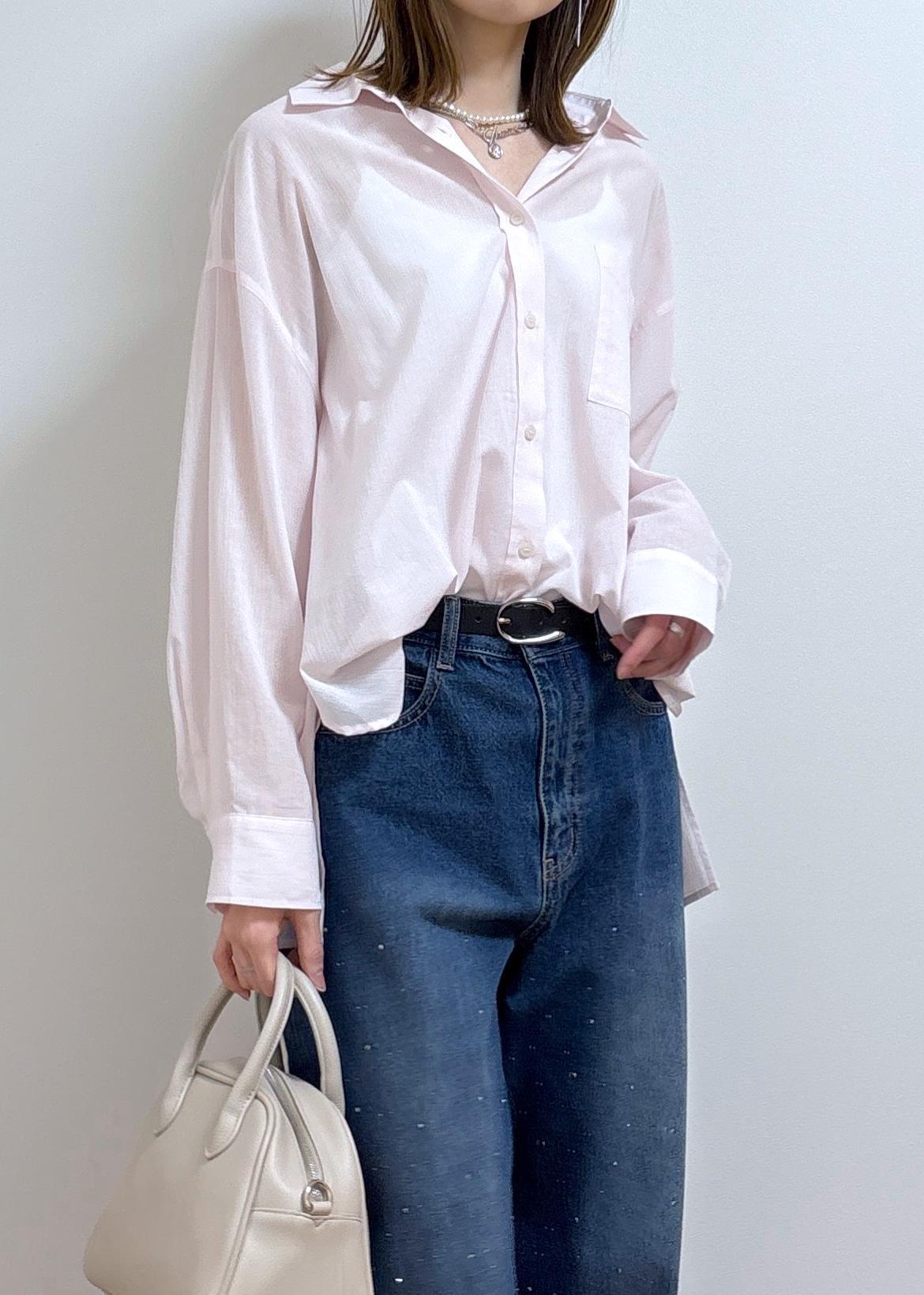淡いピンクに濃紺デニムを合わせた、春らしい大人カジュアルなスタイリングです。