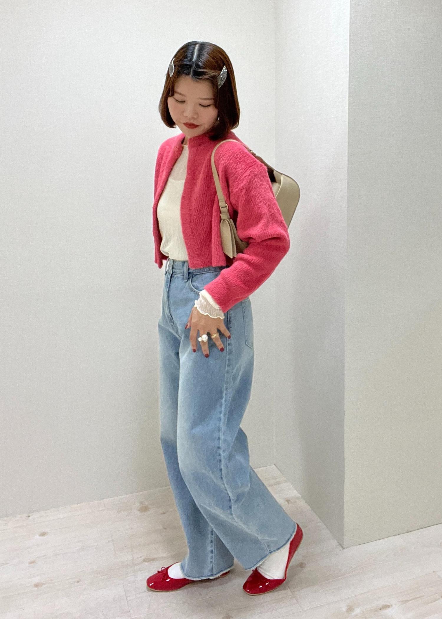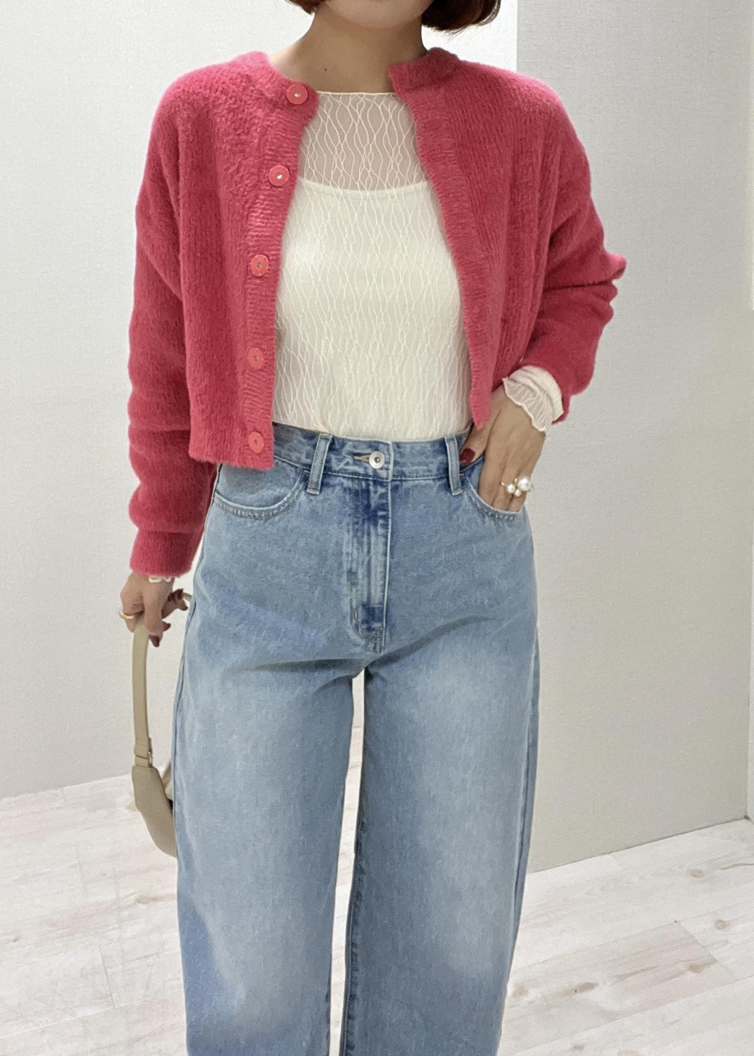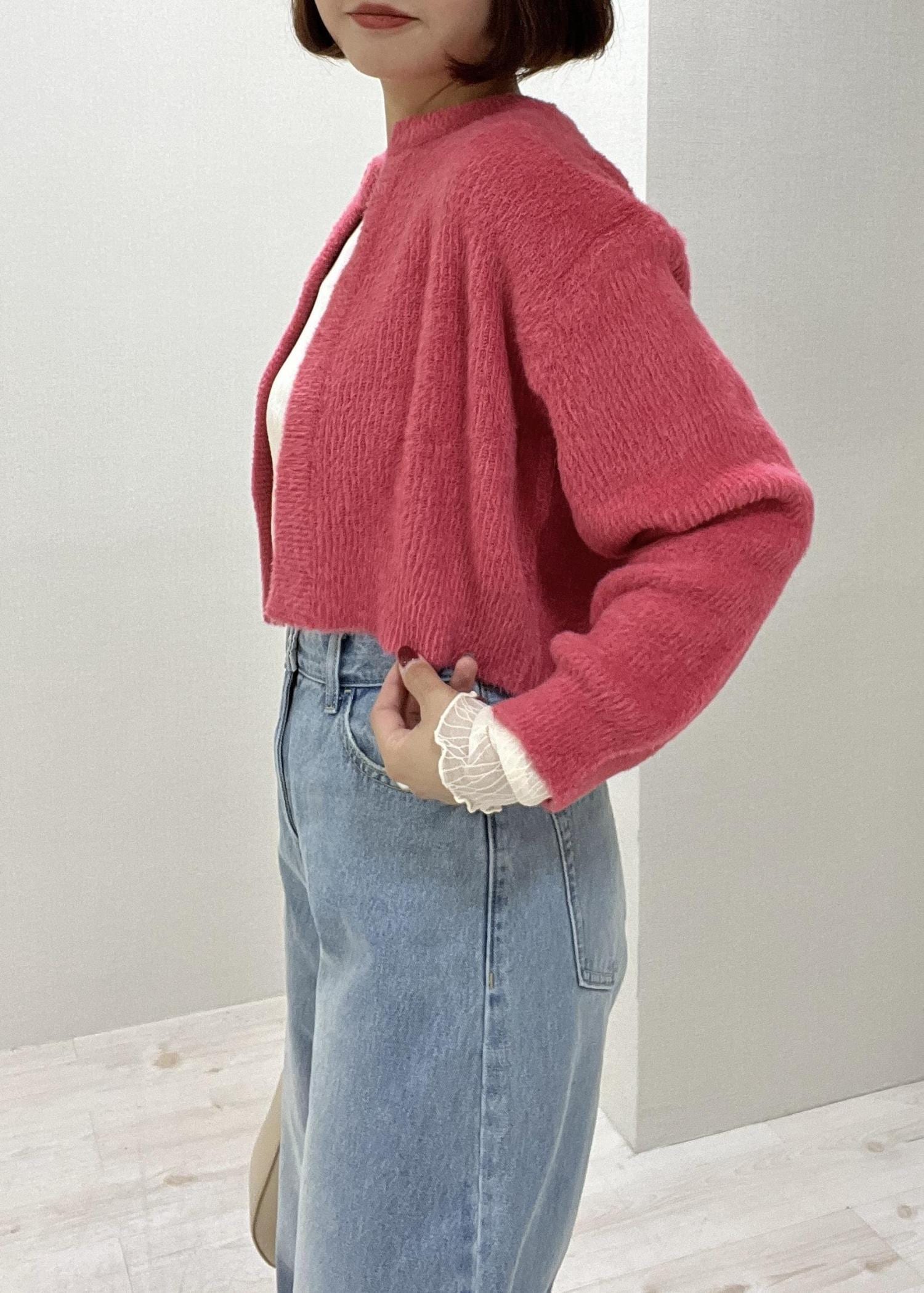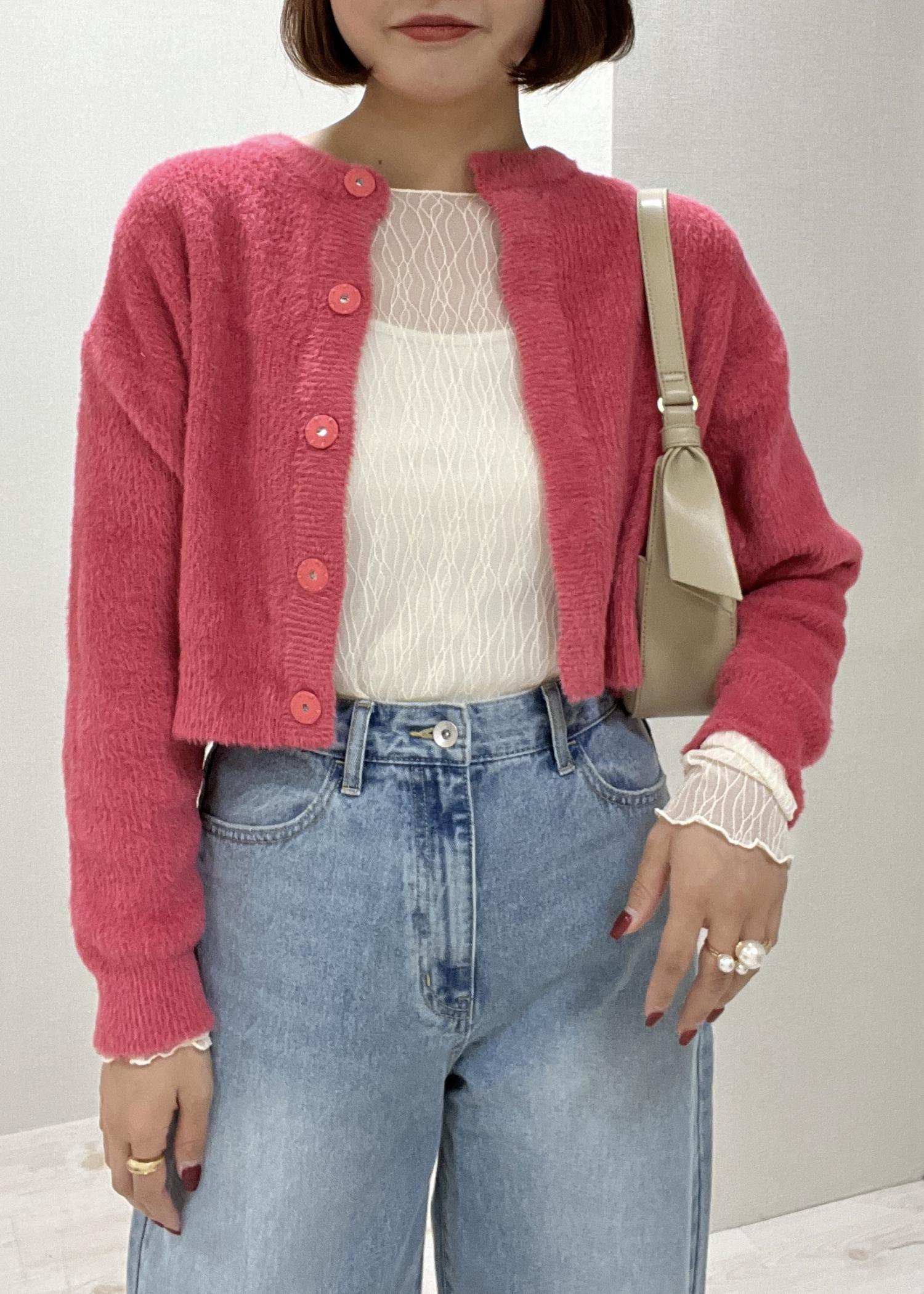 濃いめのピンクがパッと目を惹く着映え抜群なカーディガン。