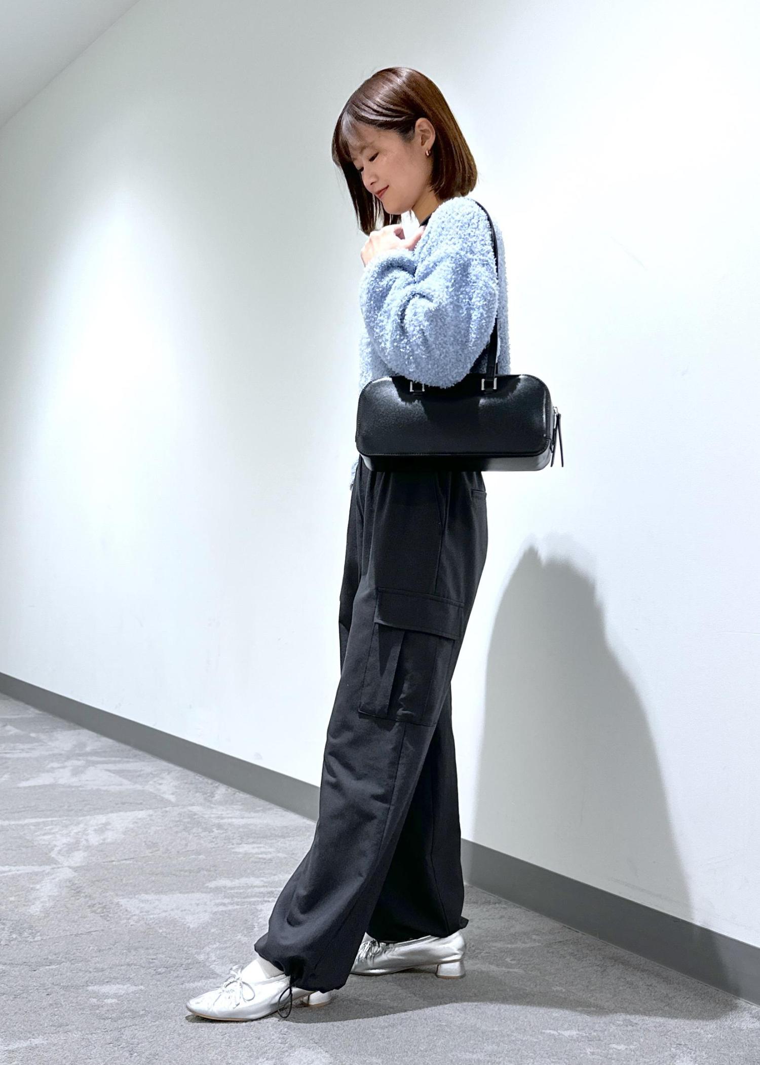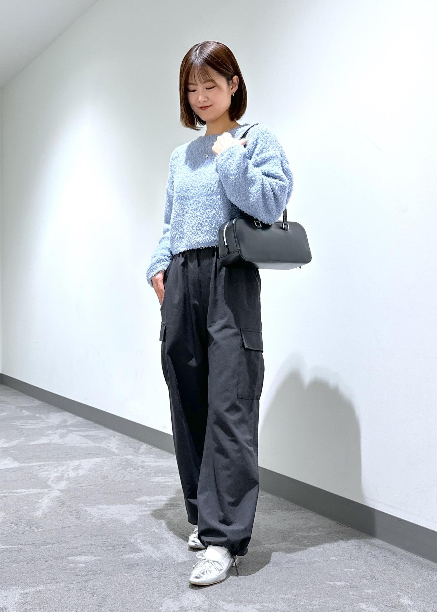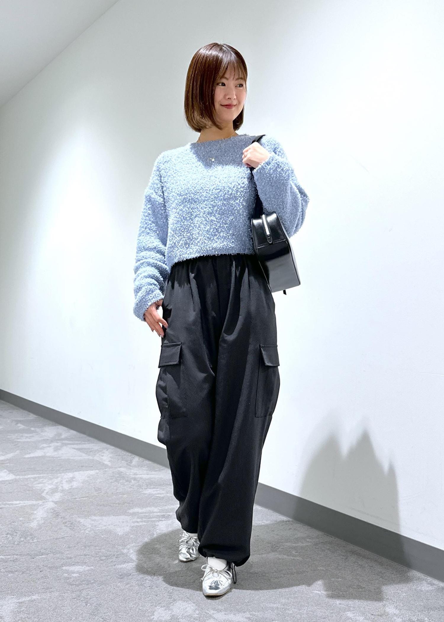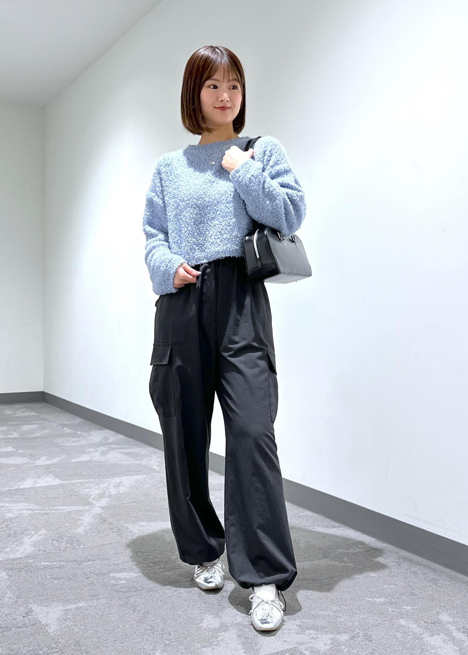 春らしいカラーのリボンヤーンニットにカーゴパンツを合わせました。足元をパンプスにすることでカジュアルになりすぎず女性らしい印象になります。