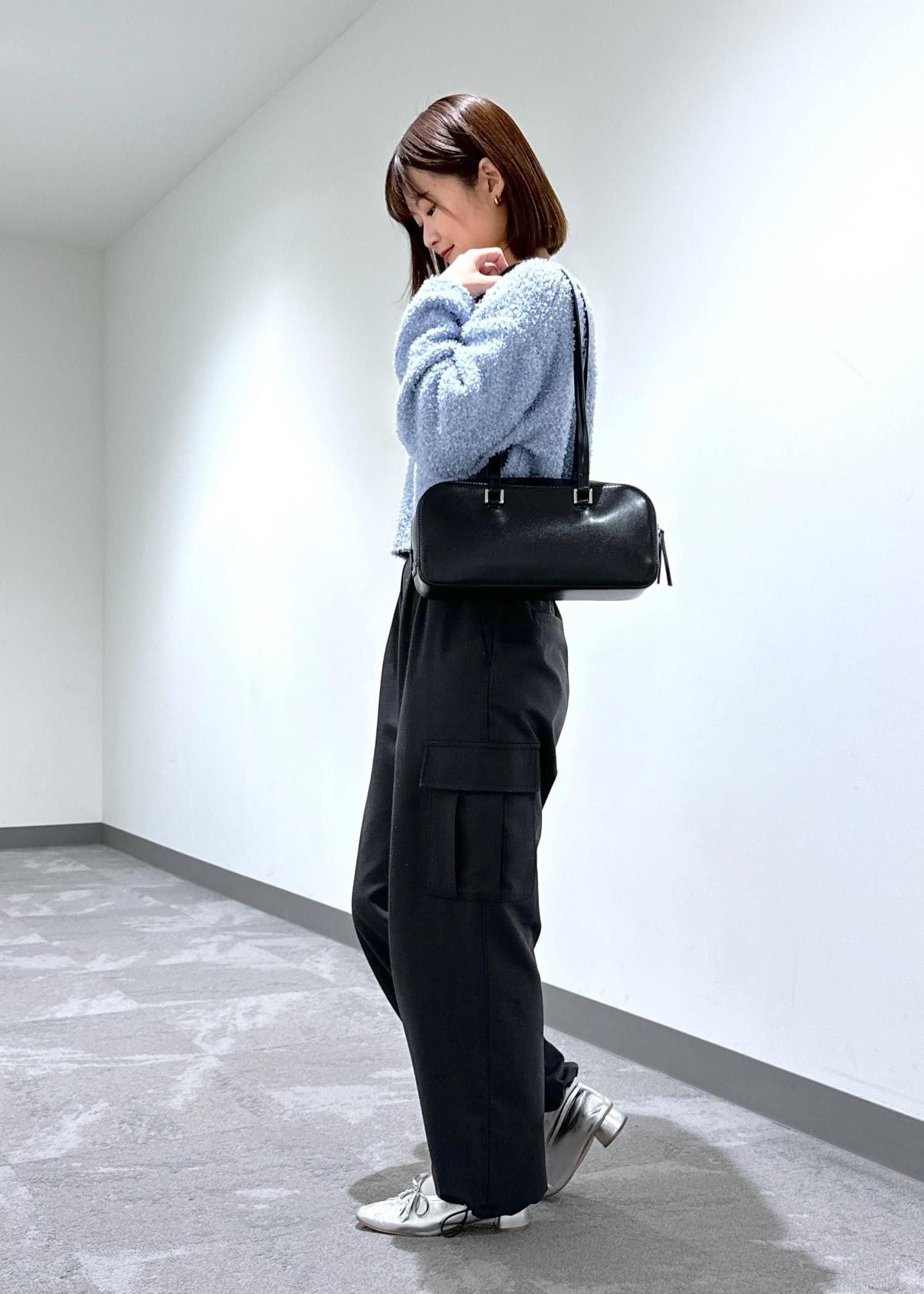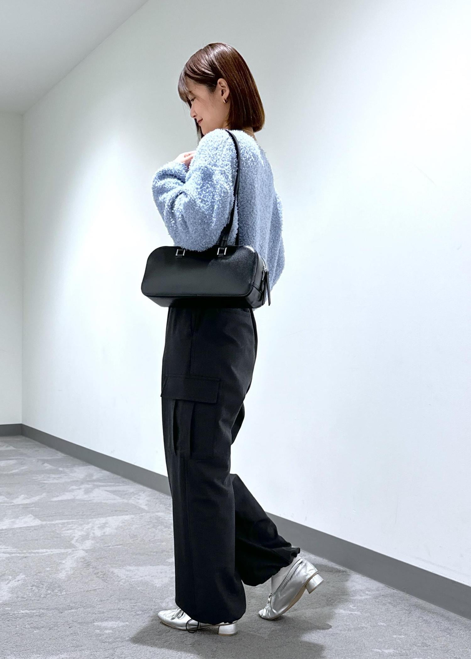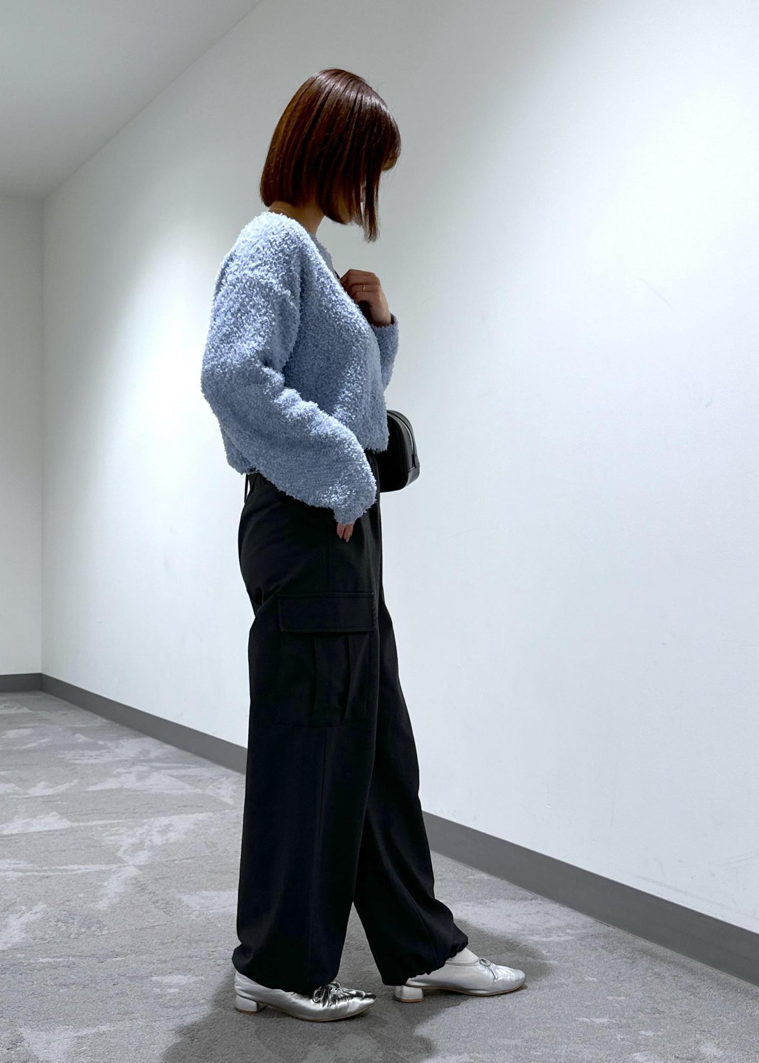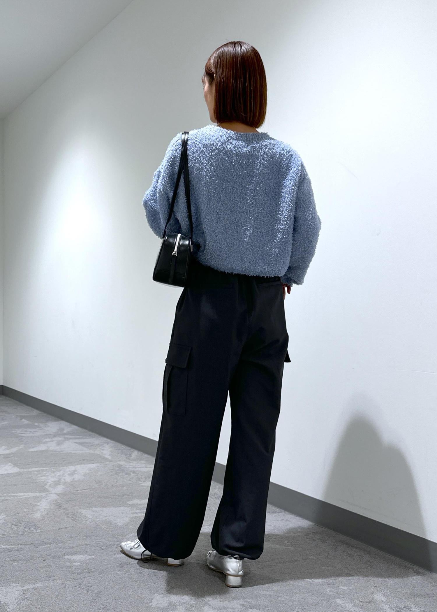 春らしいカラーのリボンヤーンニットにカーゴパンツを合わせました。足元をパンプスにすることでカジュアルになりすぎず女性らしい印象になります。