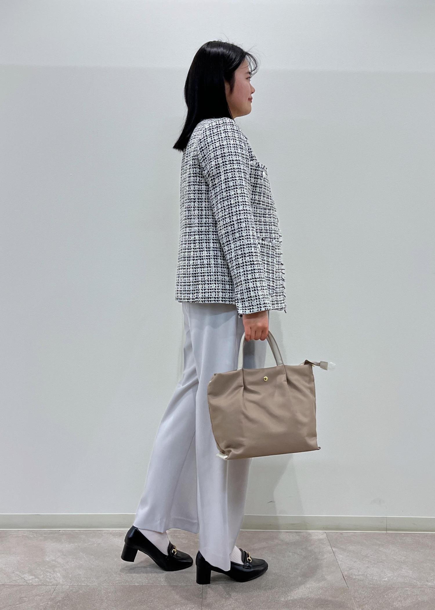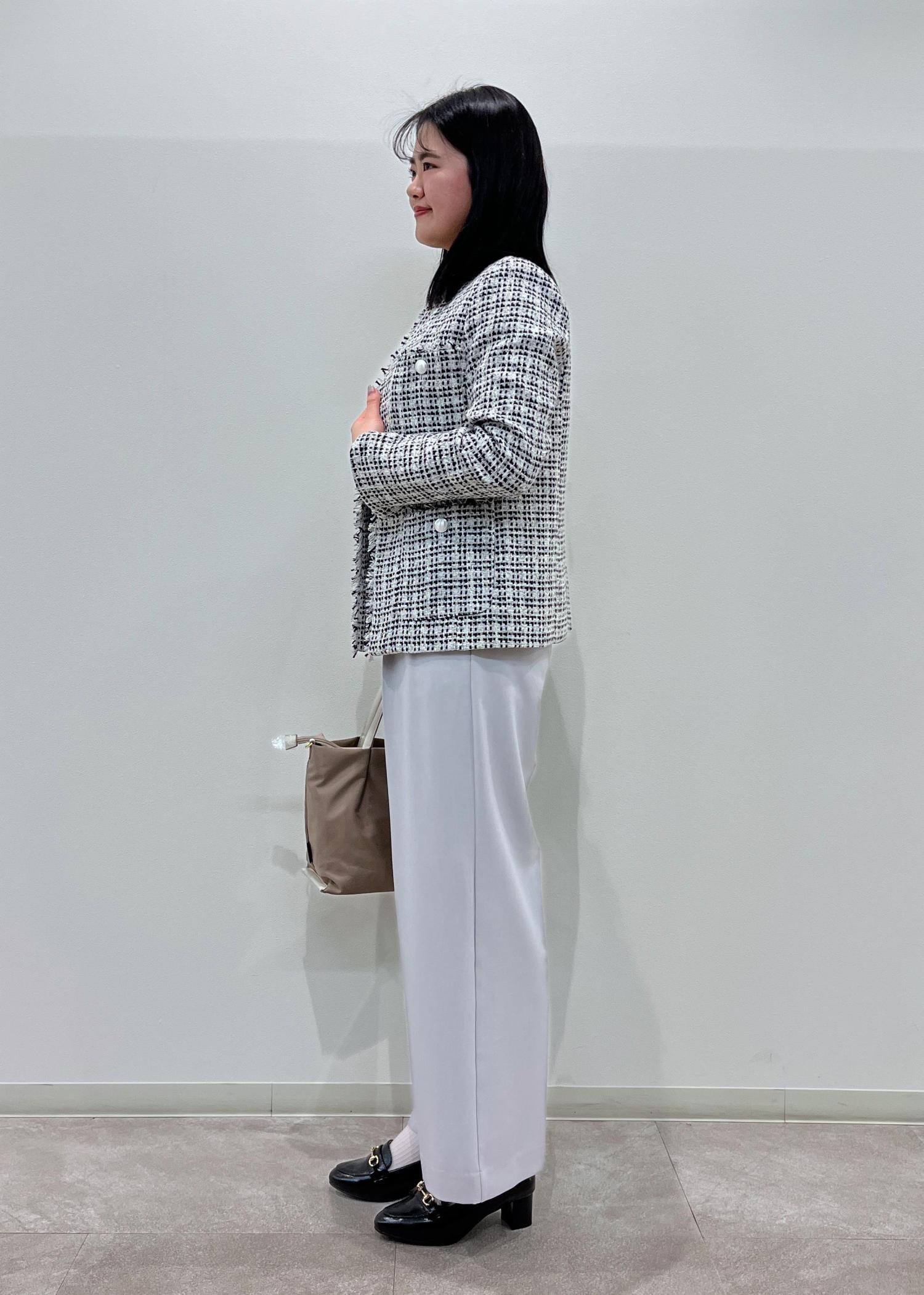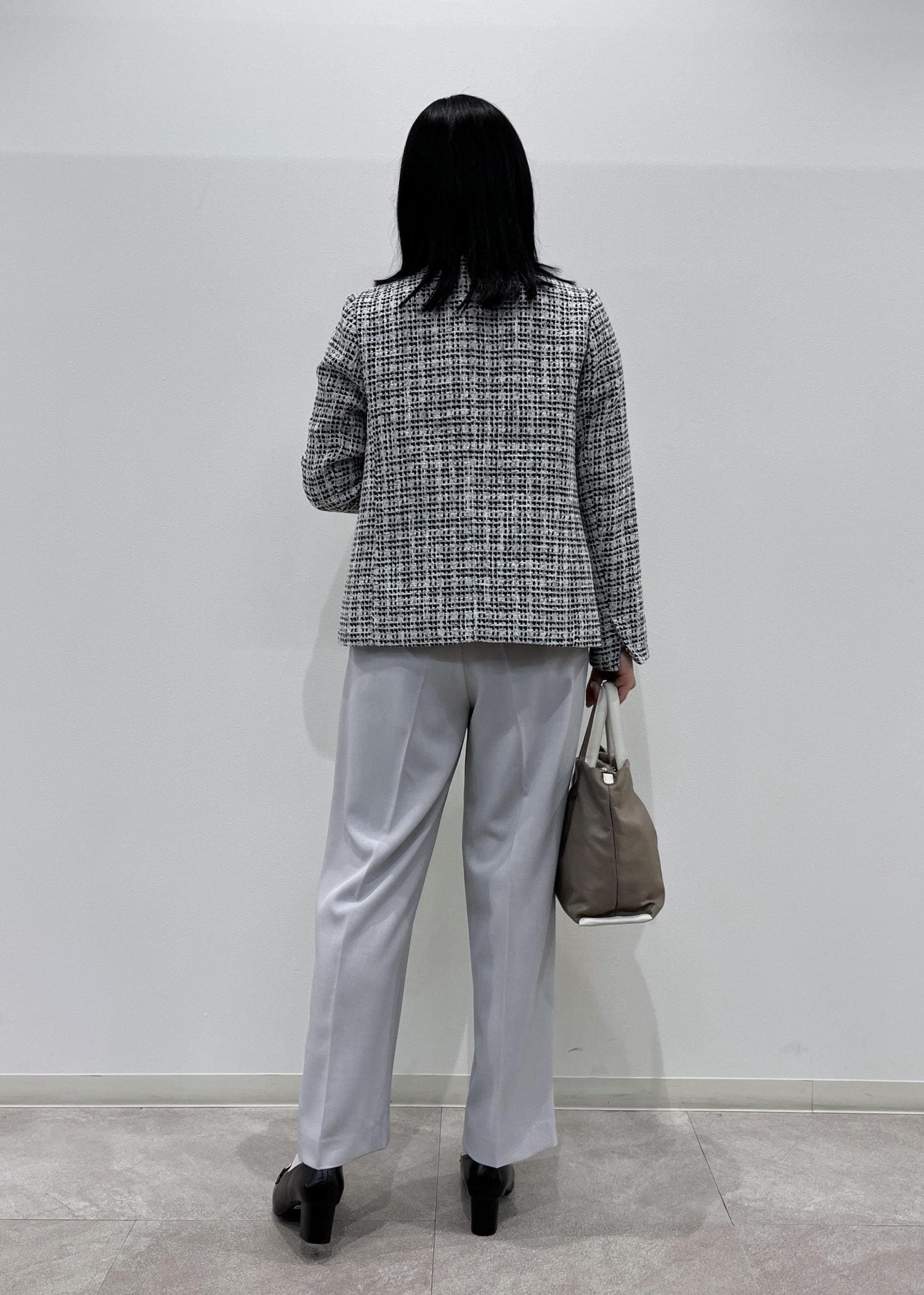 ライン入りニット×ストレートパンツ×ツイードジャケット